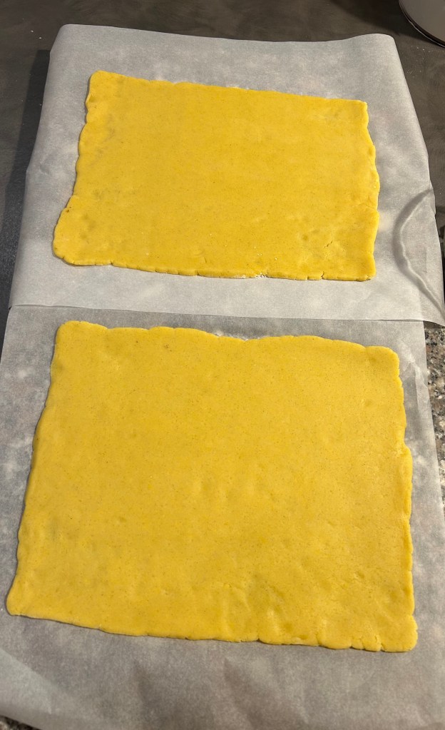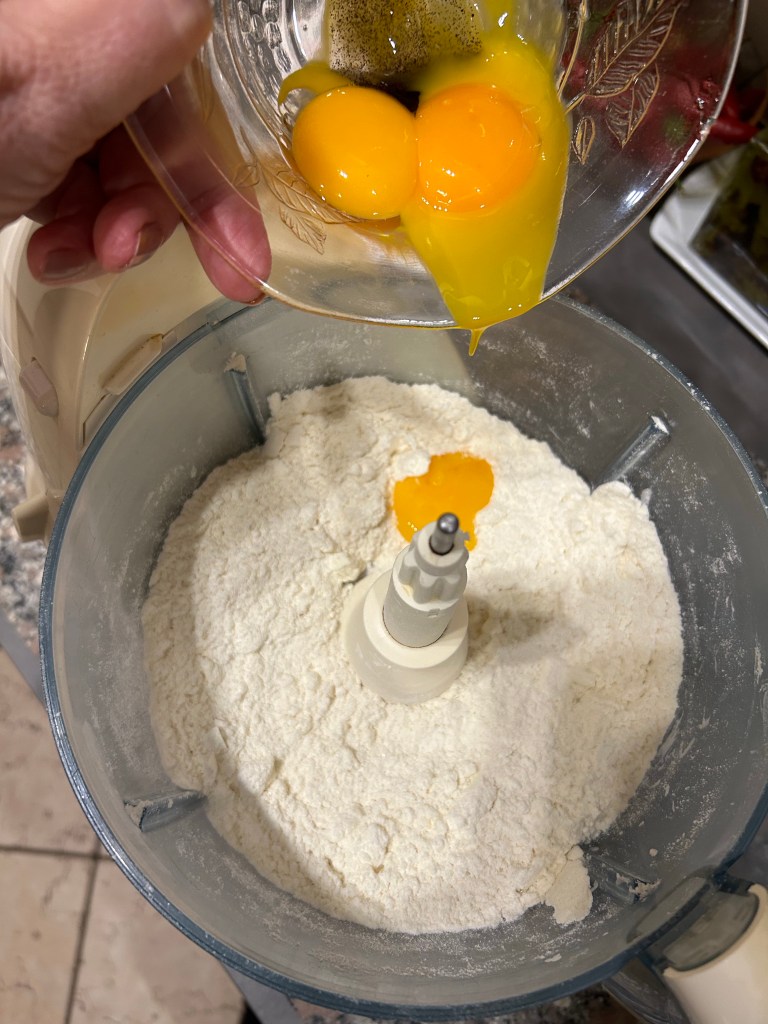 Trascorso il riposo ammorbidisco velocemente l’impatto e lo stendo con il matterello ad uno spessore di 3/4 mm