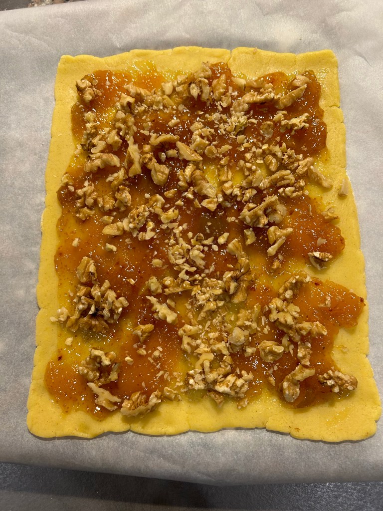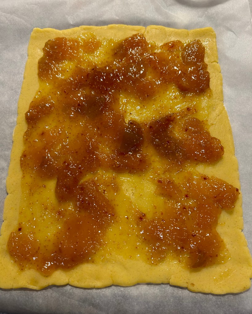 Dispongo i biscotti sopra una teglia ricoperta di carta forno, in quelli che voglio farcire pratico un foro al centro, i ritagli li impasto nuovamente