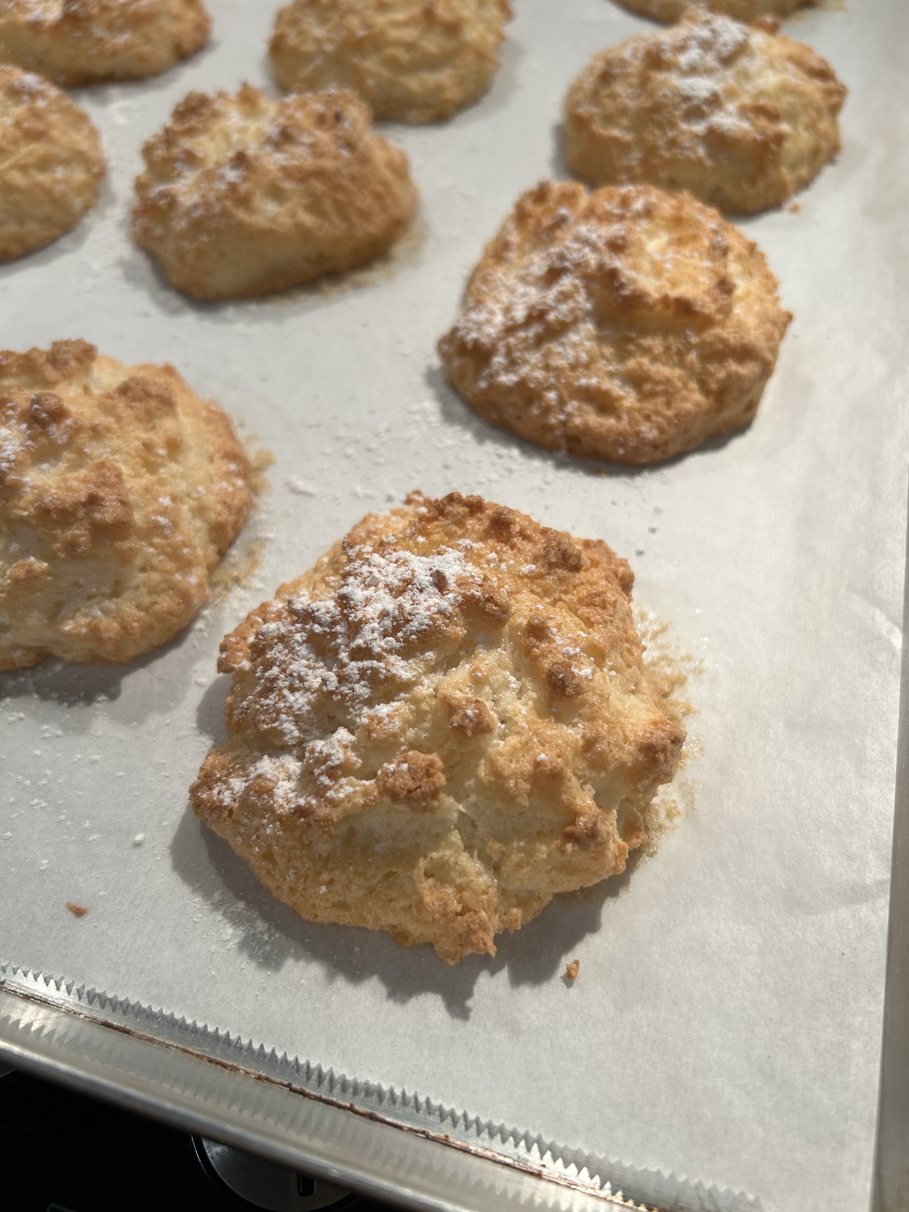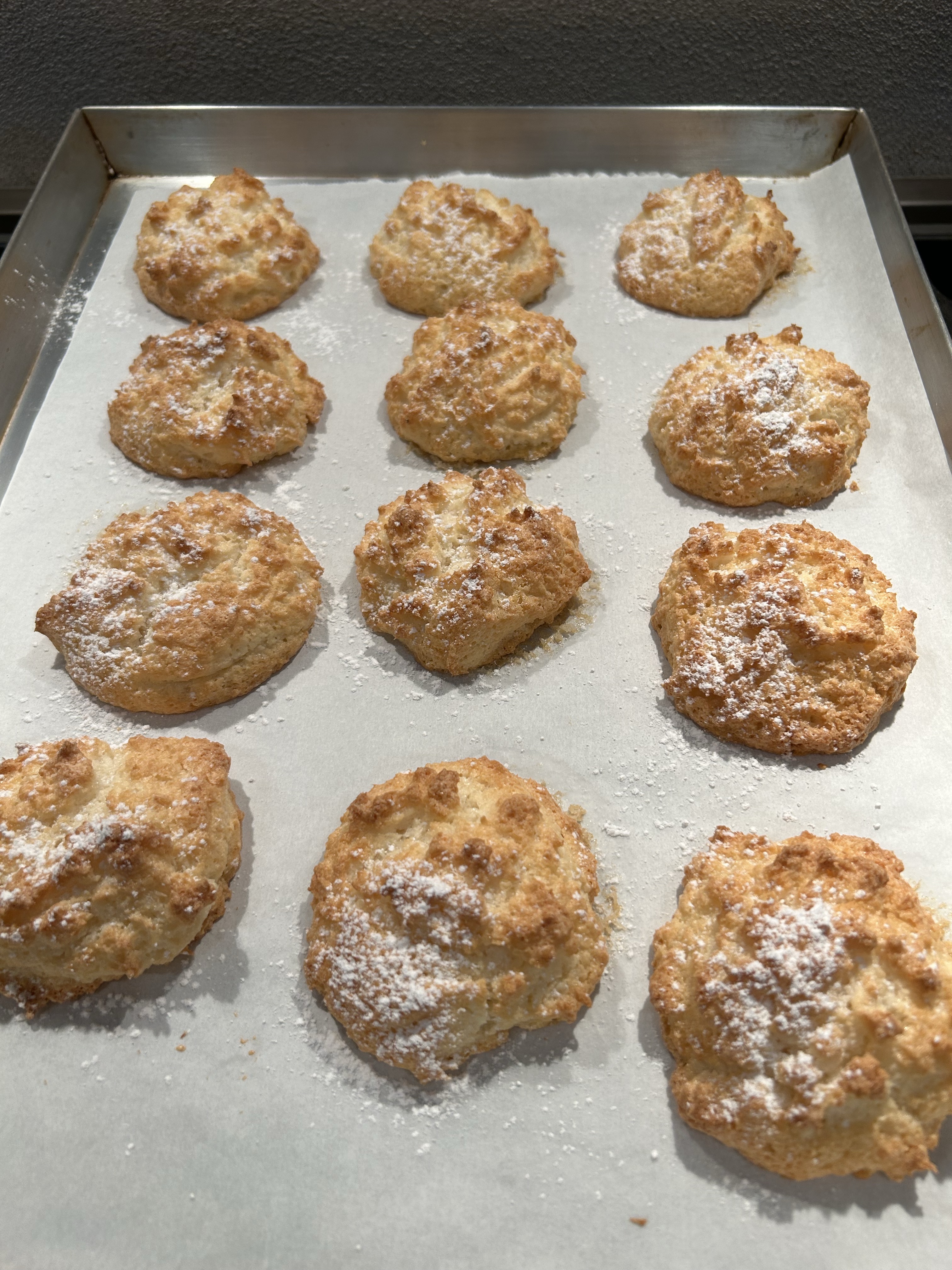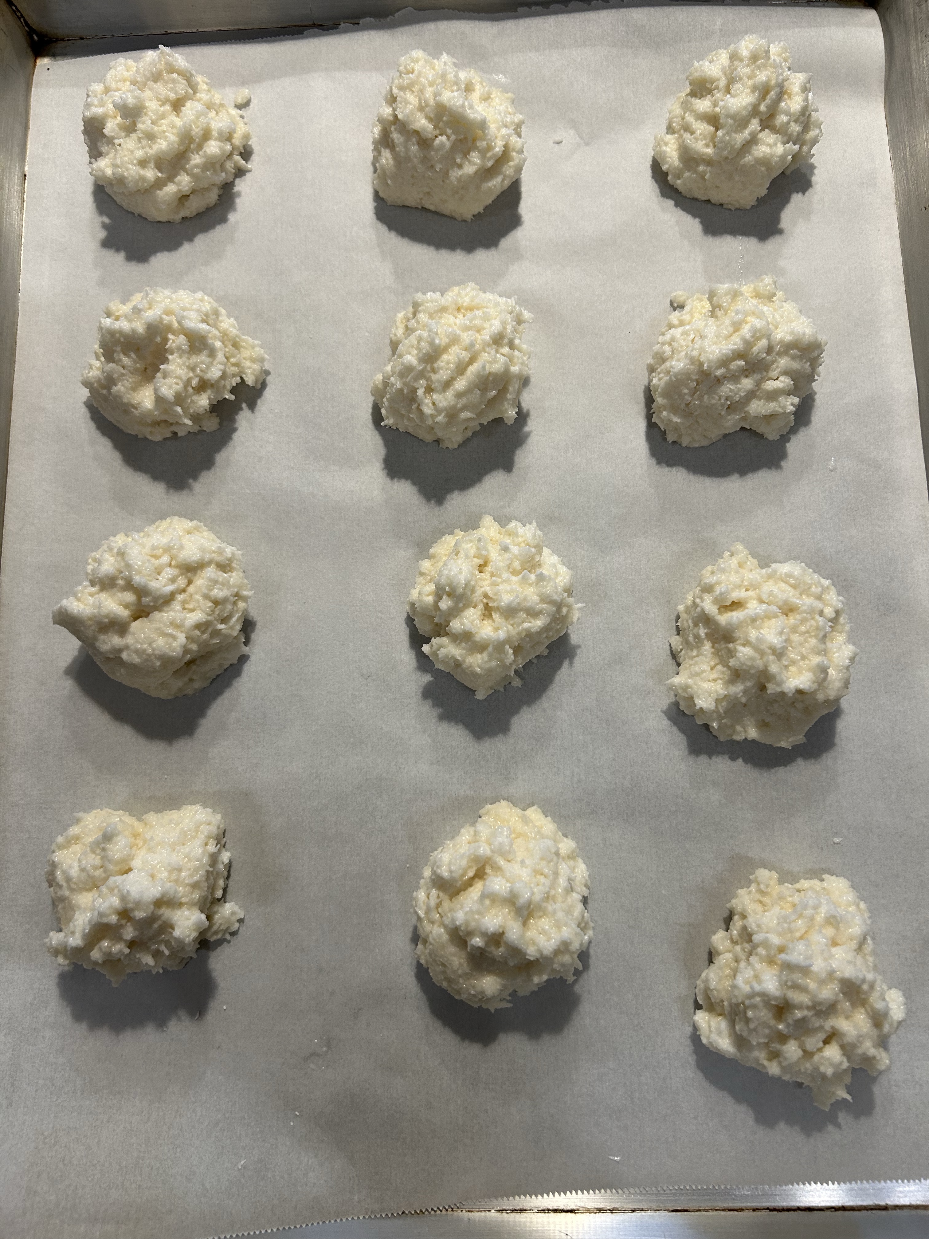 Rivesto una teglia di carta forno e aiutandomi con 2 cucchiaini appoggio dei piccoli mucchietti di impasto distanziati l’uno dall’altro, in cottura gonfiano