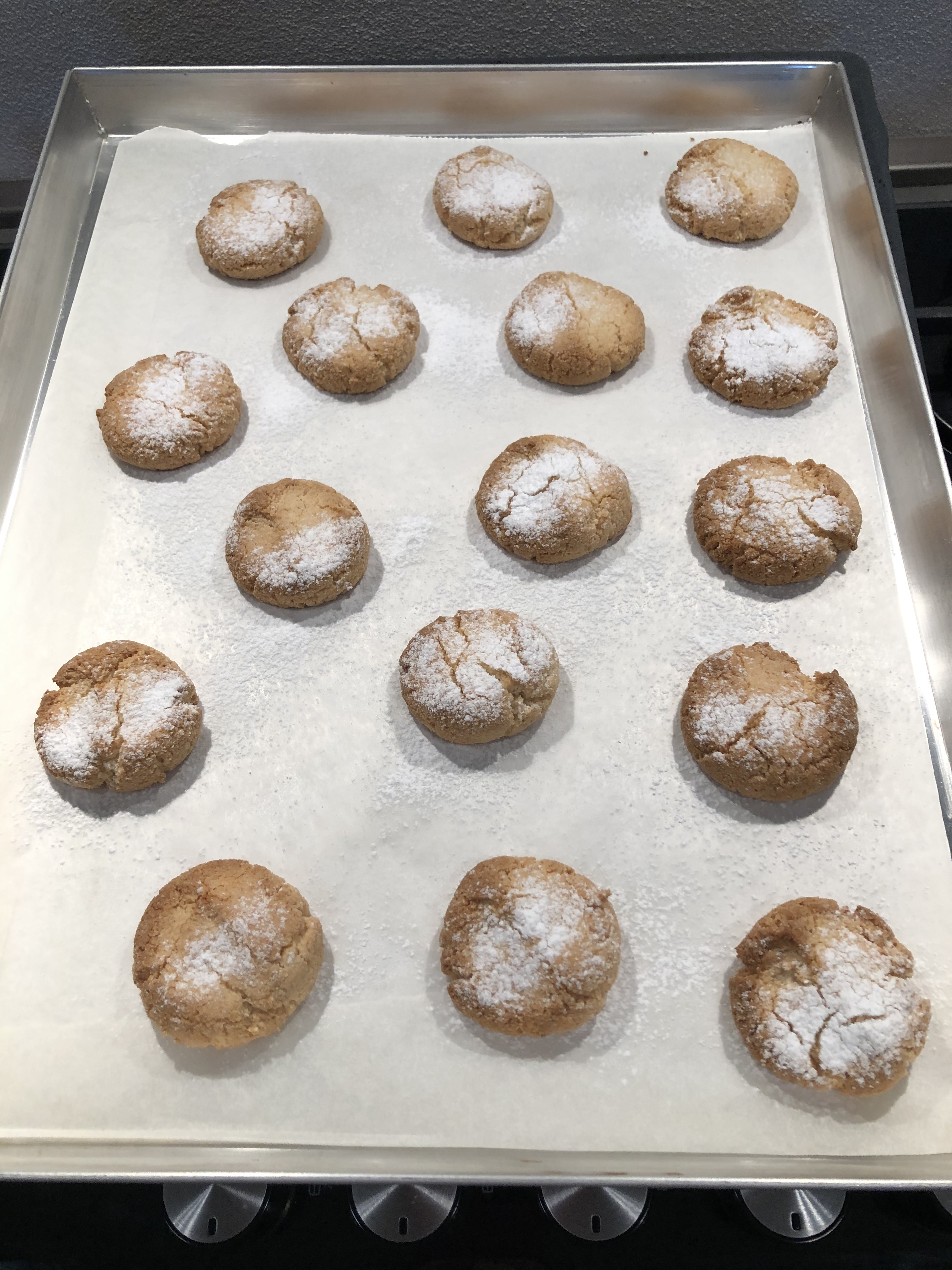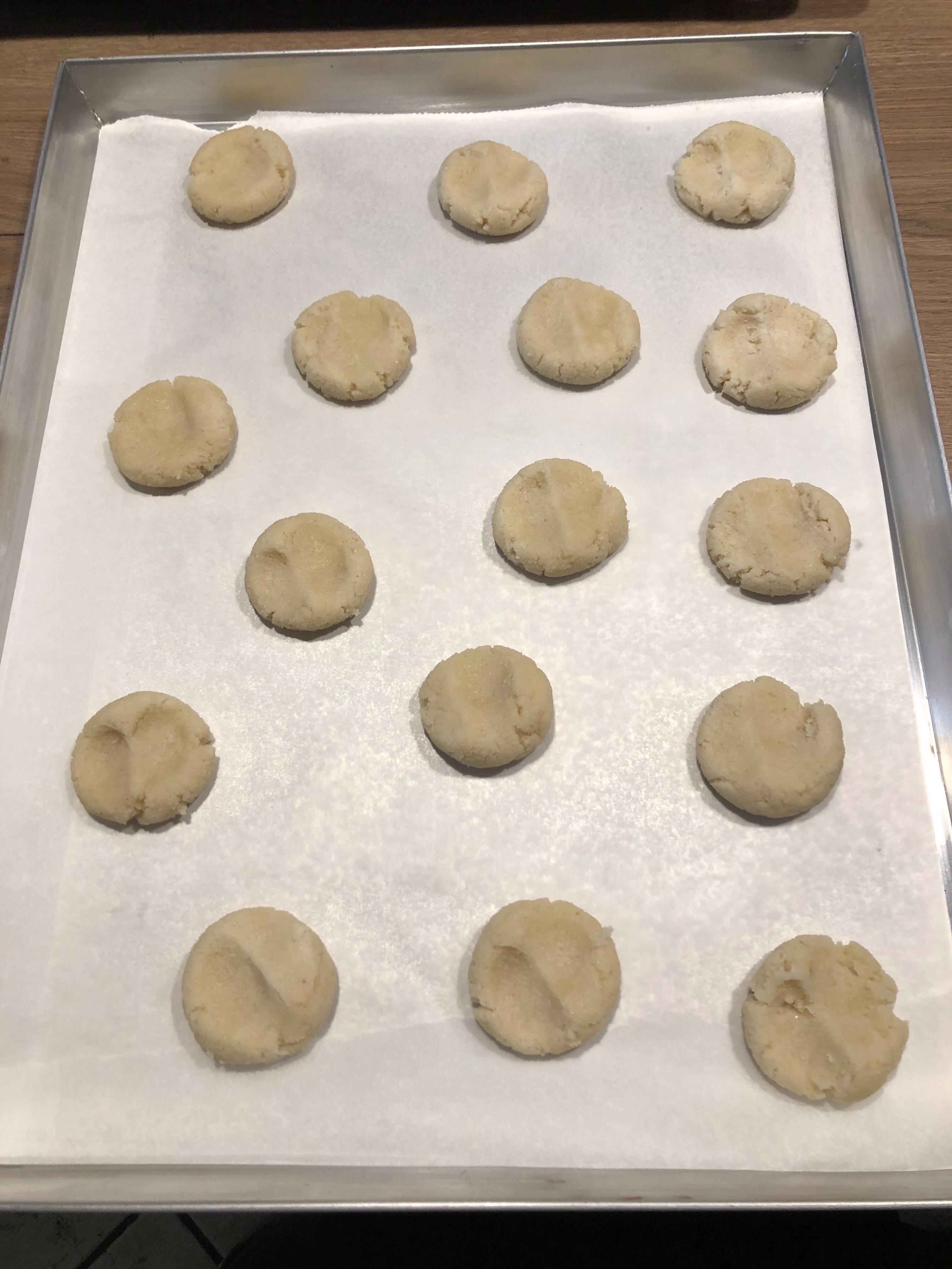 Rivesto una teglia con carta forno e dispongo i biscotti appoggiandoli vanno rigirati sottosopra tenendoli distanziati