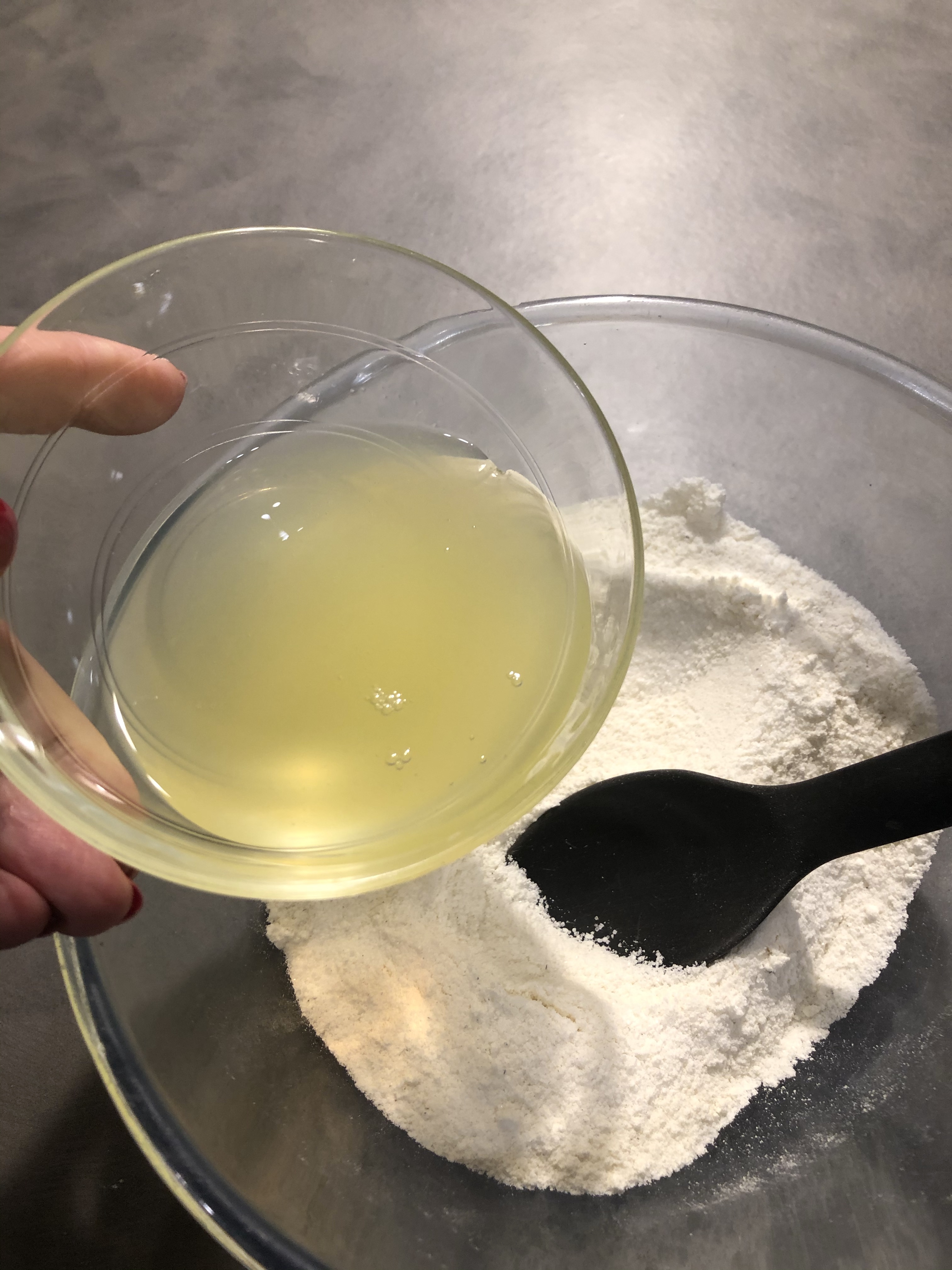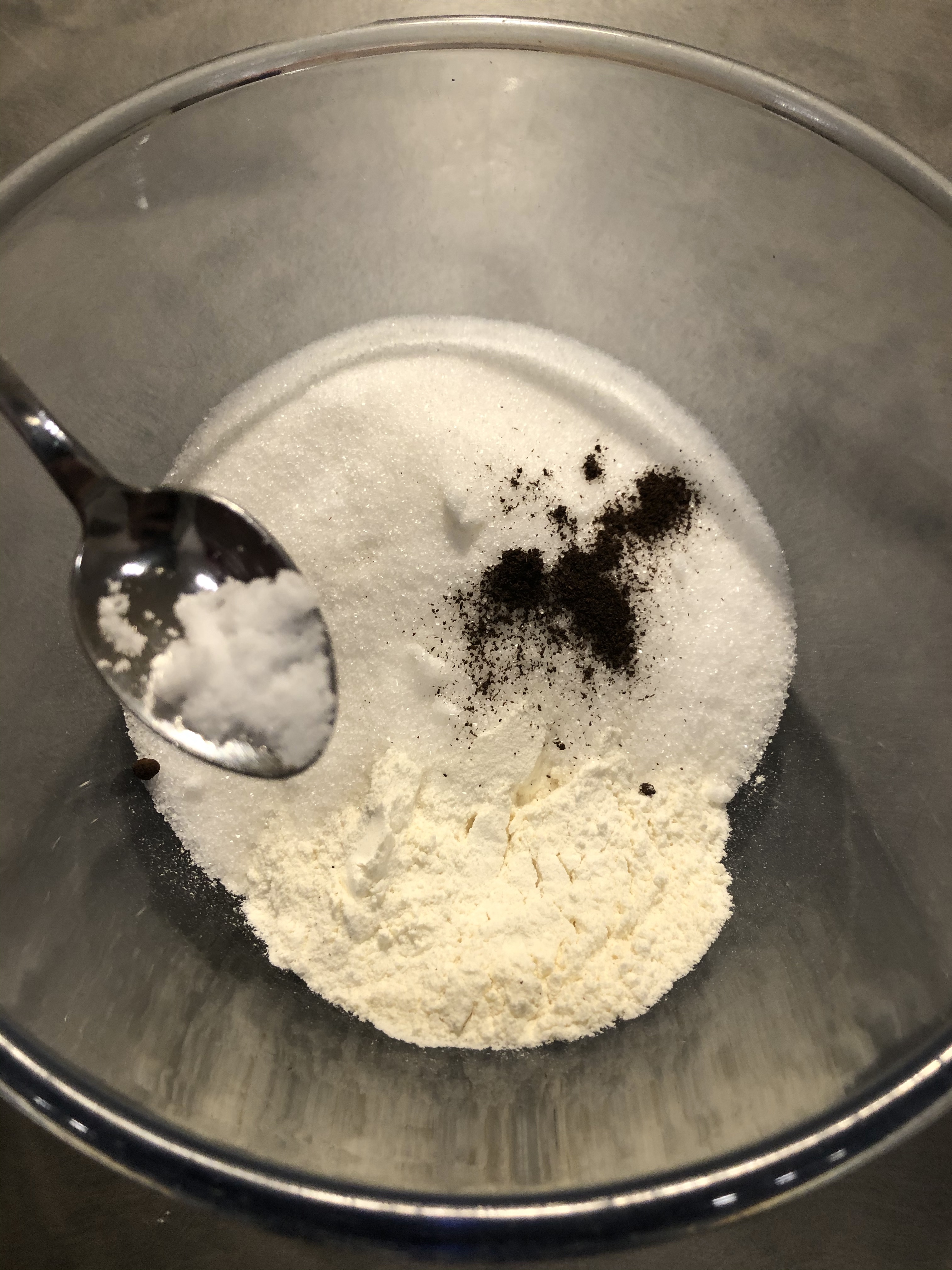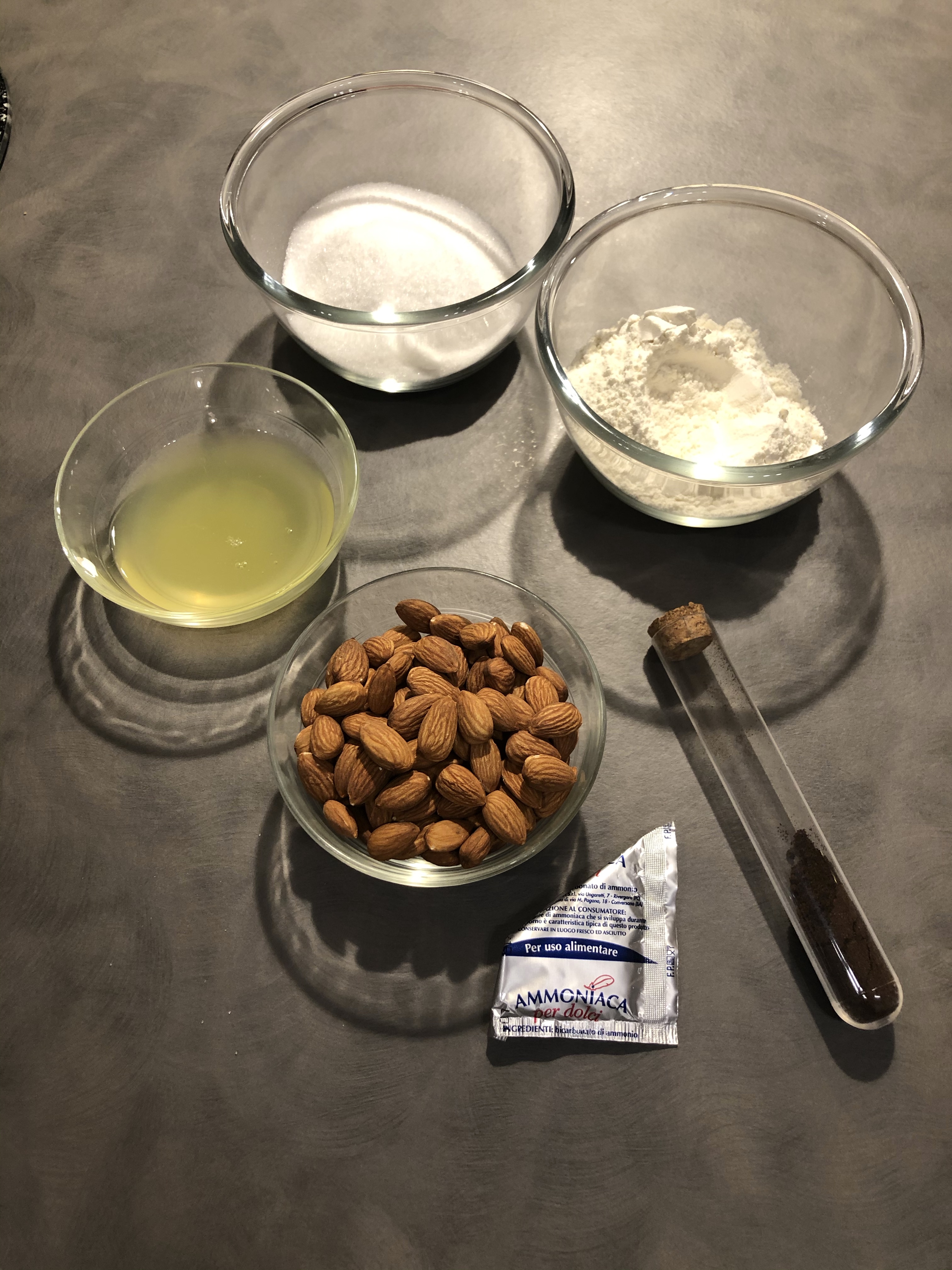 In una ciotola verso la farina, lo zucchero, la vaniglia e l”ammoniaca, mettete poca ammoniaca,mezzo cucchiaino scarso e non annusatela perché é molto forte