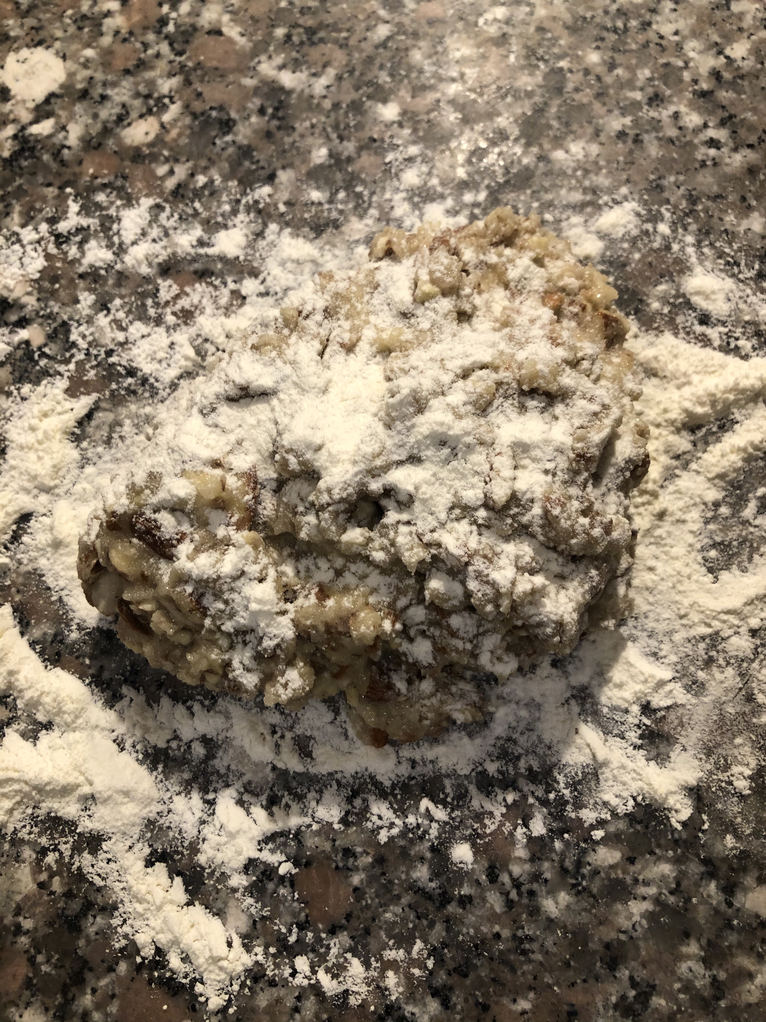 Infarino il piano di lavoro con la farina e verso l”impasto, aggiungo ancora farina sulla superficie ed inizio ad appiattire l”impasto