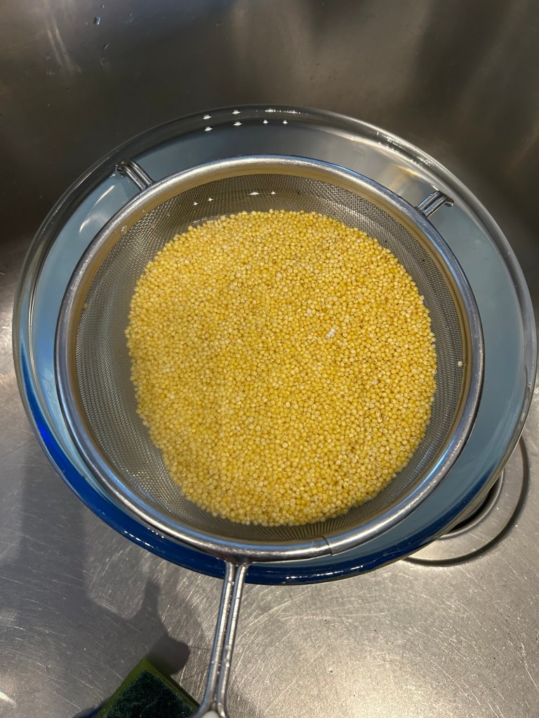 Prima di cuocere la quinoa bisogna lavarla accuratamente, cambiando l’acqua spesso per eliminare la sostanza(saponina) che la ricopre, l’acqua deve risultare limpida, ho seguito le istruzioni sulla confezione, ho fatto bollire abbondante acqua leggermente salata e ho cotto 10 minuti dal bollore, ho scolato e lasciato raffreddare, si può cuocere anche per assorbimento, seguite le istruzioni sulla confezione