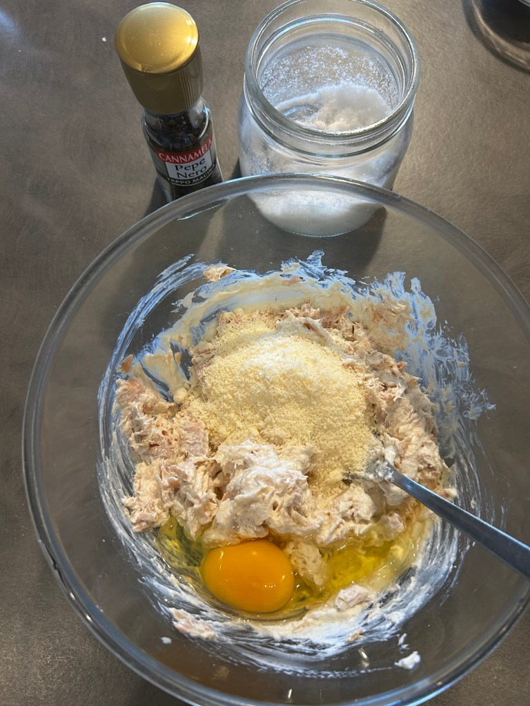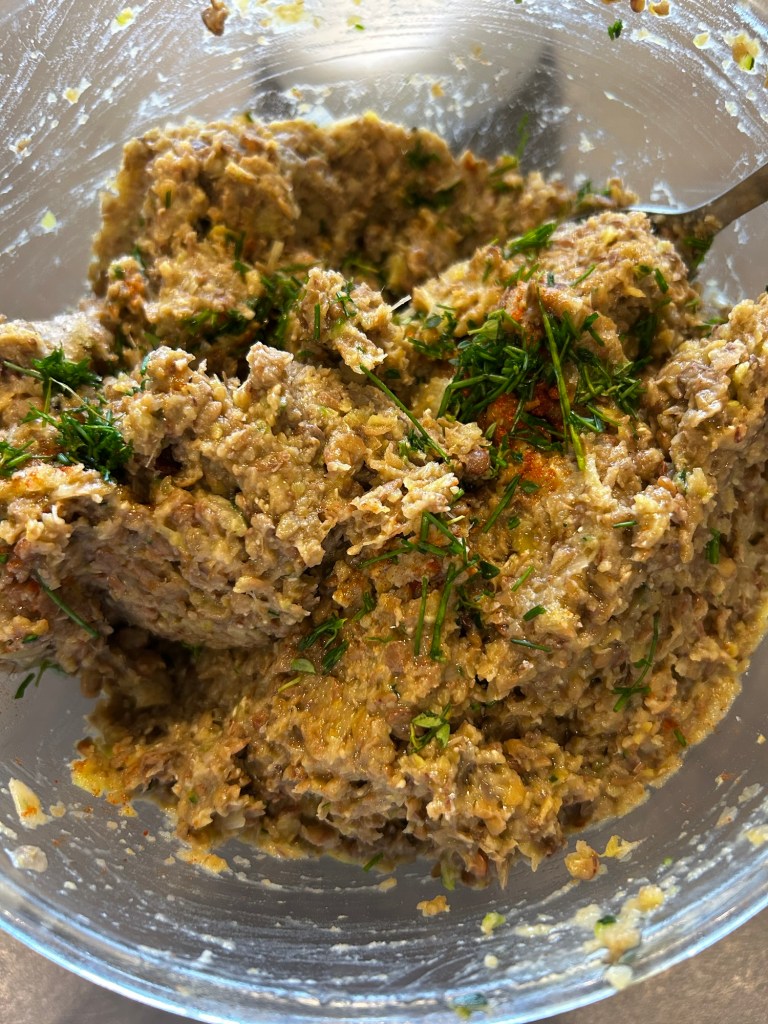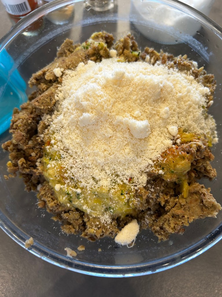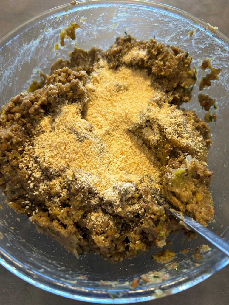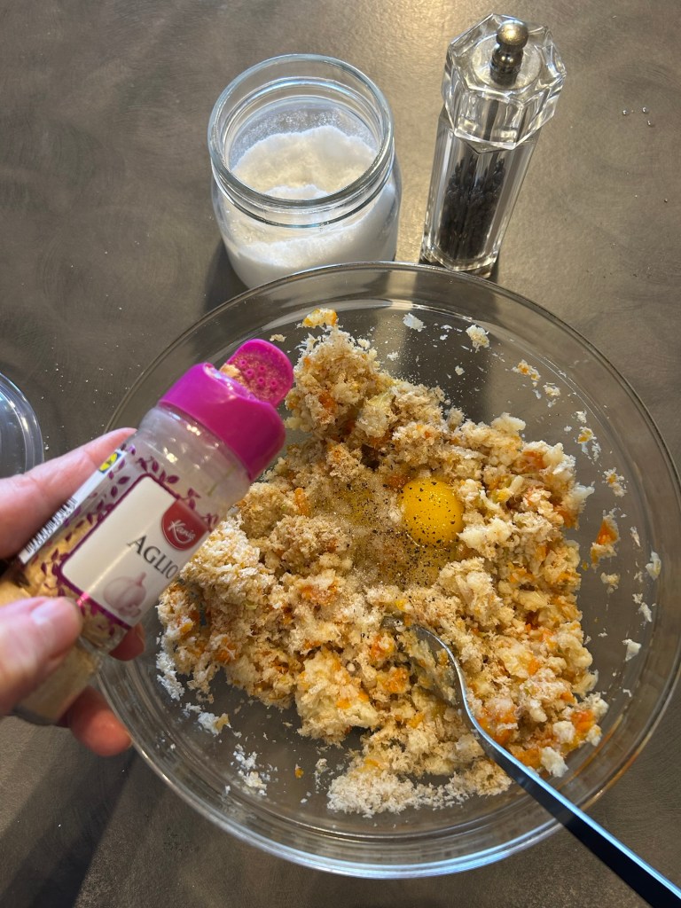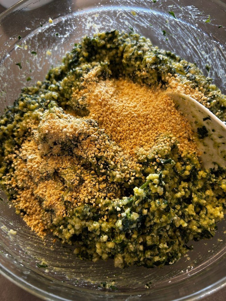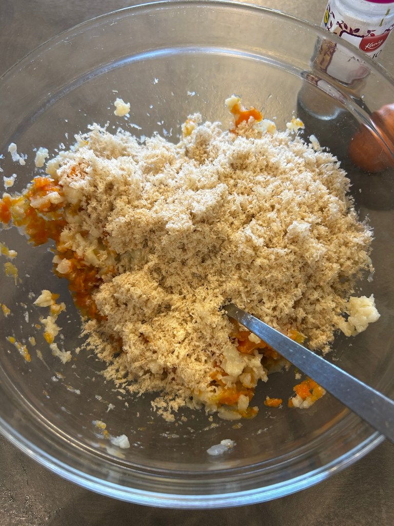 Mescolo e unisco il pane grattugiato io ho utilizzato quello senza glutine ma se non avete intolleranze va bene quello normale, impasto con le mani per valutare la consistenza, potrebbe servire più pane se l’impasto resta umido