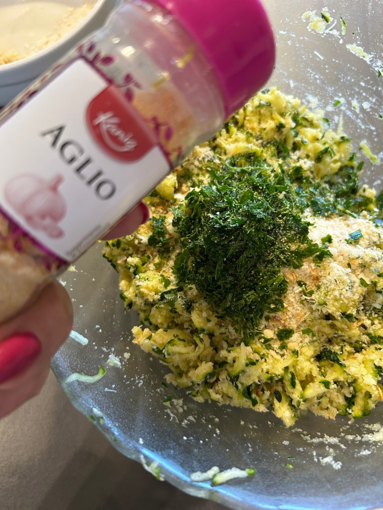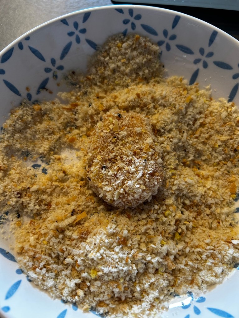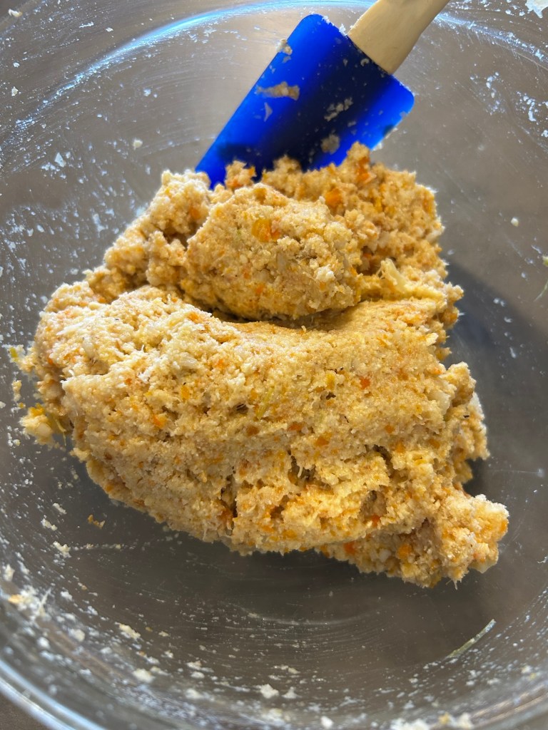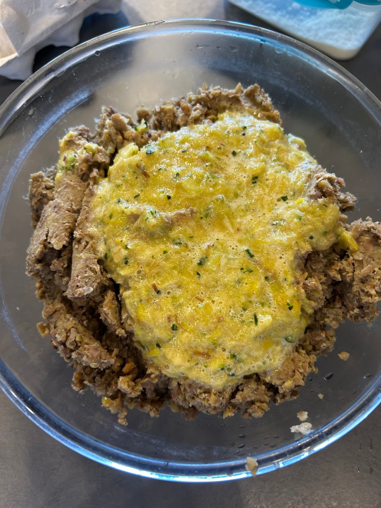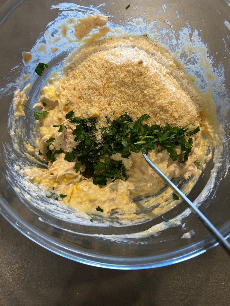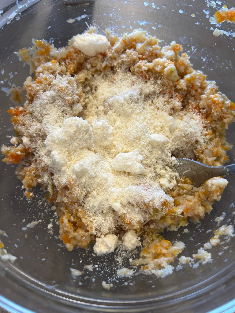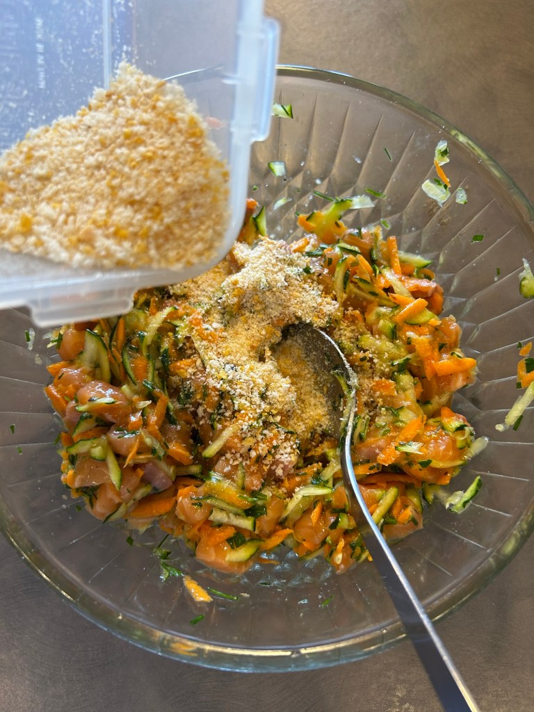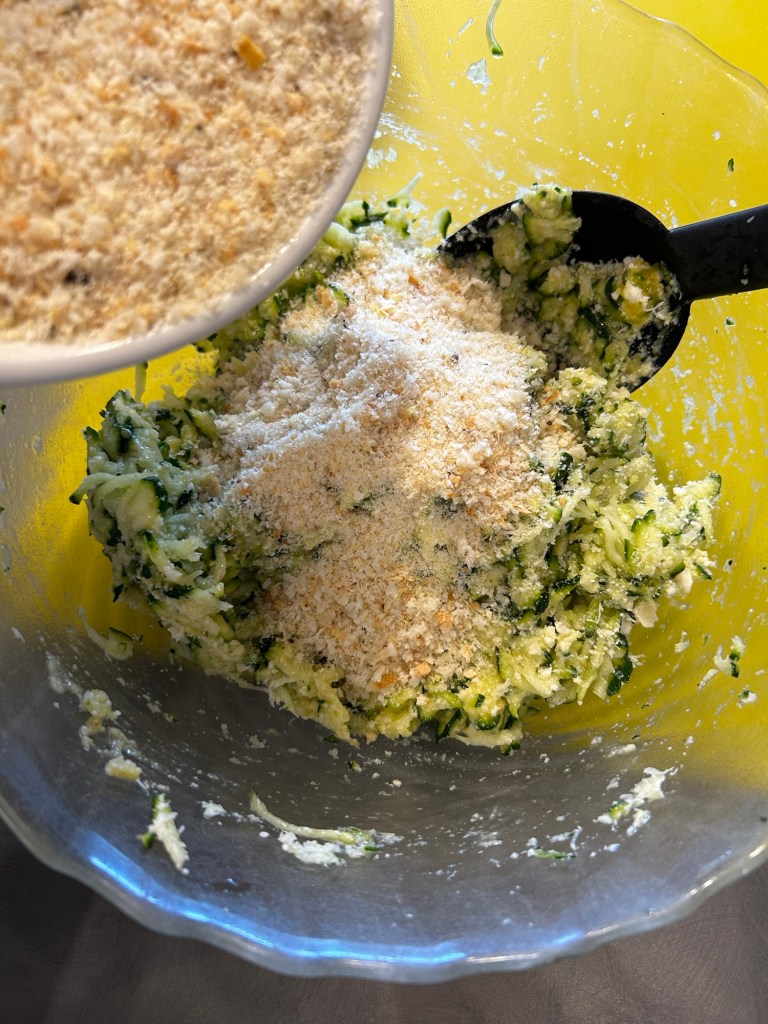Mescolo e unisco il pane grattugiato io ho utilizzato quello senza glutine ma se non avete intolleranze va bene quello normale, impasto con le mani per valutare la consistenza, potrebbe servire più pane se l’impasto resta umido