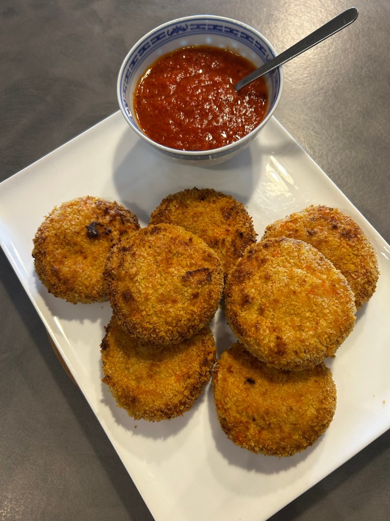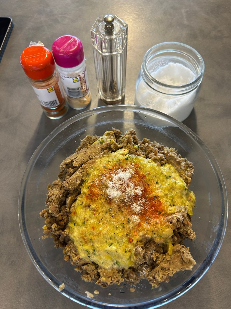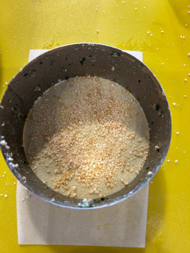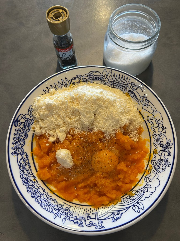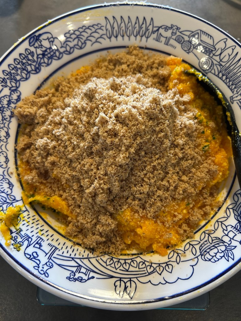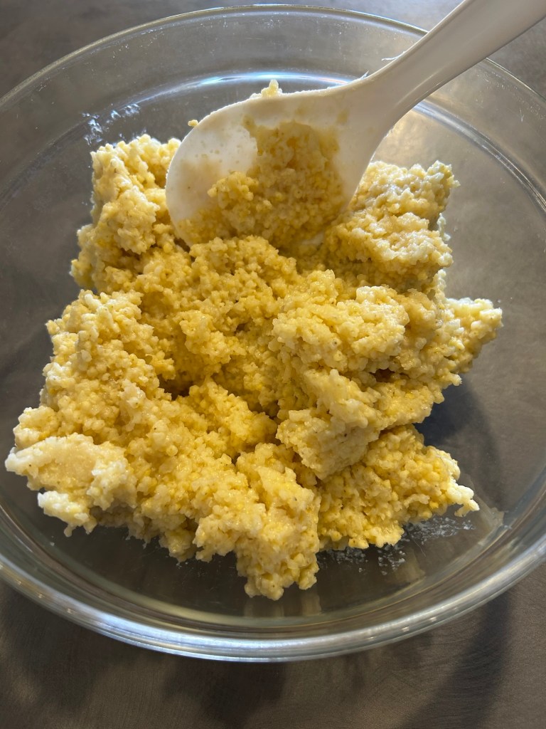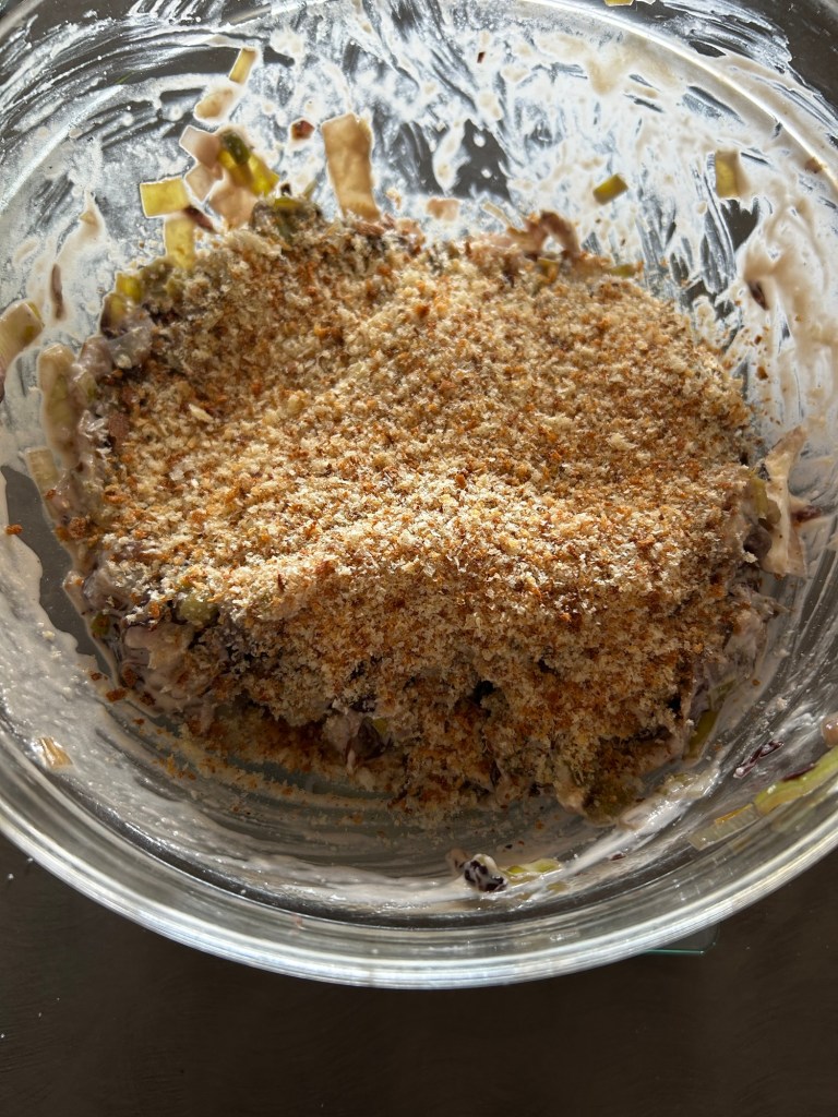 Mescolo e unisco il pane grattugiato io ho utilizzato quello senza glutine ma se non avete intolleranze va bene quello normale, impasto con le mani per valutare la consistenza, potrebbe servire più pane se l’impasto resta umido