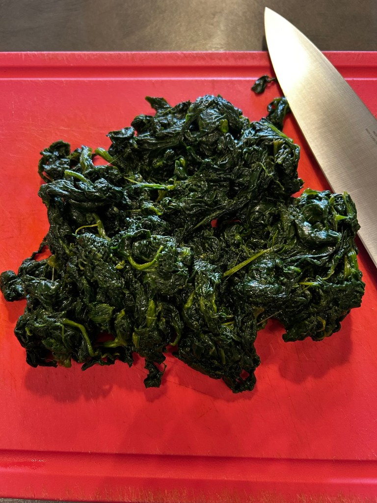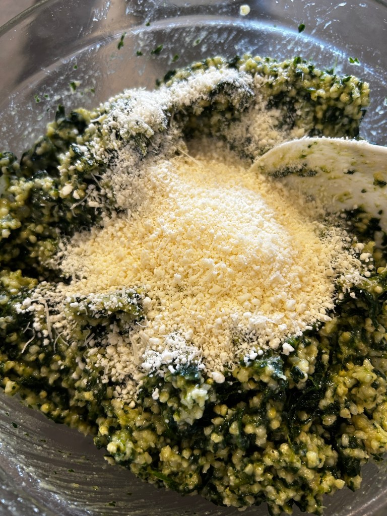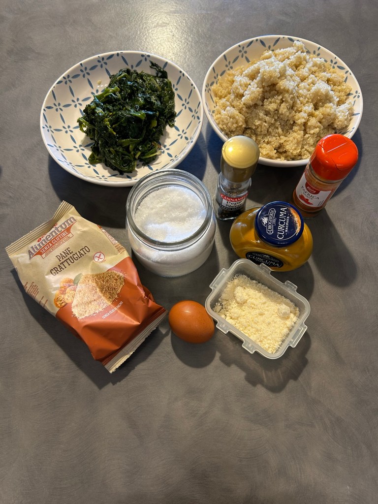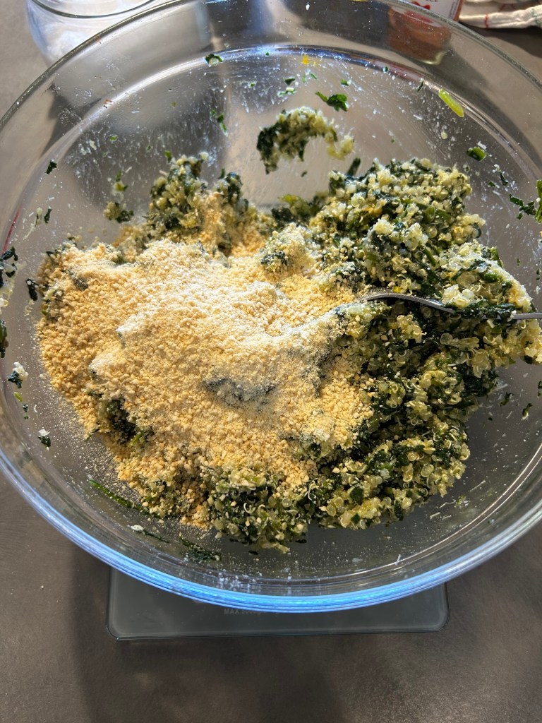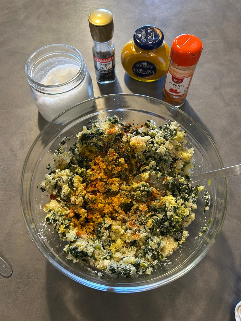 Lascio raffreddare la quinoa, trito gli spinaci che avevo precedentemente cotto in padella senza acqua con un filo di olio, sale pepe, un trito di prezzemolo uno spicchio di aglio, basteranno pochi minuti se rilasciano liquido li strizzo
