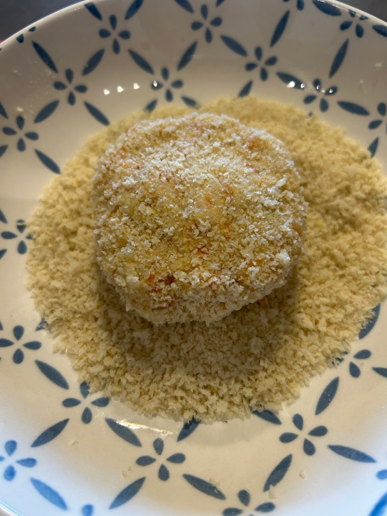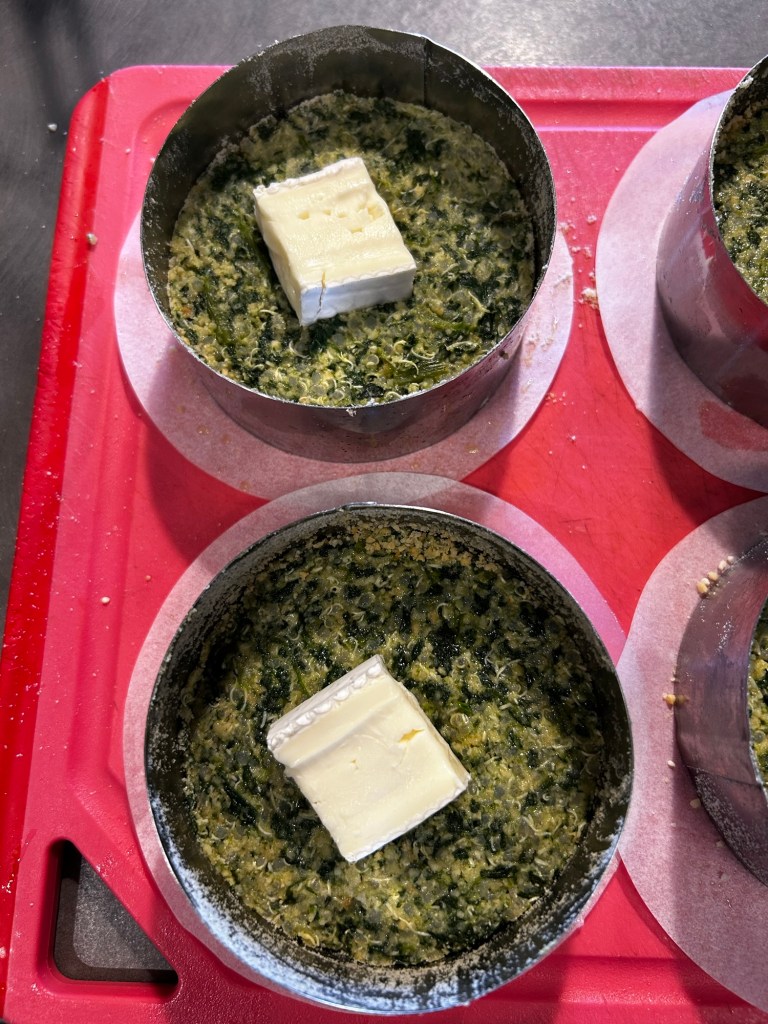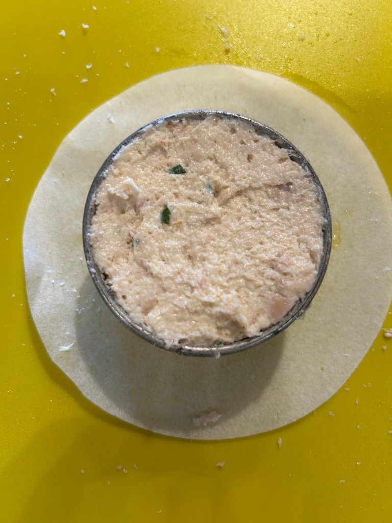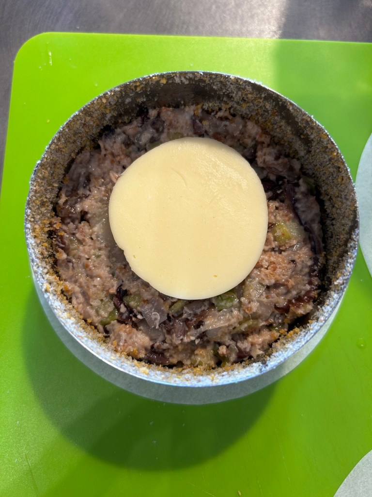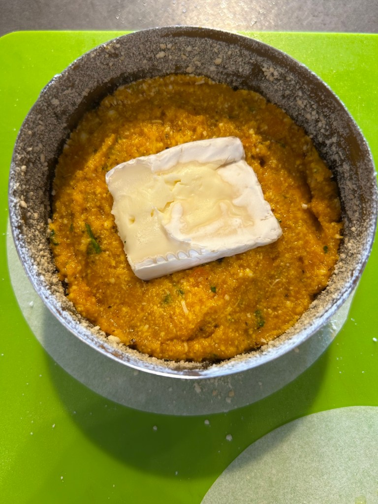 Ungo e metto del pane intorno a un coppa pasta appoggiato su un dischetto di carta forno unta e cosparsa di pane grattugiato, verso un po’ di impasto lo appiattisco e al centro metto un bel cubetto di brie o quello che preferite