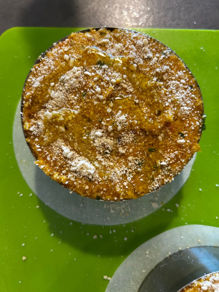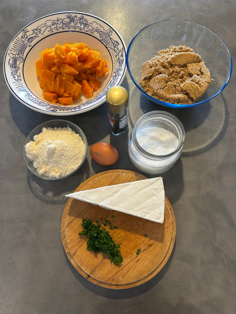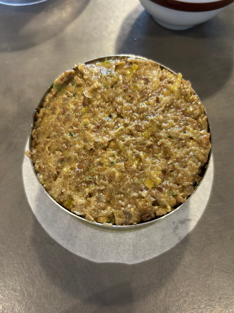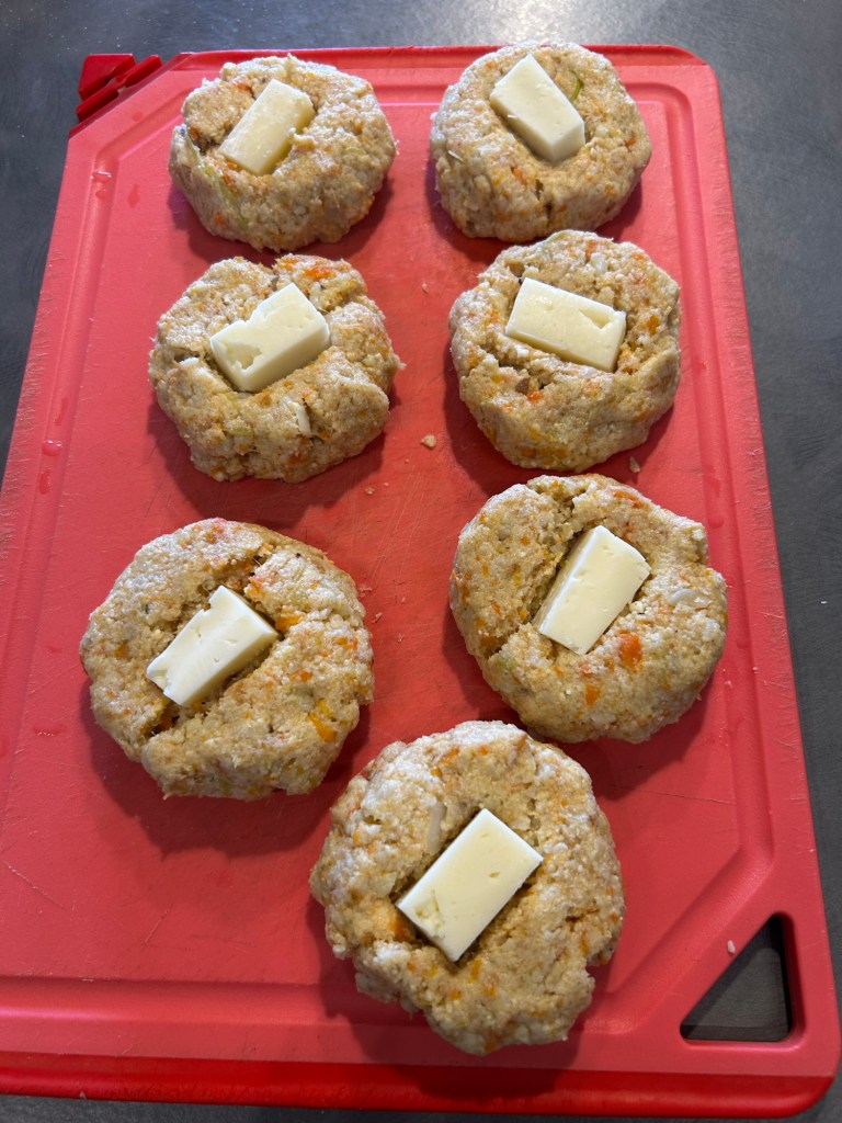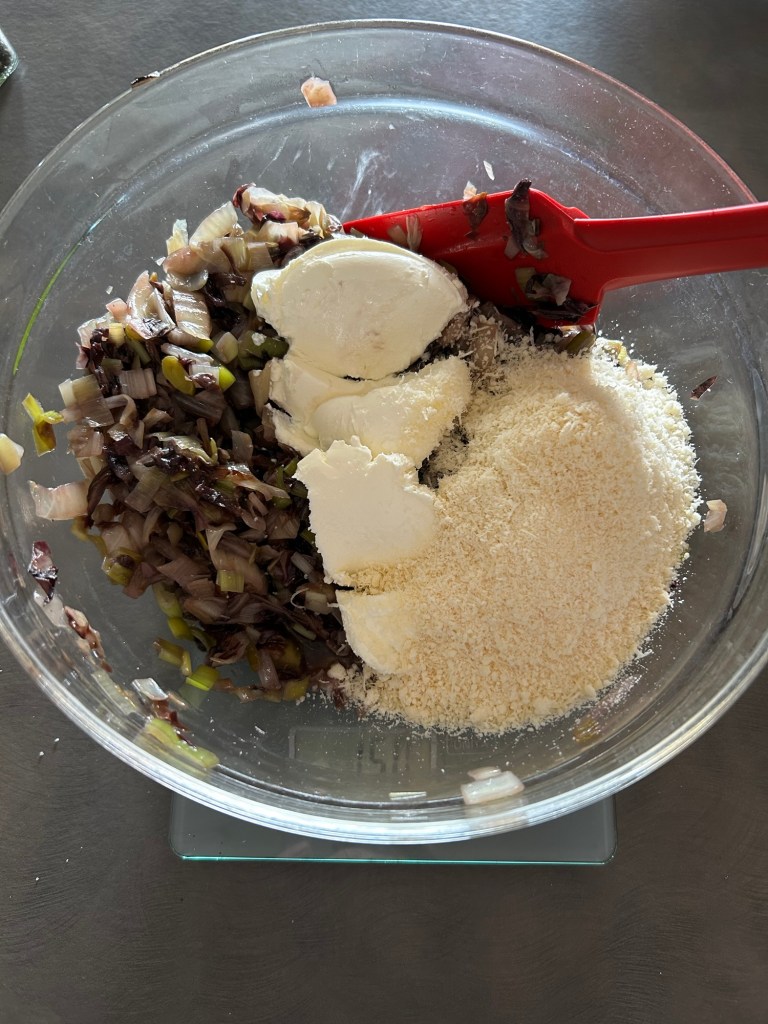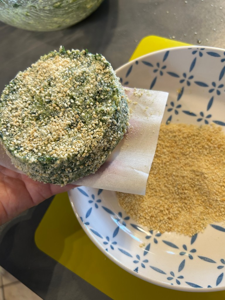Ungo e metto del pane intorno a un coppa pasta appoggiato su un dischetto di carta forno unta e cosparsa di pane grattugiato, verso un po’ di impasto lo appiattisco e al centro metto un bel cubetto di brie o quello che preferite