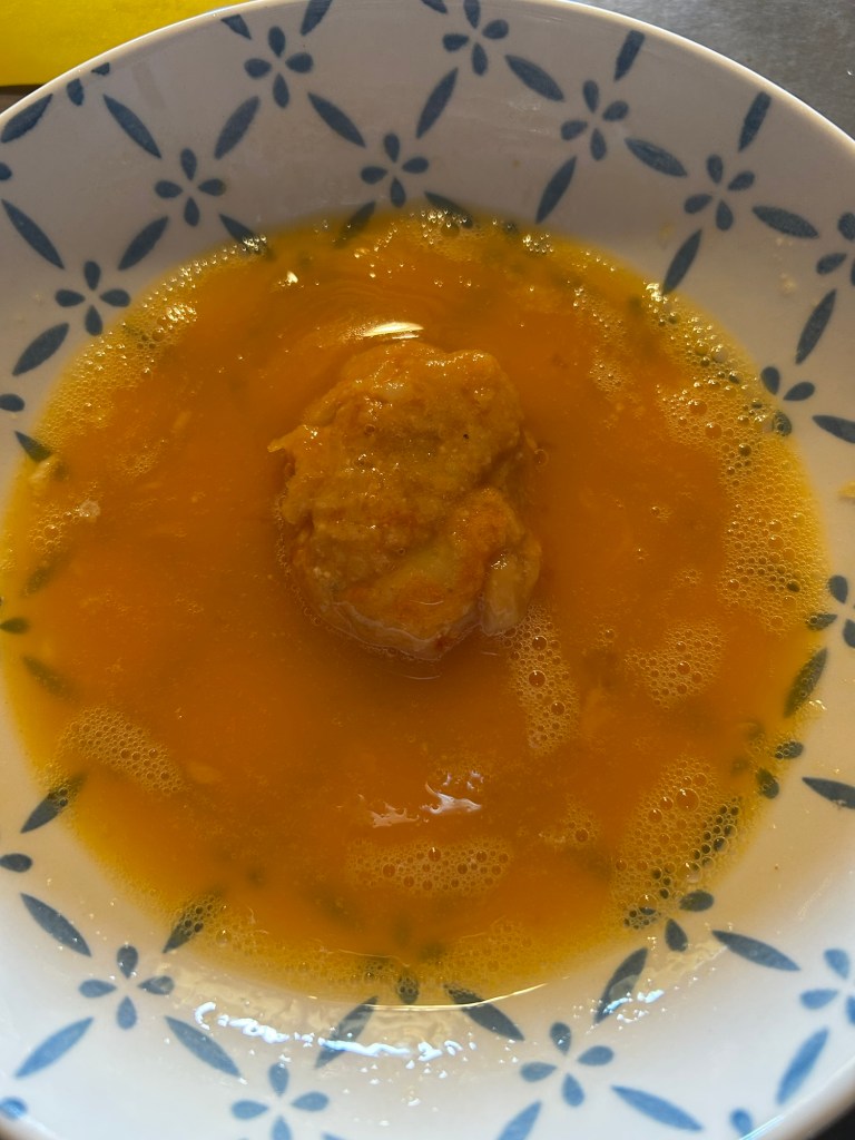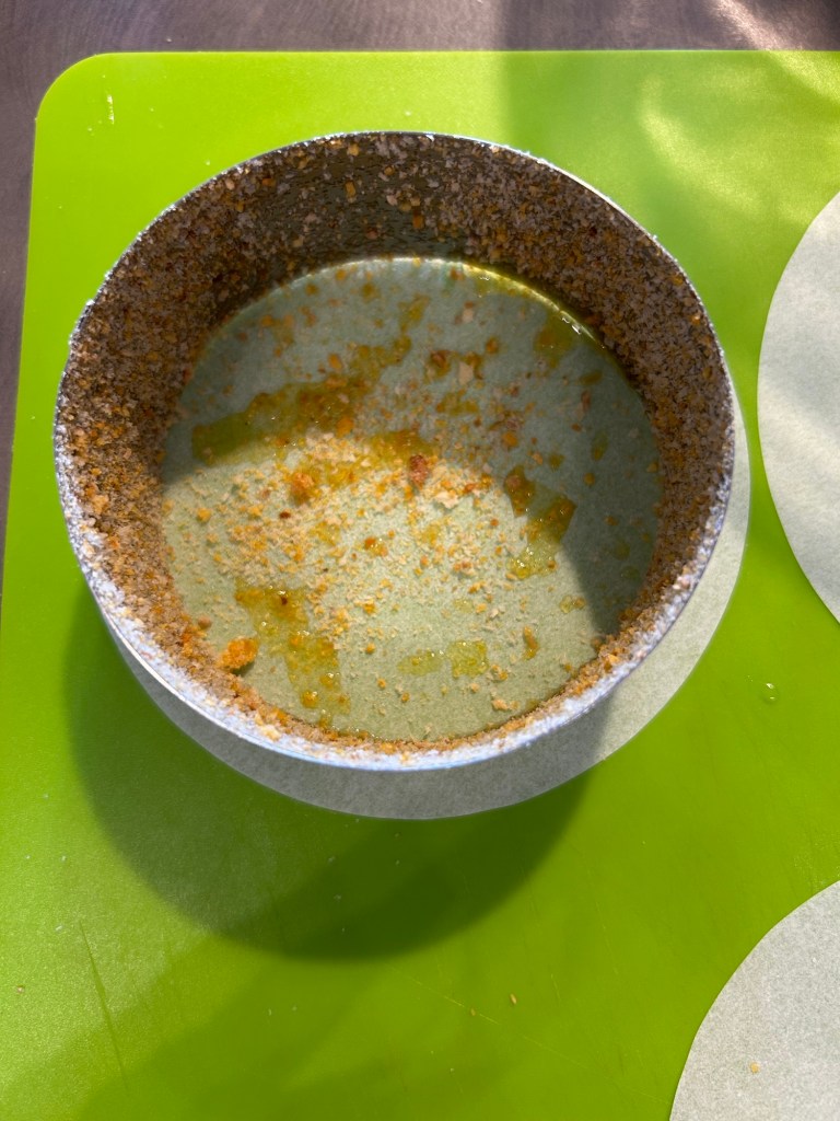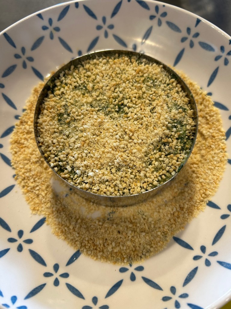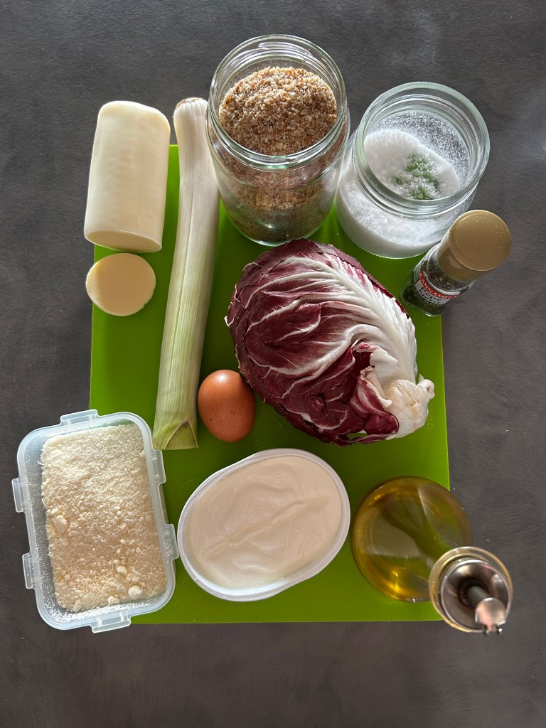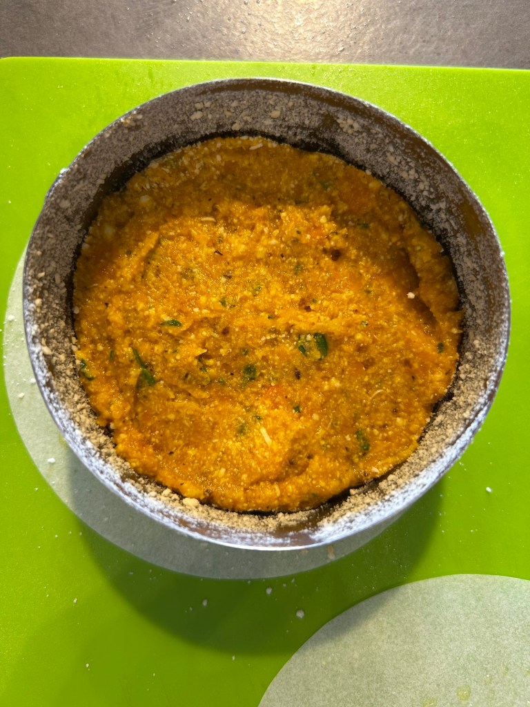 Ungo e metto del pane intorno a un coppa pasta appoggiato su un dischetto di carta forno unta e cosparsa di pane grattugiato, verso un po’ di impasto lo appiattisco e al centro metto un bel cubetto di brie o quello che preferite