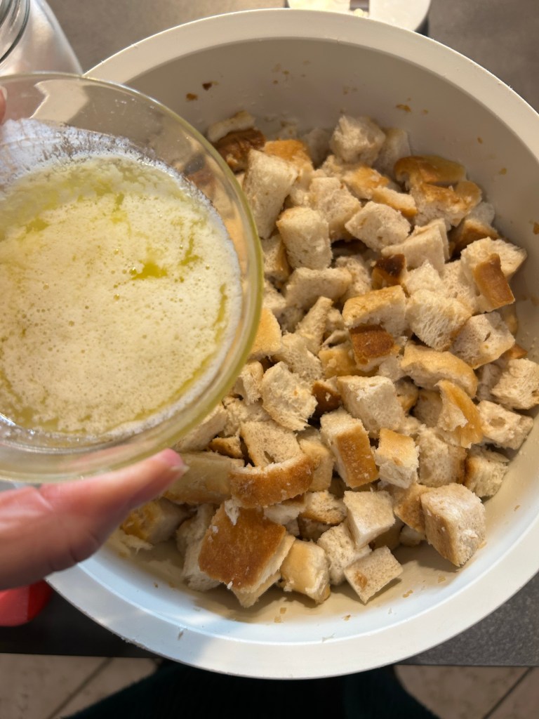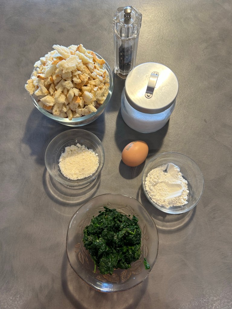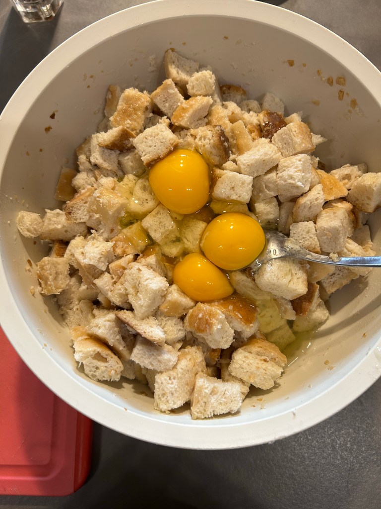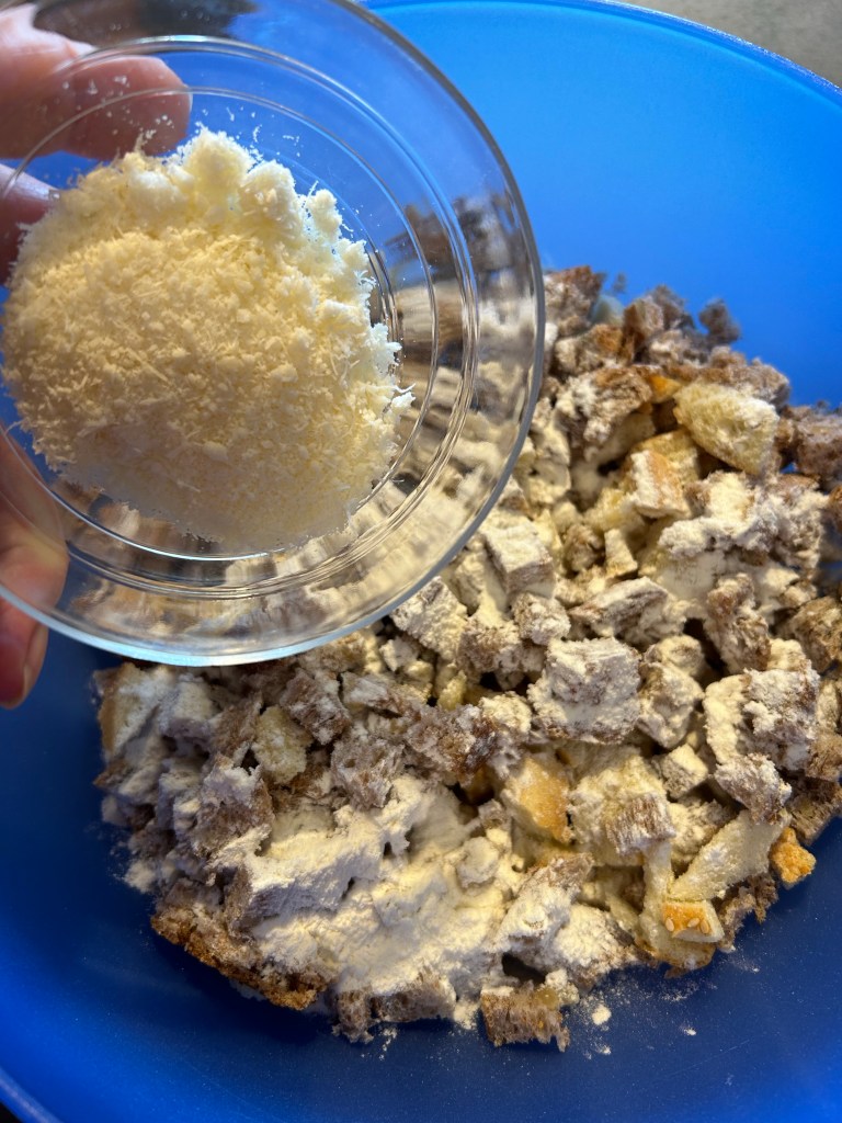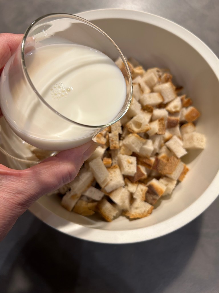Taglio il pane a cubetti piccoli e lo bagno con il latte lo lascio una mezz’ora, la quantità é indicativa dipende dalla durezza del pane, deve essere morbido ma non troppo bagnato