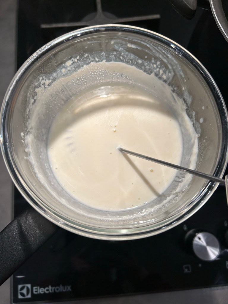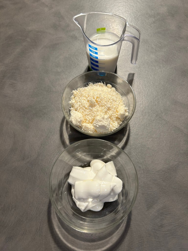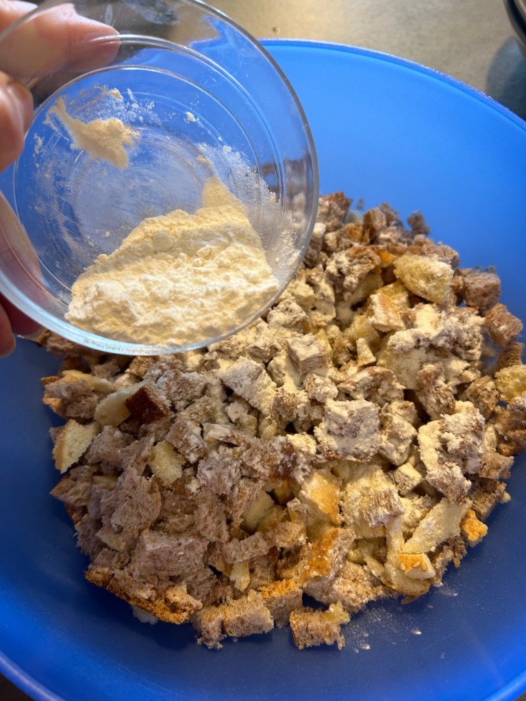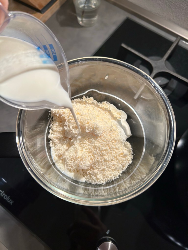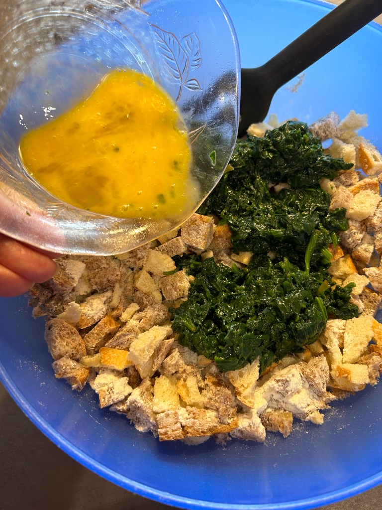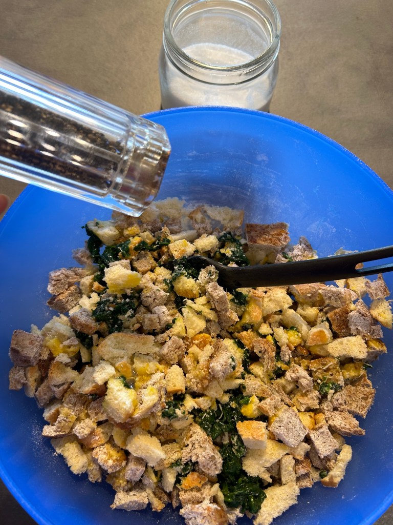 Taglio il pane a cubetti piccoli e lo bagno con il latte lo lascio una mezz’ora, la quantità é indicativa dipende dalla durezza del pane, deve essere morbido ma non troppo bagnato