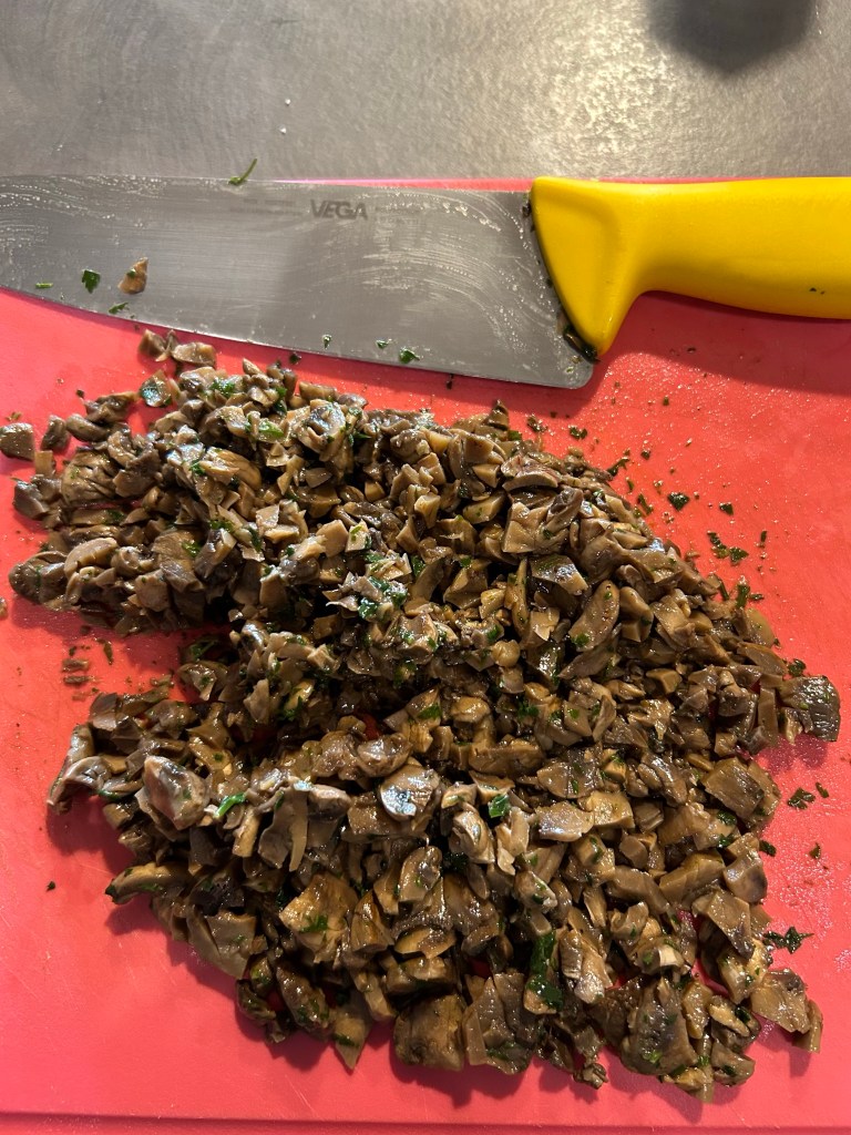 Trito i funghi che avevo cotto in padella con olio burro, prezzemolo aglio e sale
