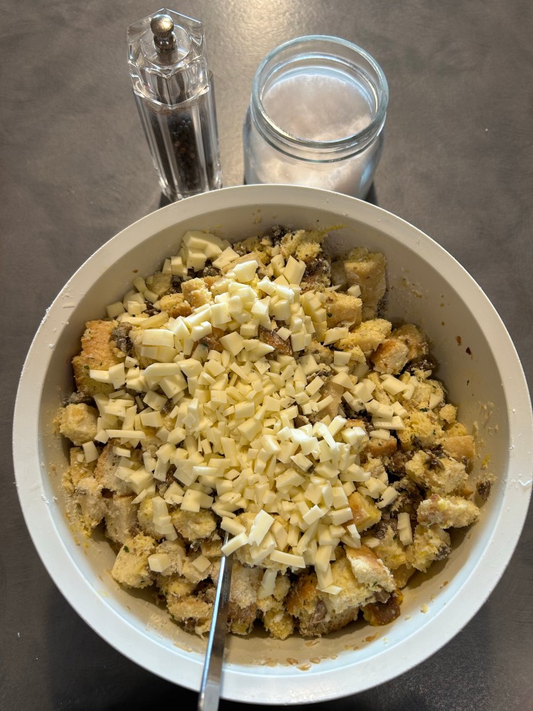 Regolo di sale e pepe, taglio il formaggio a cubetti piccolissimi e li aggiungo al composto