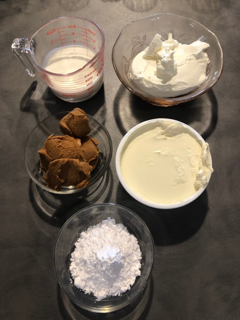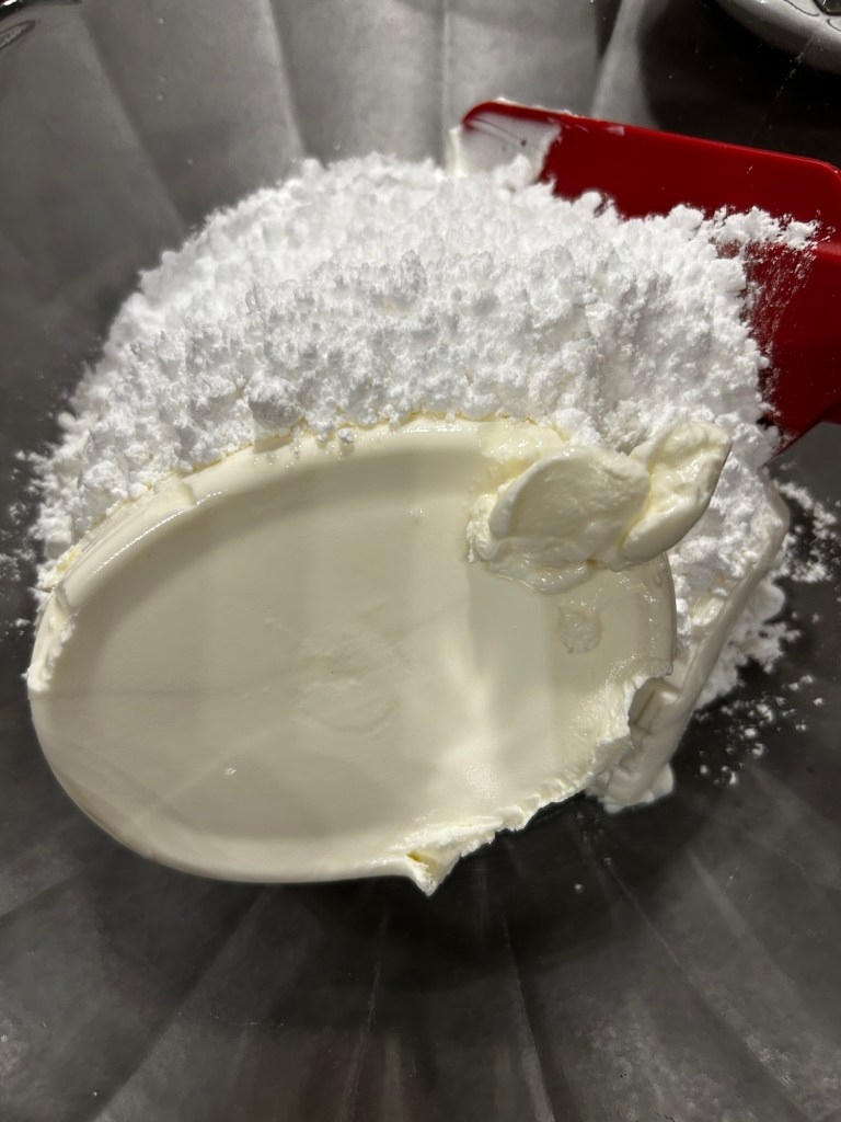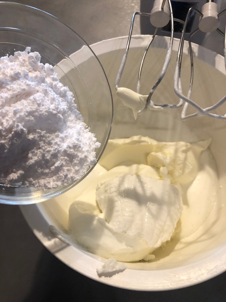 In una ciotola con le fruste elettriche monto la panna, quando é semi montata aggiungo il mascarpone, il formaggio Philadelphia e lo zucchero a velo