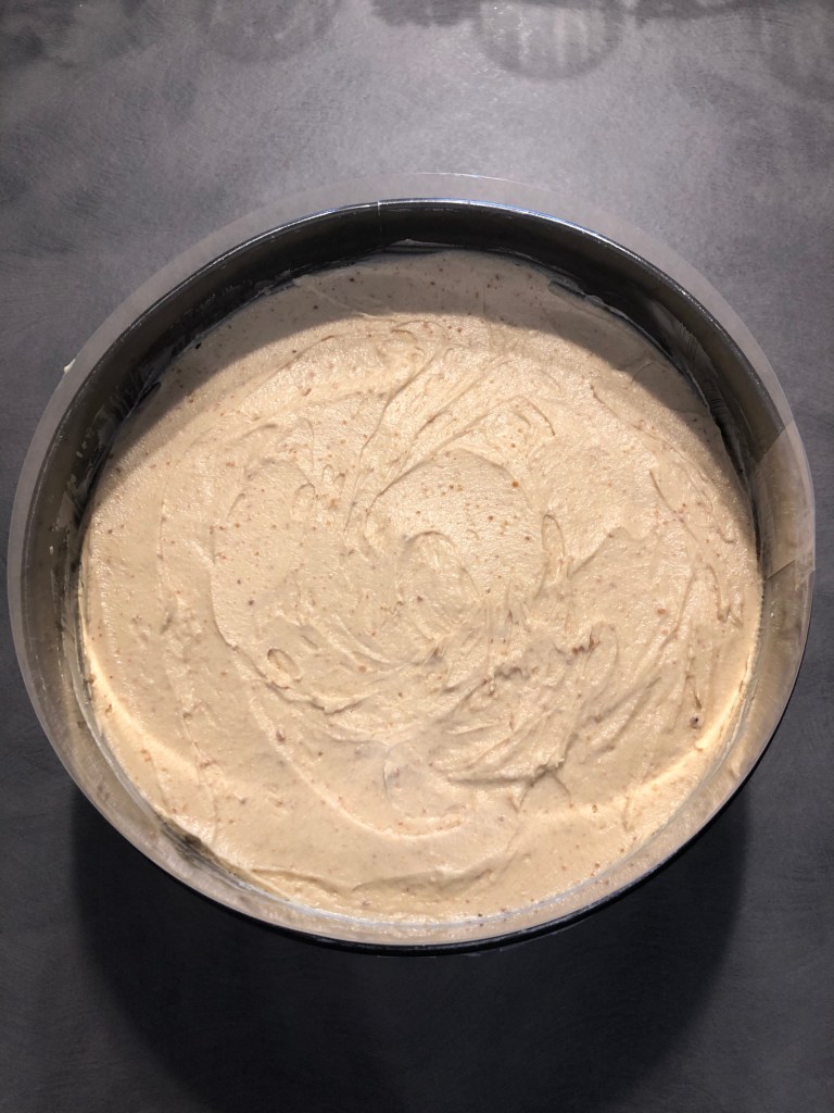 Mescolo bene e li verso nella tortiera, io ho ricoperto il fondo con carta forno, e i bordi con strisce di acetato, così i bordi restano lisci, se non l’avete vanno bene delle strisce di carta forno