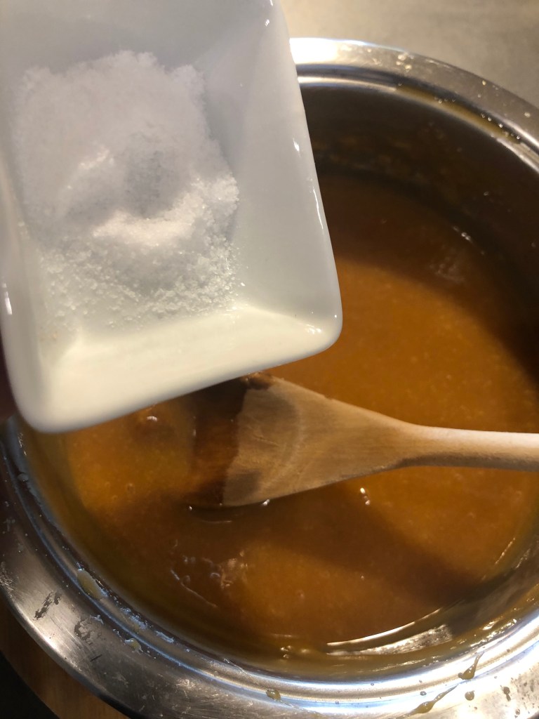 Faccio scaldare la panna senza farla bollire, taglio il burro a pezzetti, in un pentolino verso lo zucchero, lo lascio sciogliere senza mai mescolare, solo muovendolo di tanto in tanto, quando assume un colore dorato con molta attenzione aggiungo la panna bollente a filo