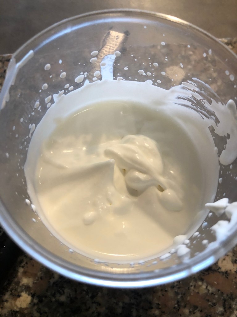 Monto la panna ben fredda lasciandola a lucido, cioè non montata del tutto ma morbida
