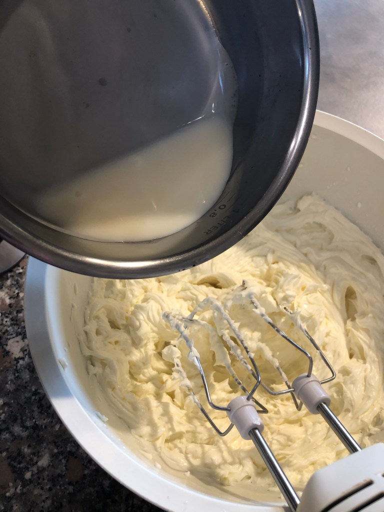 Monto con le fruste elettriche, aggiungo la buccia grattugiata di un limone, in un pentolino scaldo il latte e aggiungo la gelatina, la aggiungo pian piano alla crema sempre montando