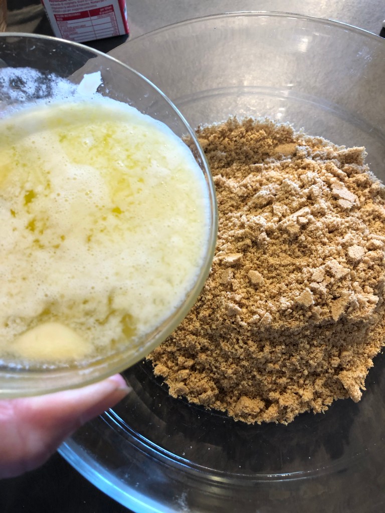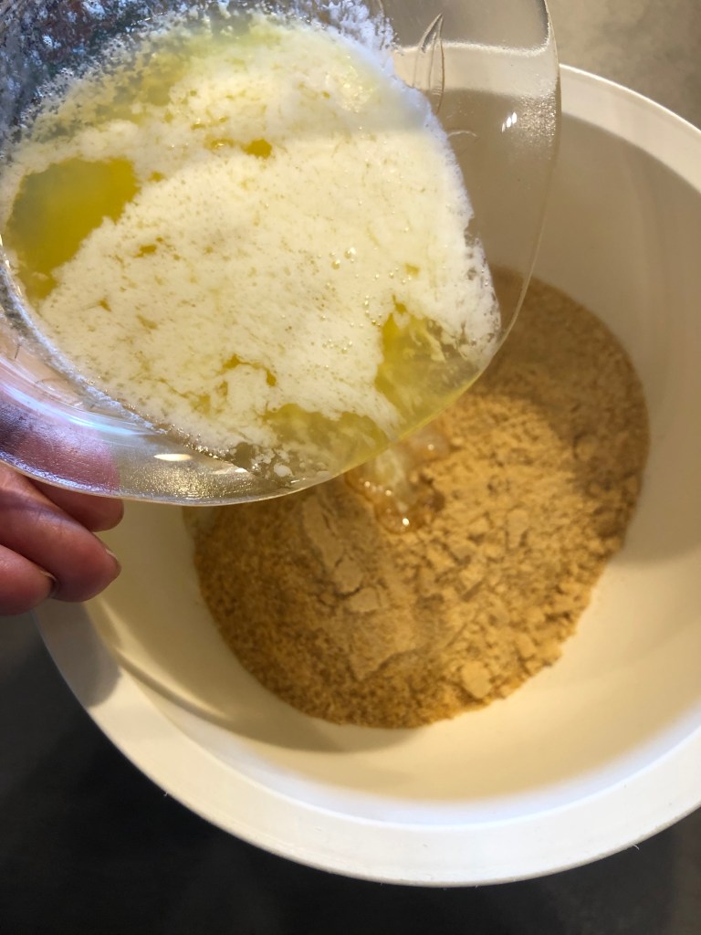 Sciolgo il burro a microonde lo aggiungo ai biscotti che ho tritato finemente