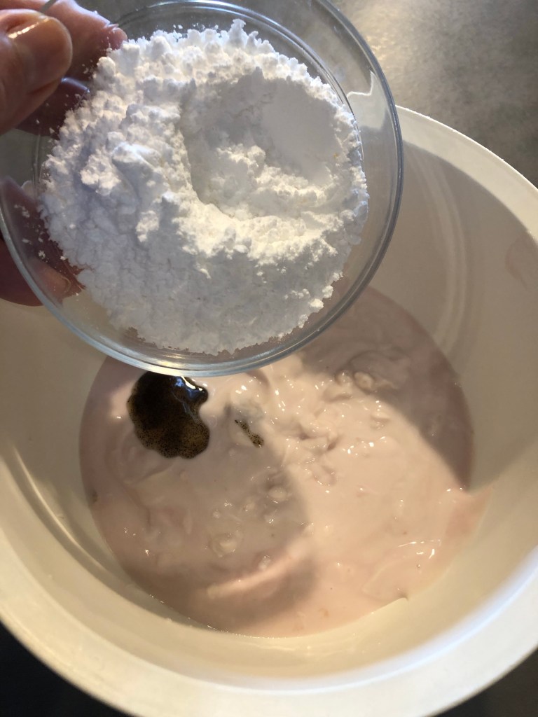 Verso lo yogurt di fragole in una ciotola, aggiungo la vaniglia, lo zucchero a velo e mescolo molto bene con una frusta