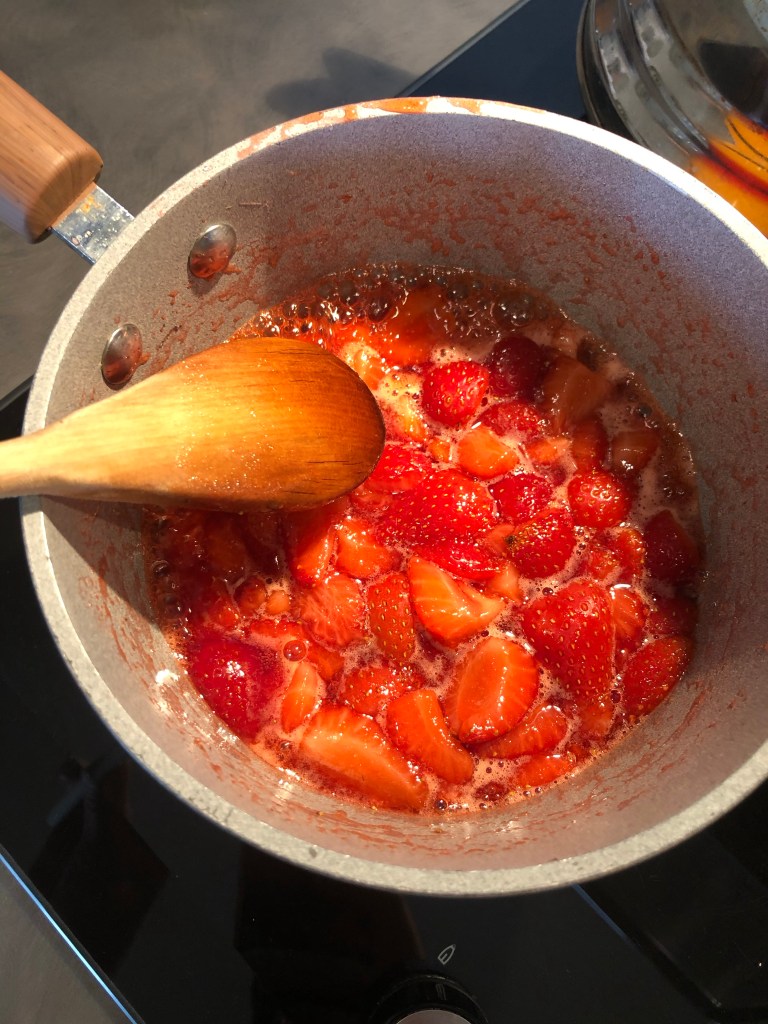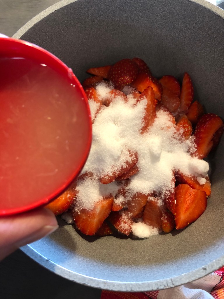Preparo la gelatina di fragole, metto in ammollo i 4 grammi di gelatina come ho fatto per la crema, taglio a pezzetti le fragole le metto in un pentolino con lo zucchero e il succo di limone