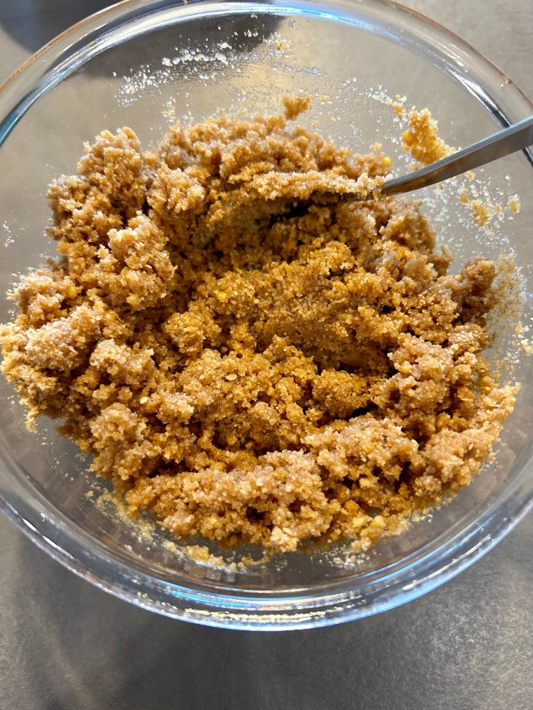 In un mixer trito i biscotti, li metto in una ciotola e aggiungo il burro fuso