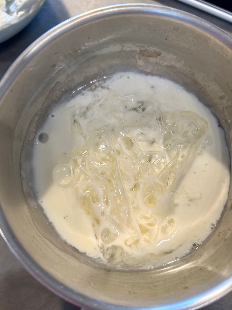 Scaldo in un pentolino 5/6 cucchiai di panna e sciolgo la gelatina che ho ammollato e la aggiungo a filo allo yogurt sempre mescolando