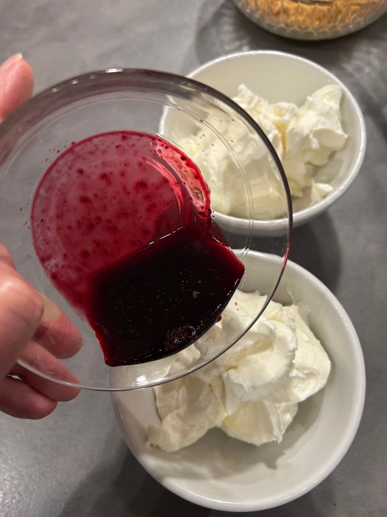 Divido la crema in due ciotole in parti uguali e in una aggiungo il succo che avevo tenuto da parte