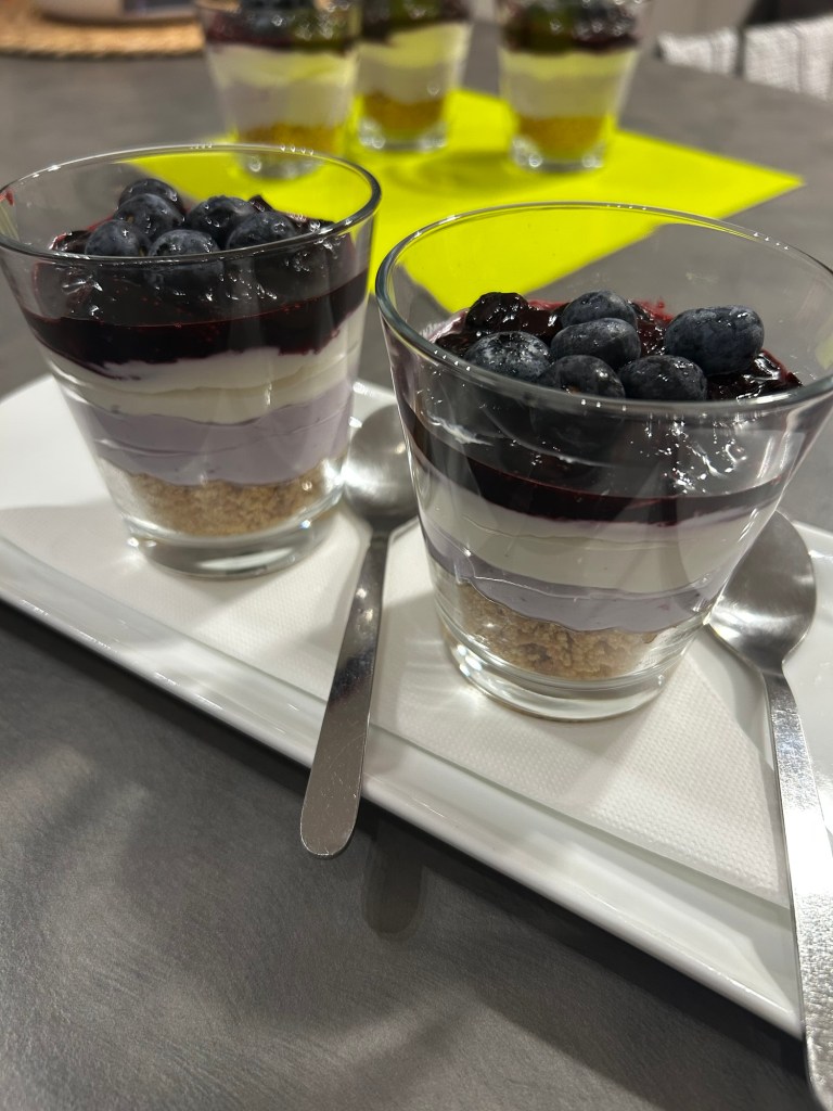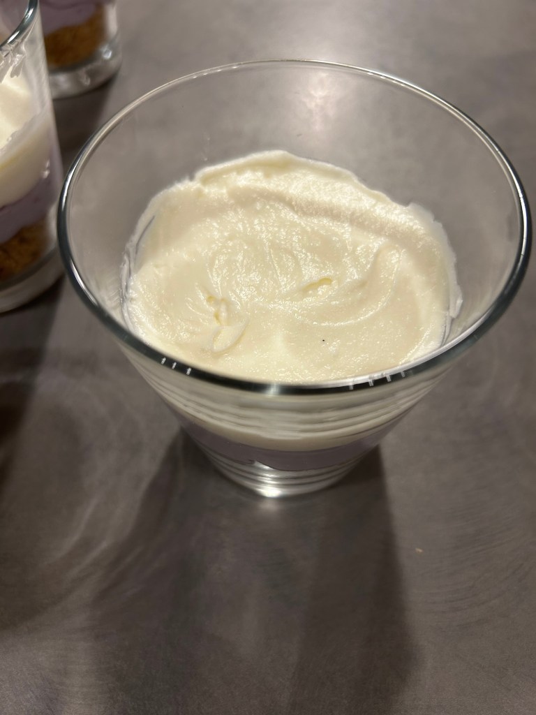 Suddivido i biscotti nei bicchierini pressandoli un po’, suddivido la crema viola nei bicchierini, io mi sono aiutata con un sac a poche
