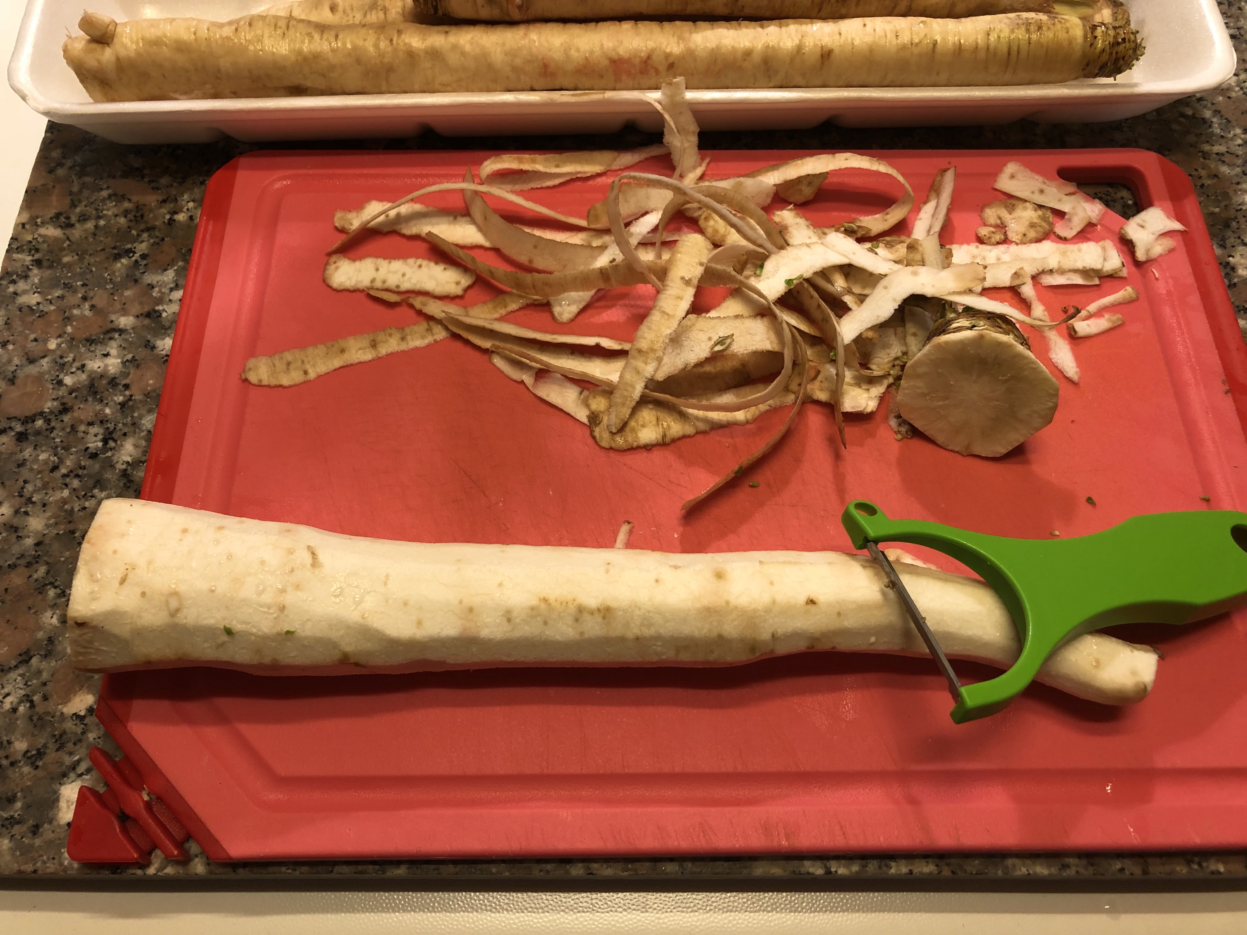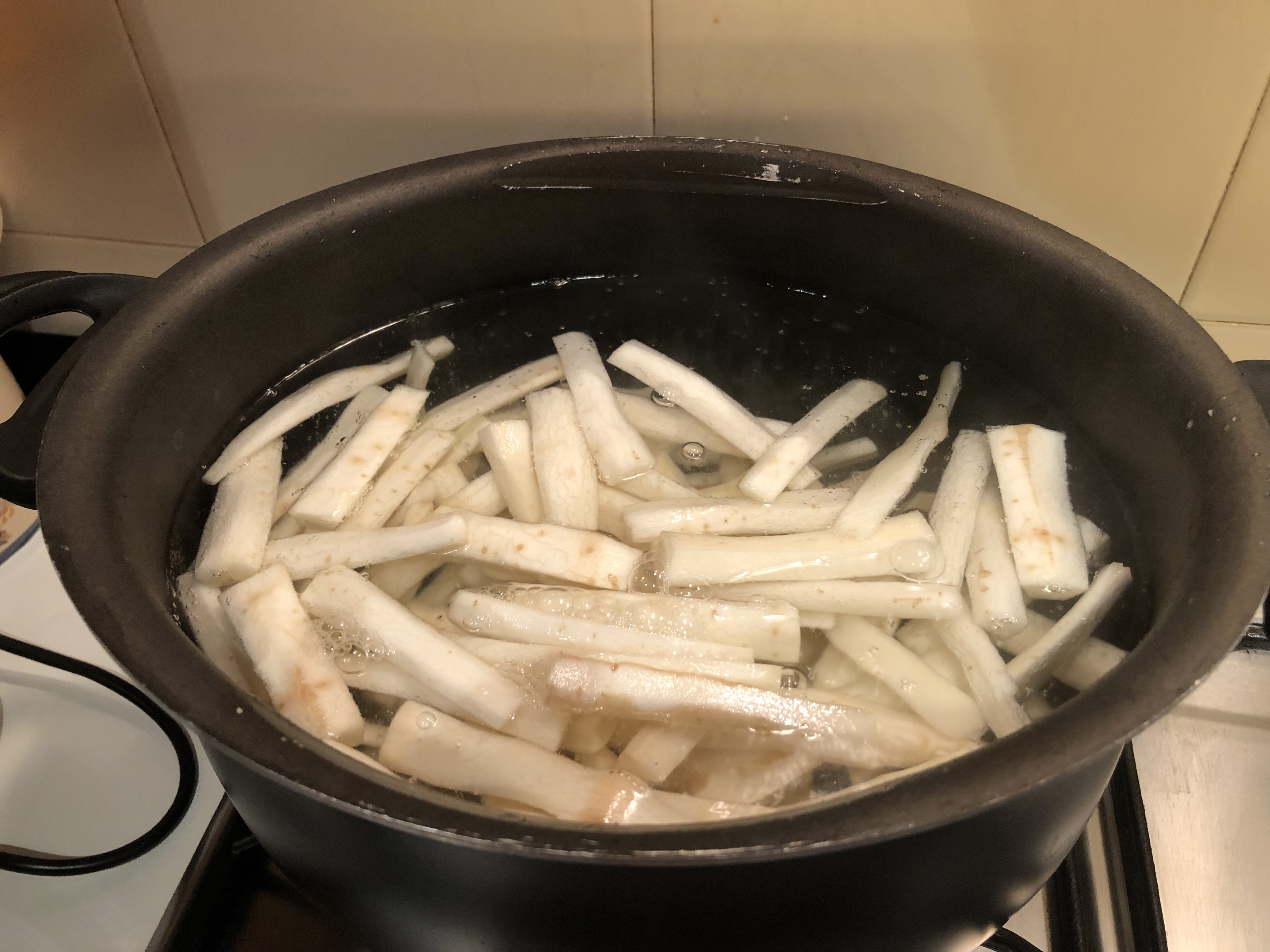 Porto a bollore una pentola con acqua acidulata con un bicchiere di aceto e salata e faccio lessare le radici finché diventano tenere 15/20 minuti