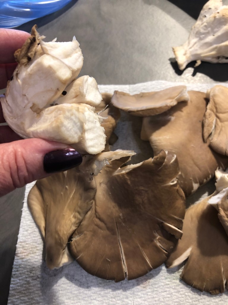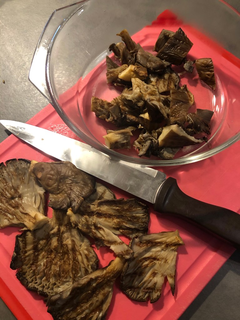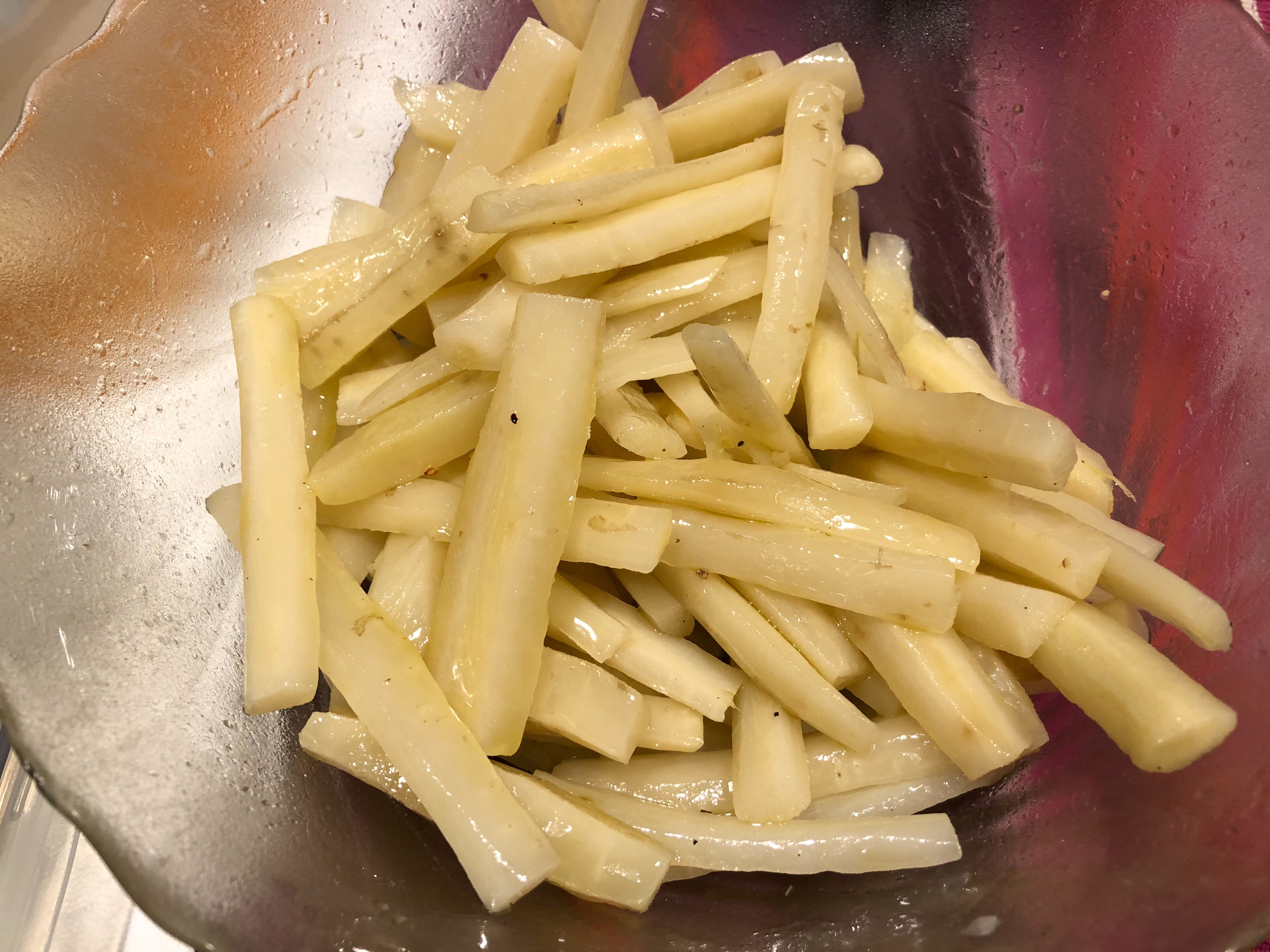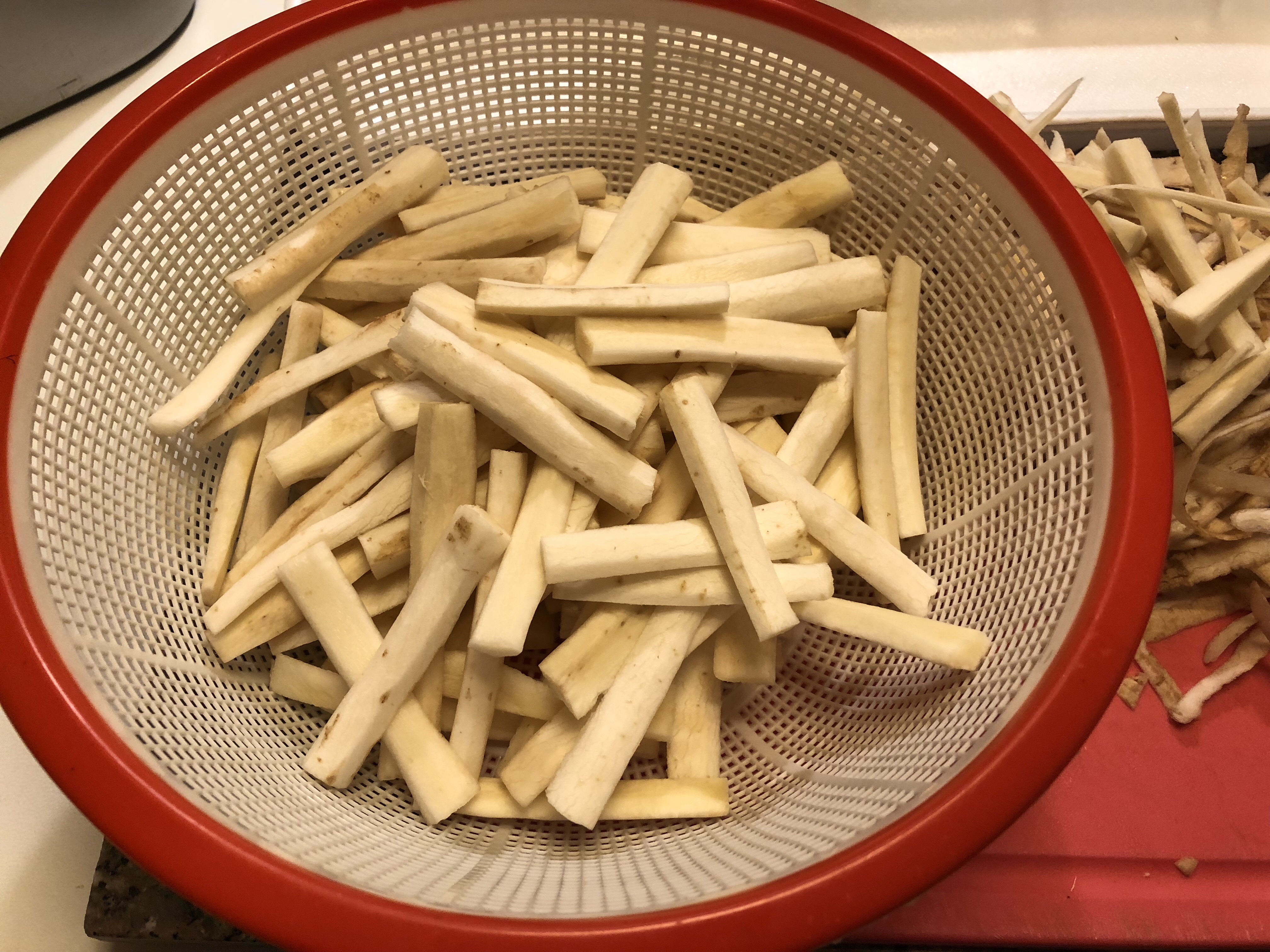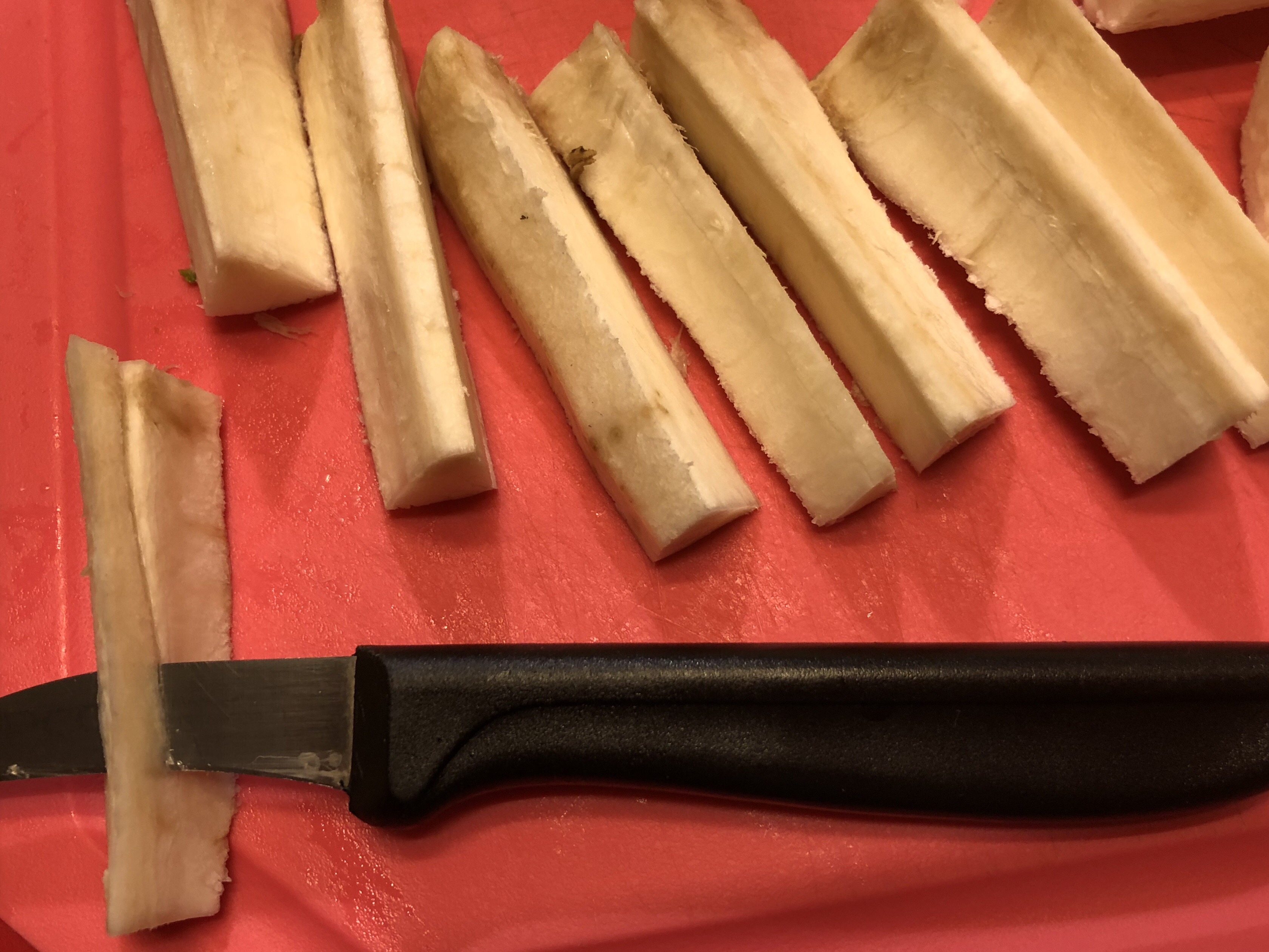 Taglio le radici a pezzetti e ogni pezzetto lo divido in 4 ed elimino con uno spelucchino la parte centrale molto dura e fibrosa