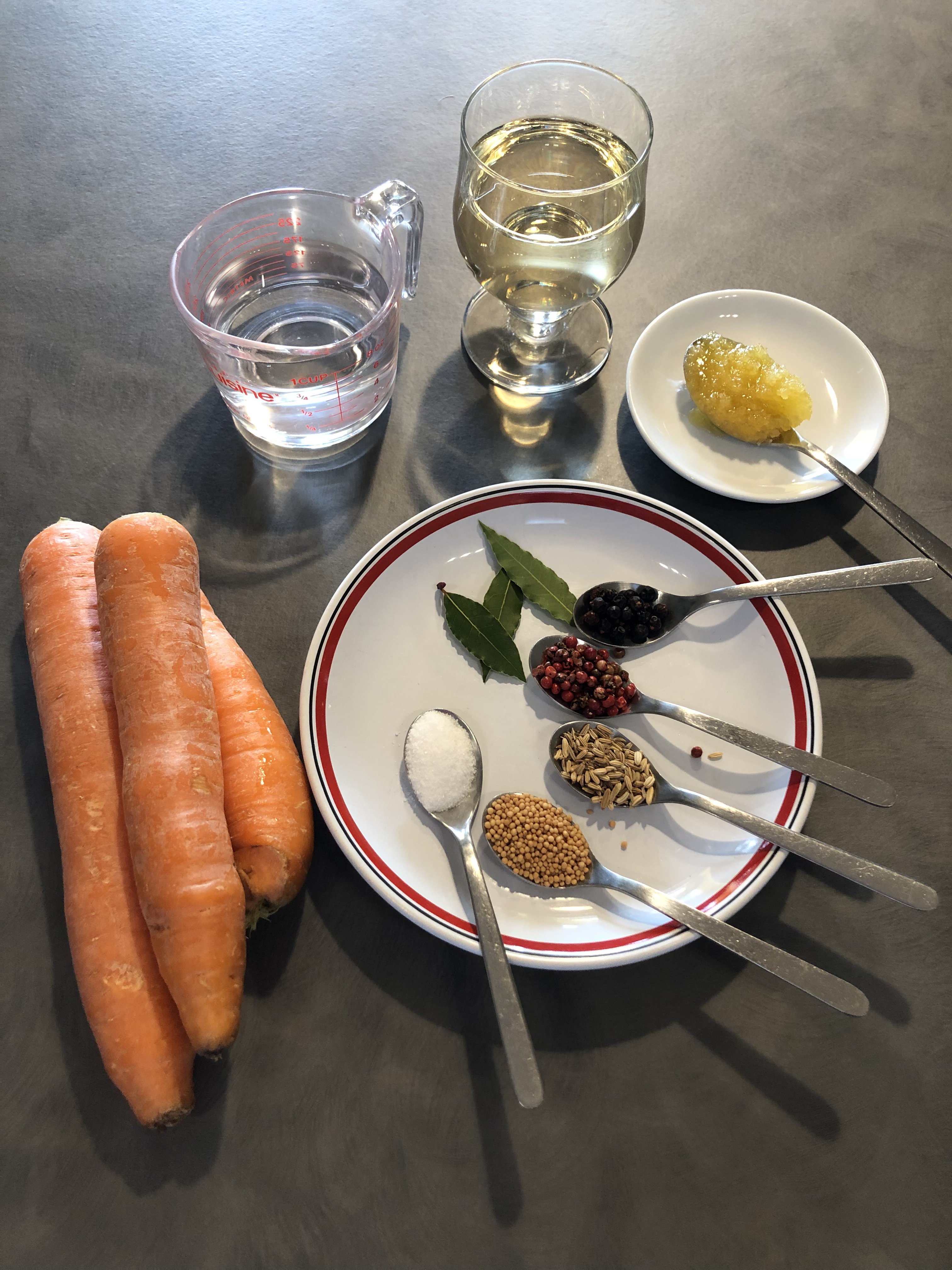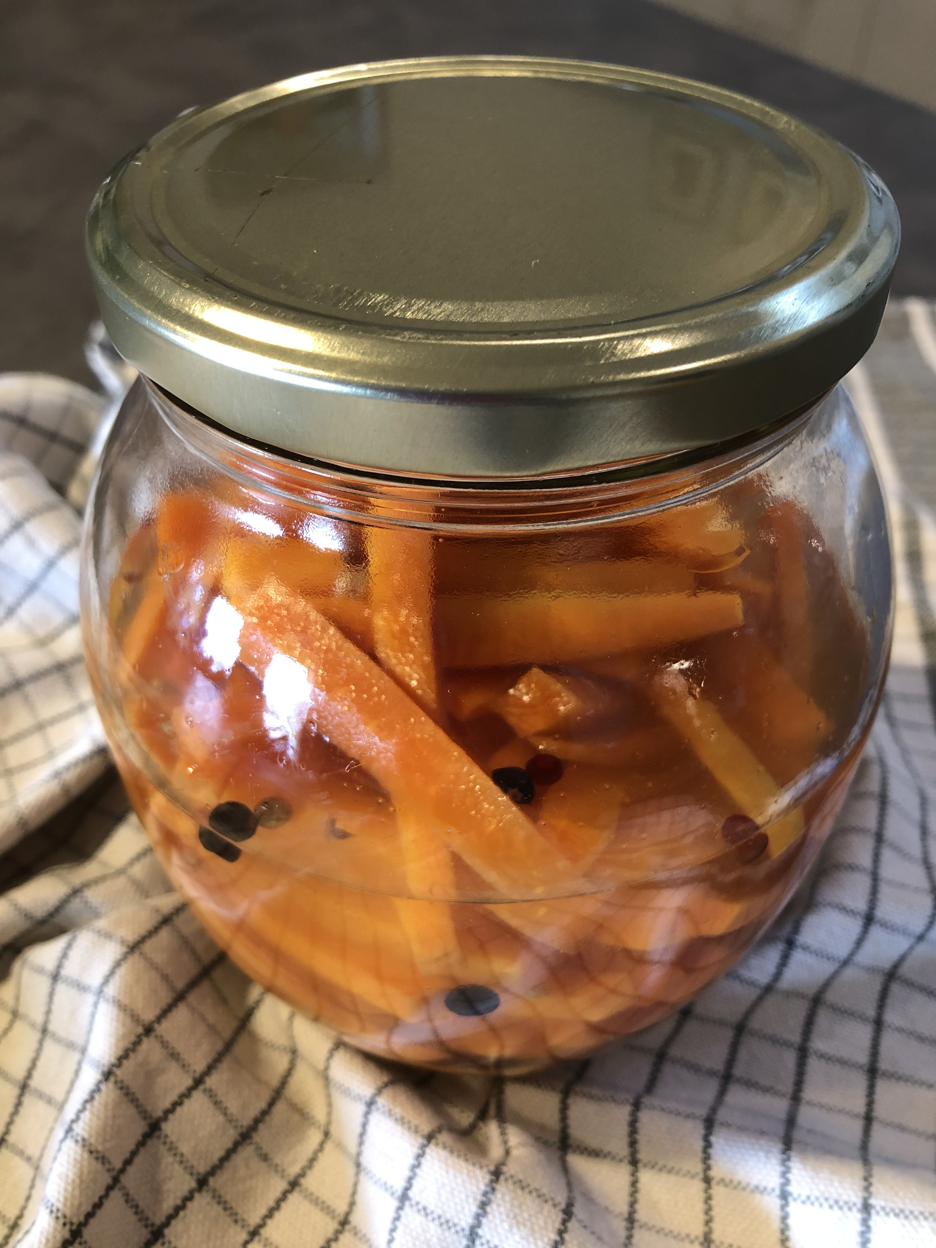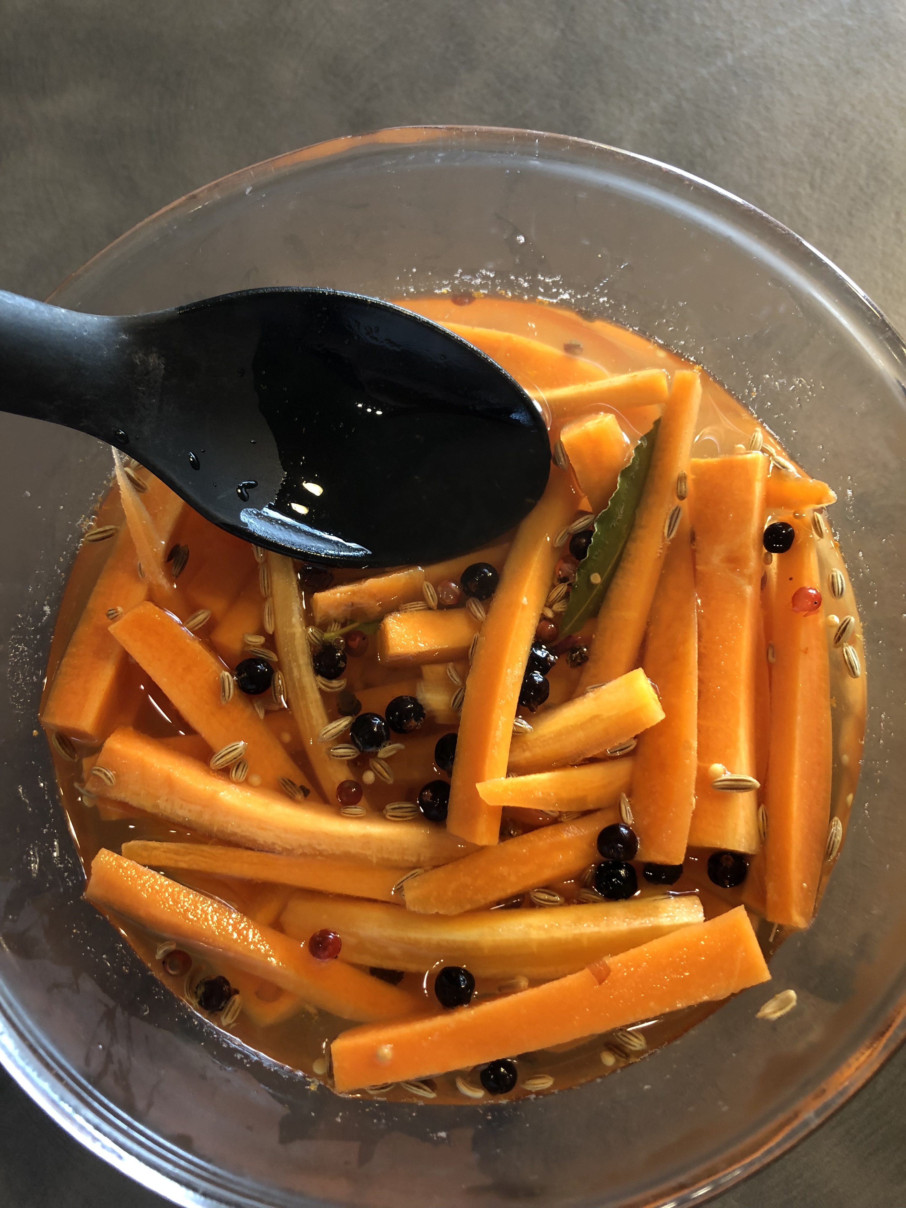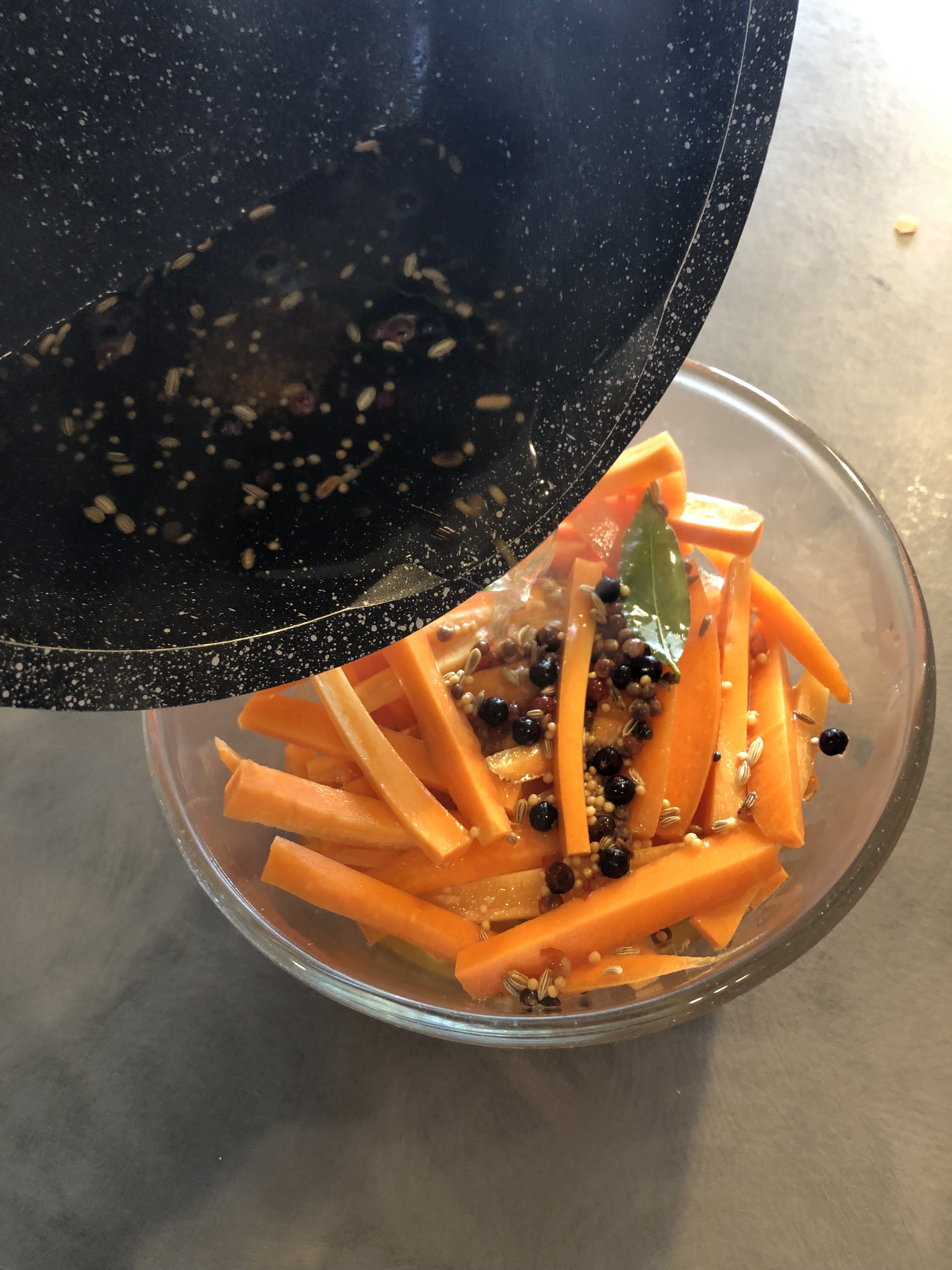 Porto a bollore mescolando in modo che il sale il miele siano sciolti, verso il liquido con tutti gli aromi sulle carote