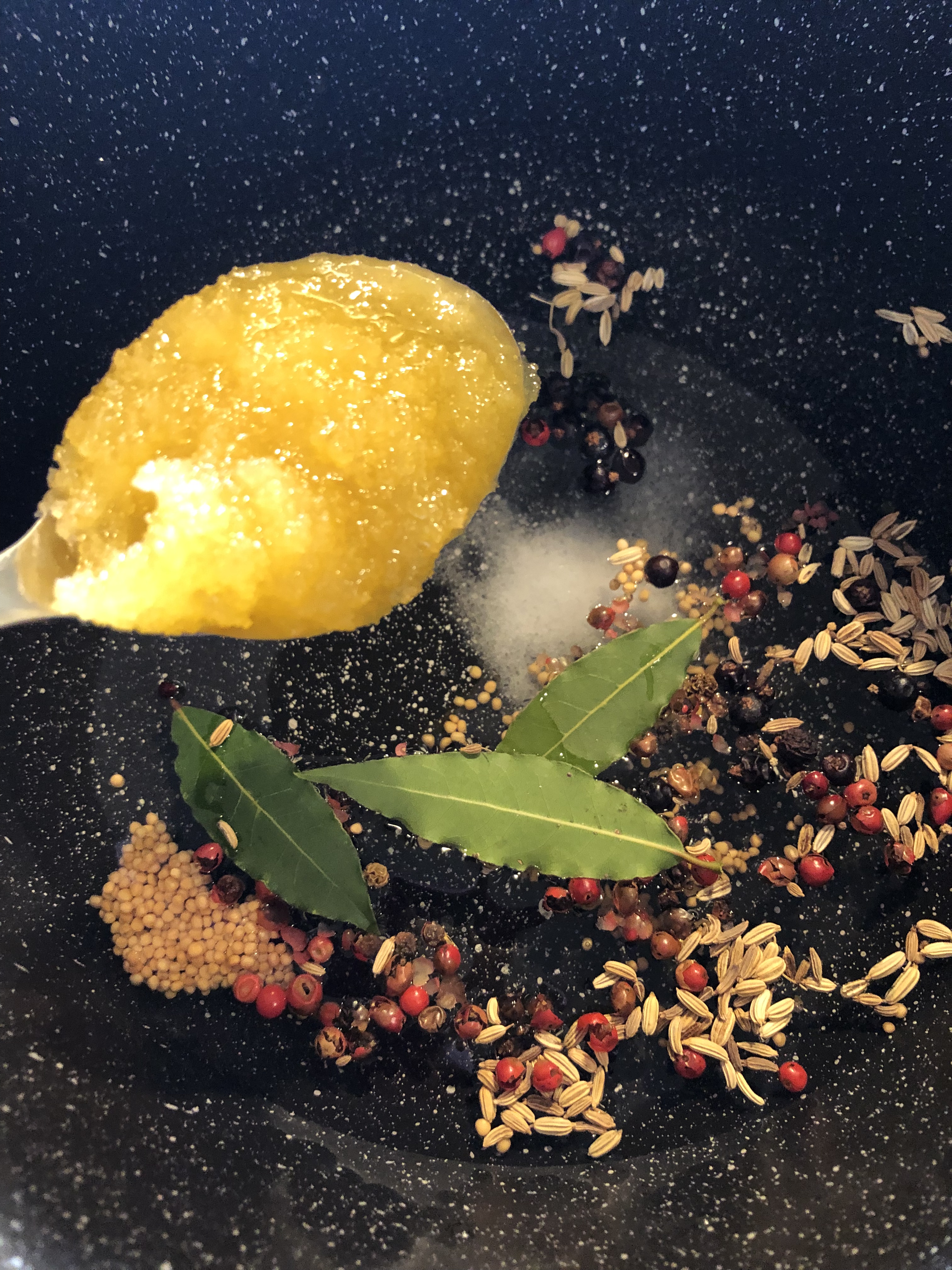 In un pentolino verso l’acqua, l”aceto, il sale, il miele, le foglie di alloro e tute le bacche