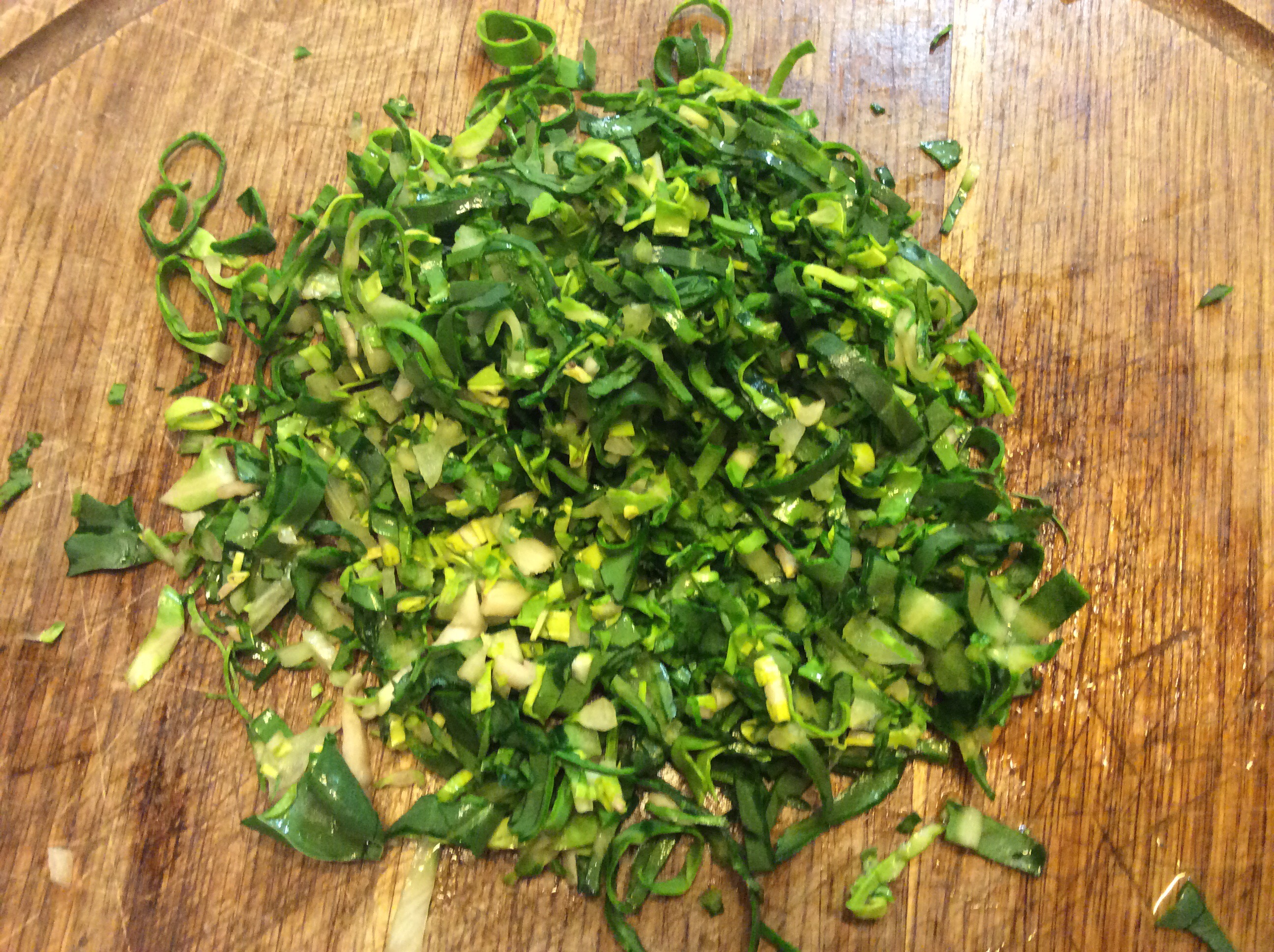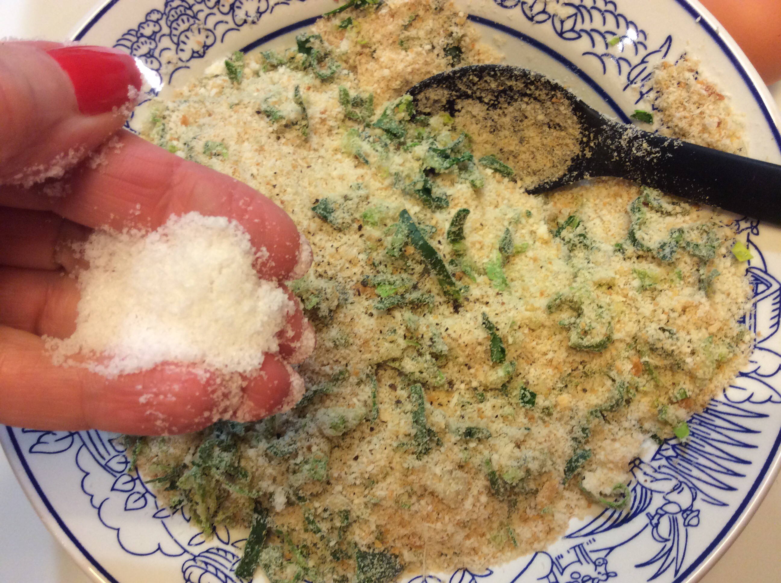 Unisco le foglie tritate, pepe e sale un ciuffo di prezzemolo tritato