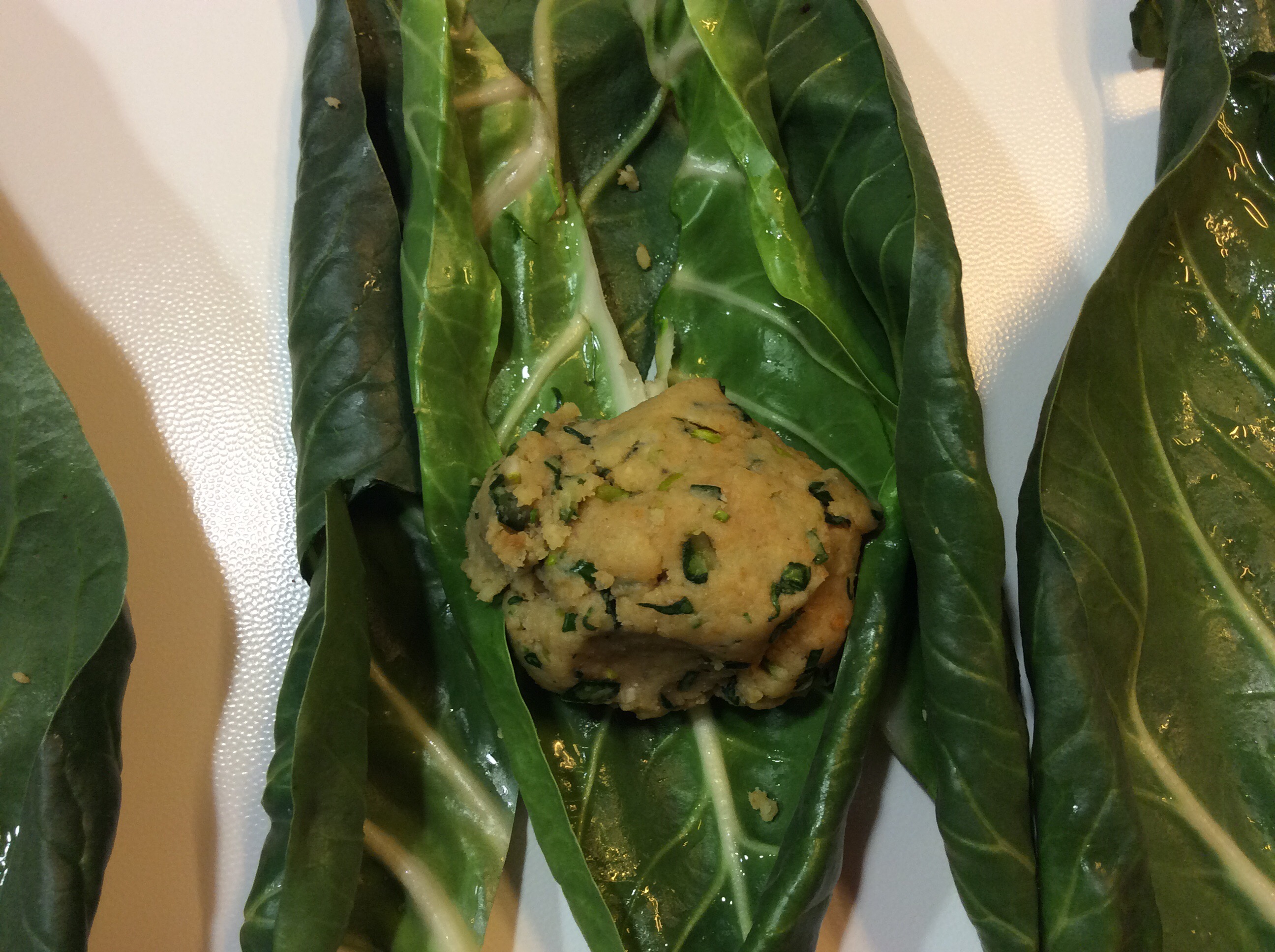 Suddivido il ripieno in 5 parti e lo dispongo sulle foglie, potete sovrapporre anche 2 foglie
