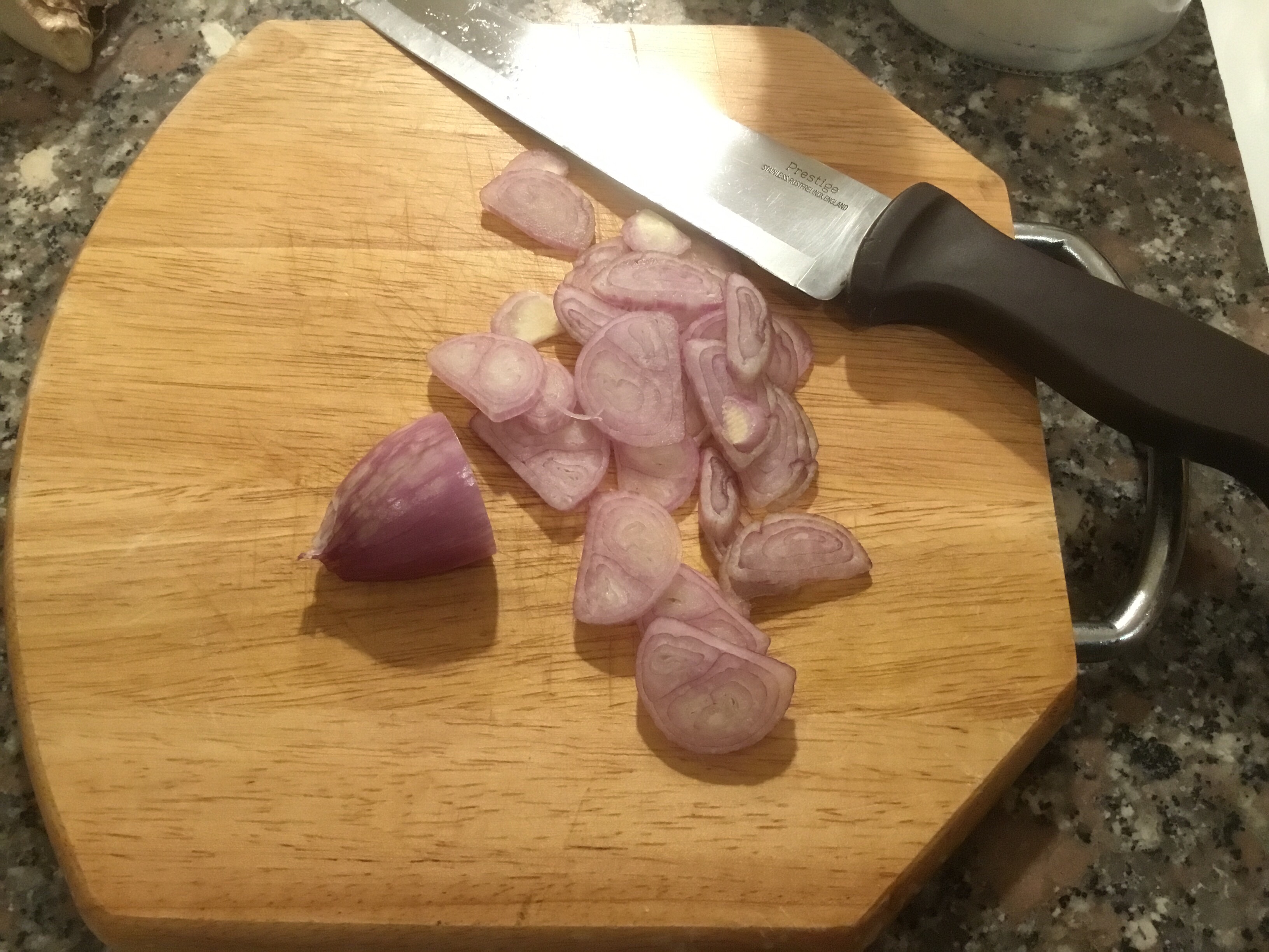 Sbuccio lo scalogno e lo taglio a fettine sottili