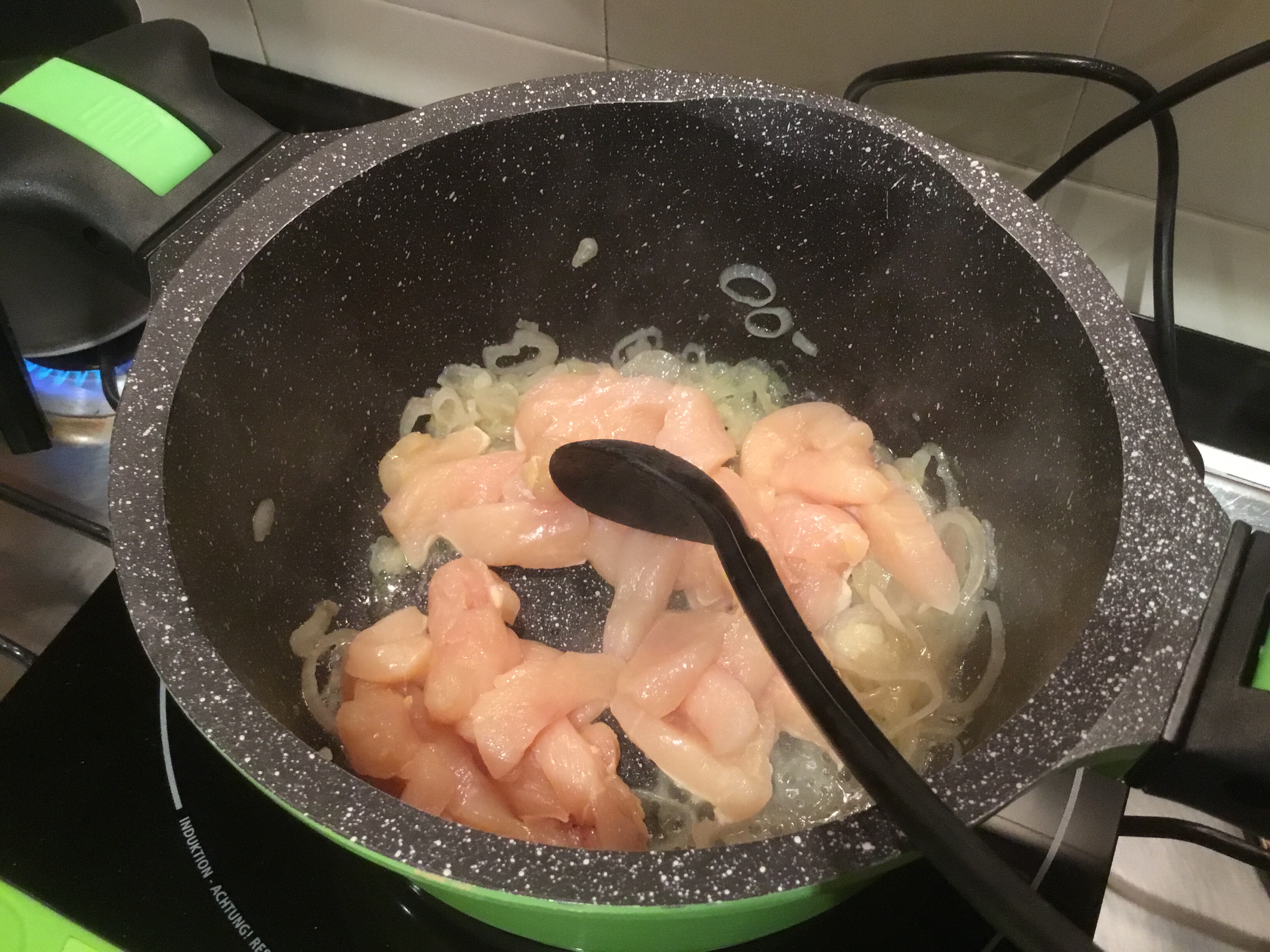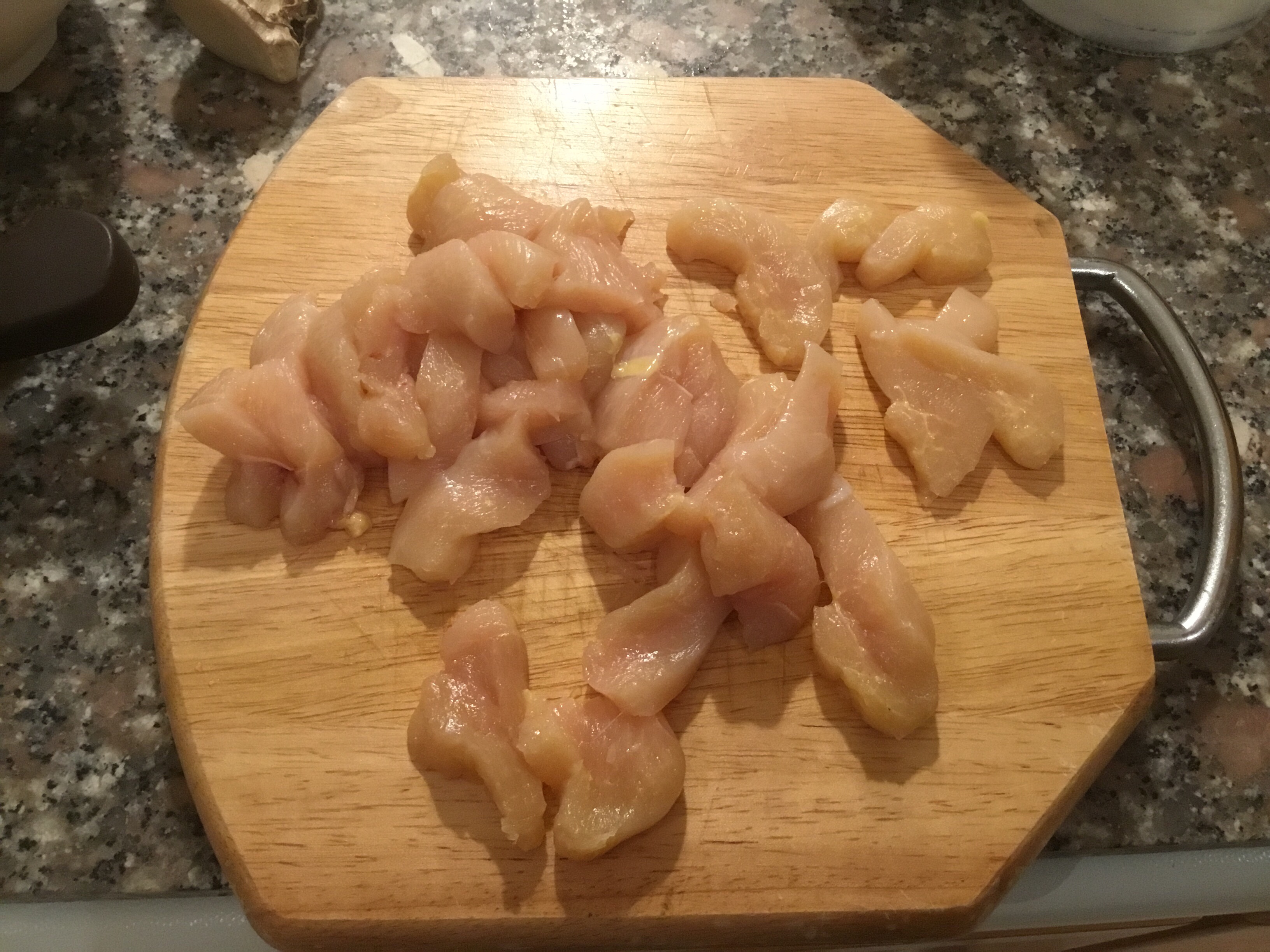 Preparo il petto di pollo eliminando le parti grasse e taglio delle striscioline