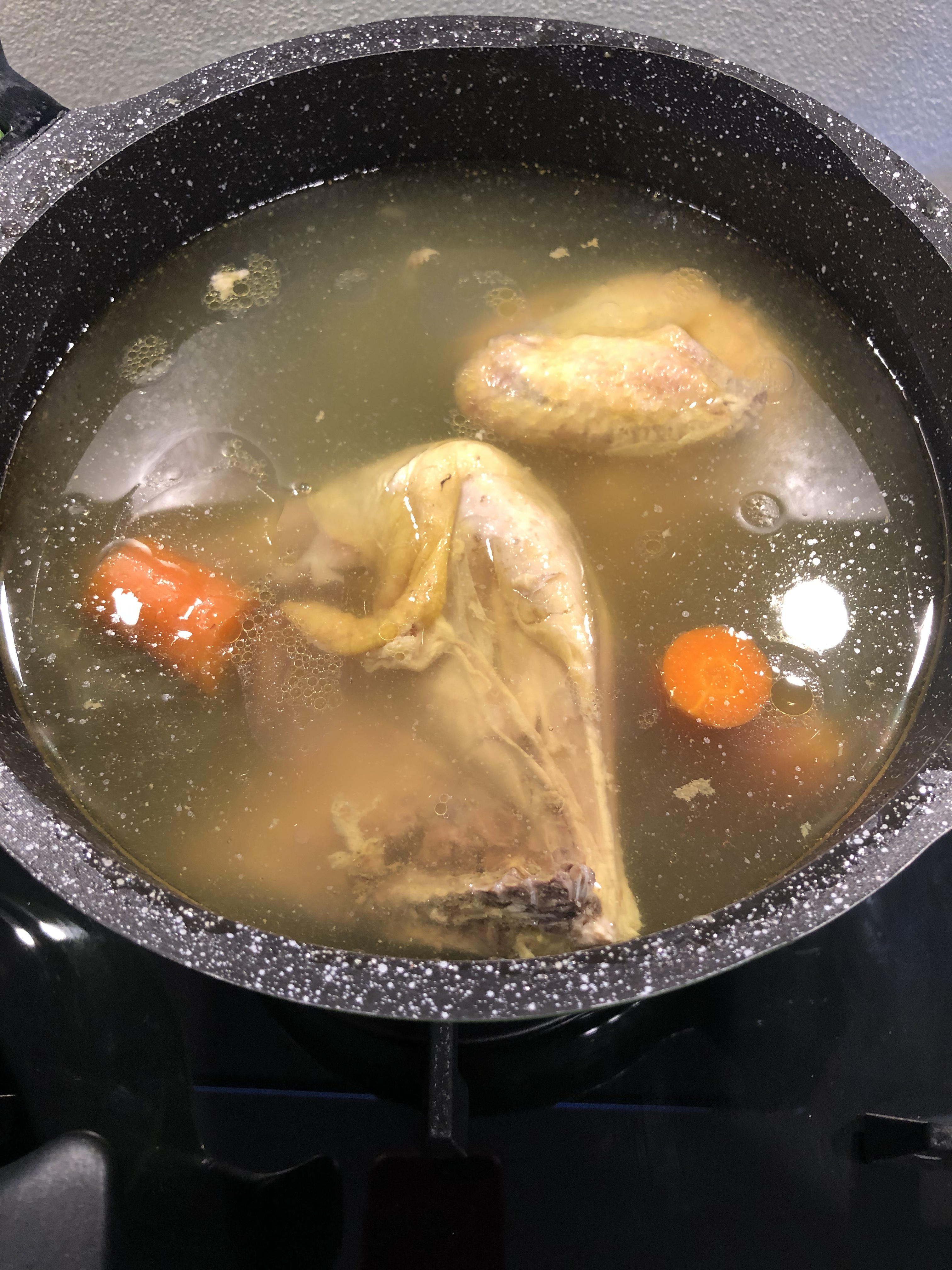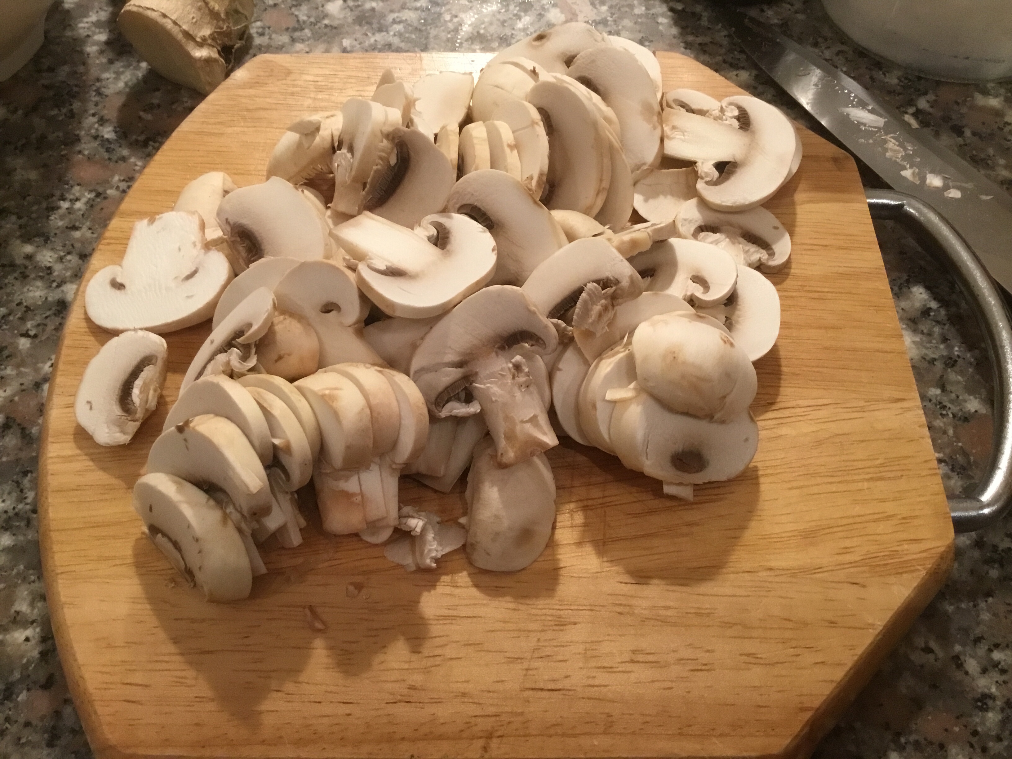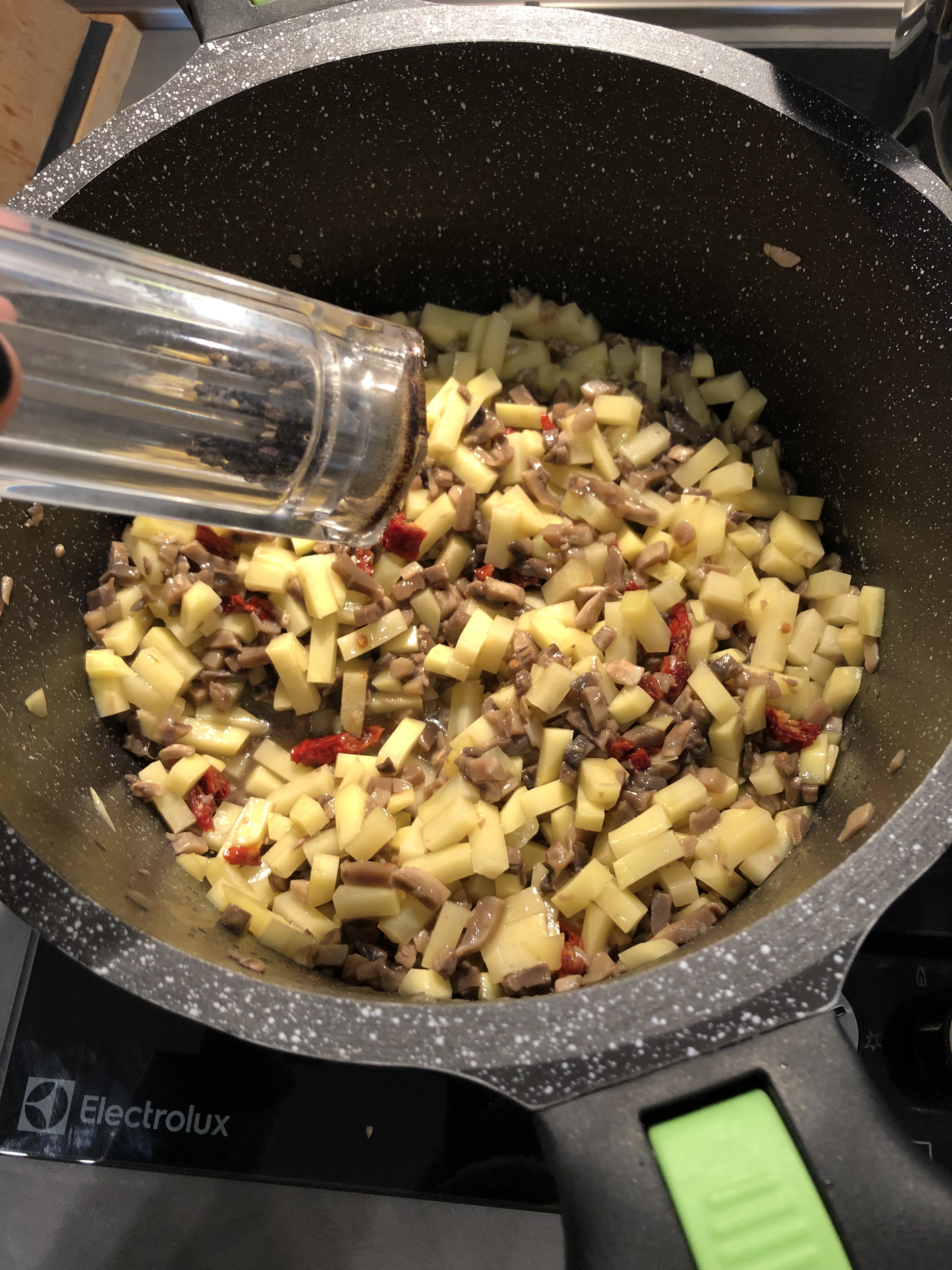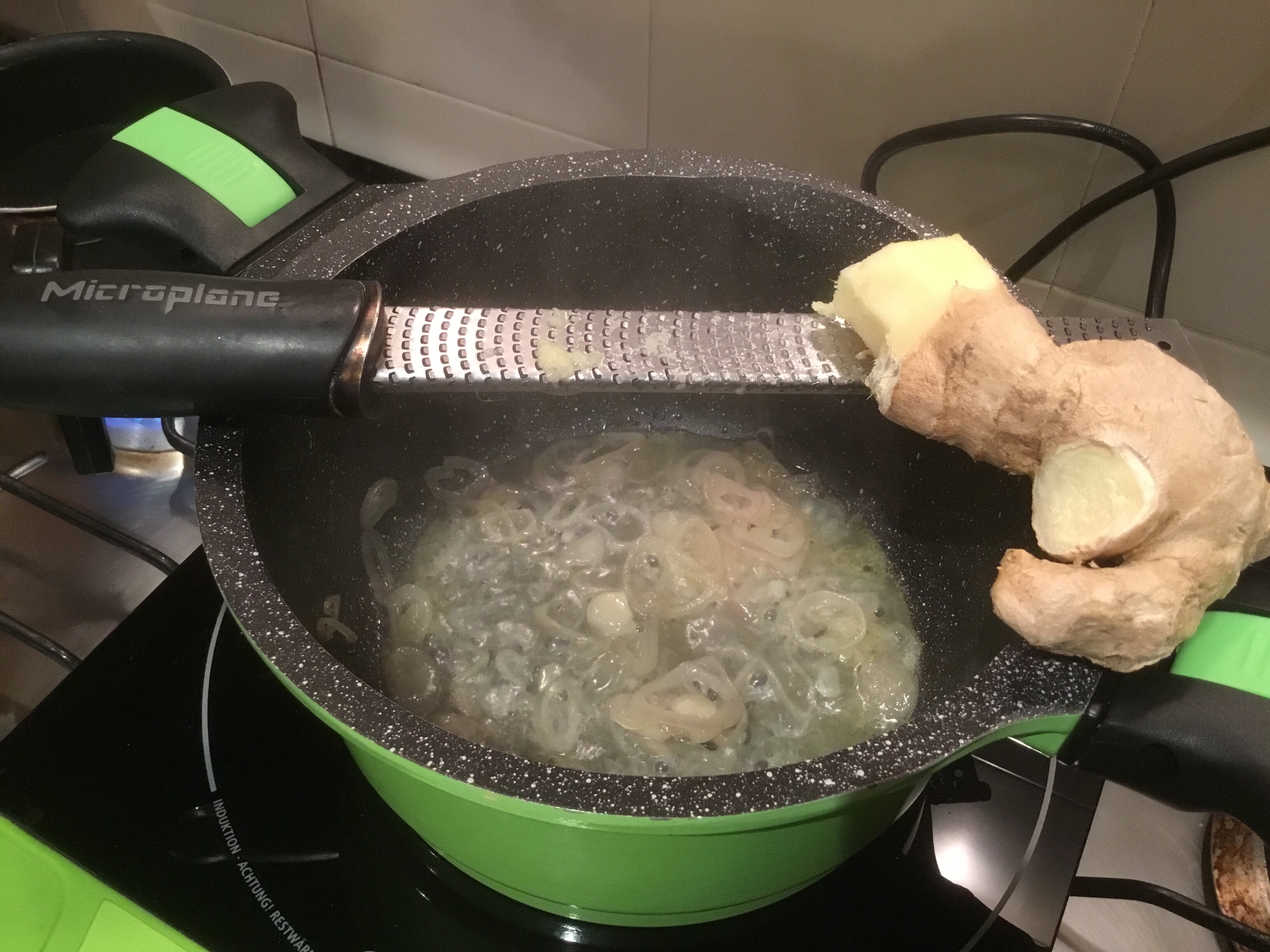 Lo metto in una padella senza condimento e lo lascio stufare per 5 minuti aggiungendo qualche cucchiaio di brodo vegetale preparato nella maniera classica con sedano, carota, cipolla e poco sale, se siete pigri fatelo con un buon dado, grattugio un pezzetto di zenzero dopo averlo sbucciato