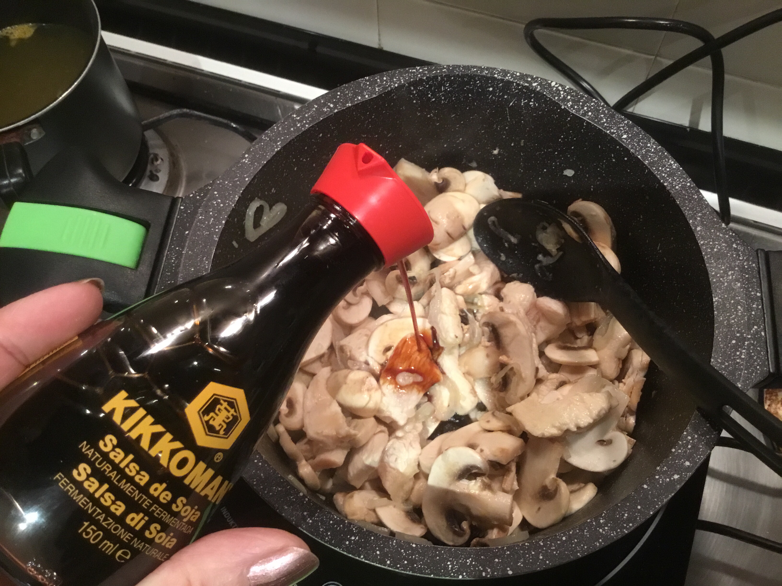 Aggiungo la salsa di soia a piacere circa 3/4 cucchiai, se vi piace un gusto più intenso aggiungetene di più