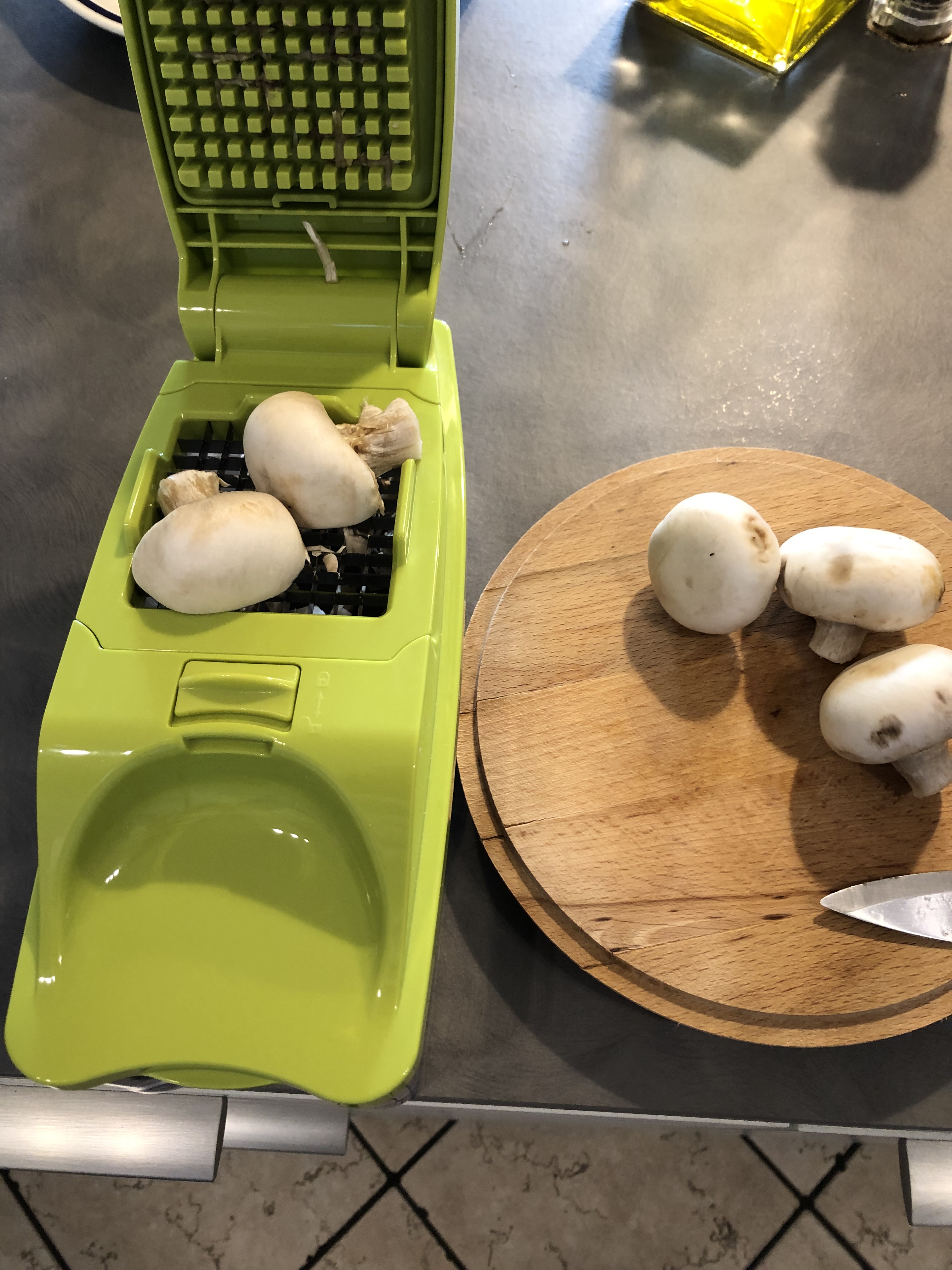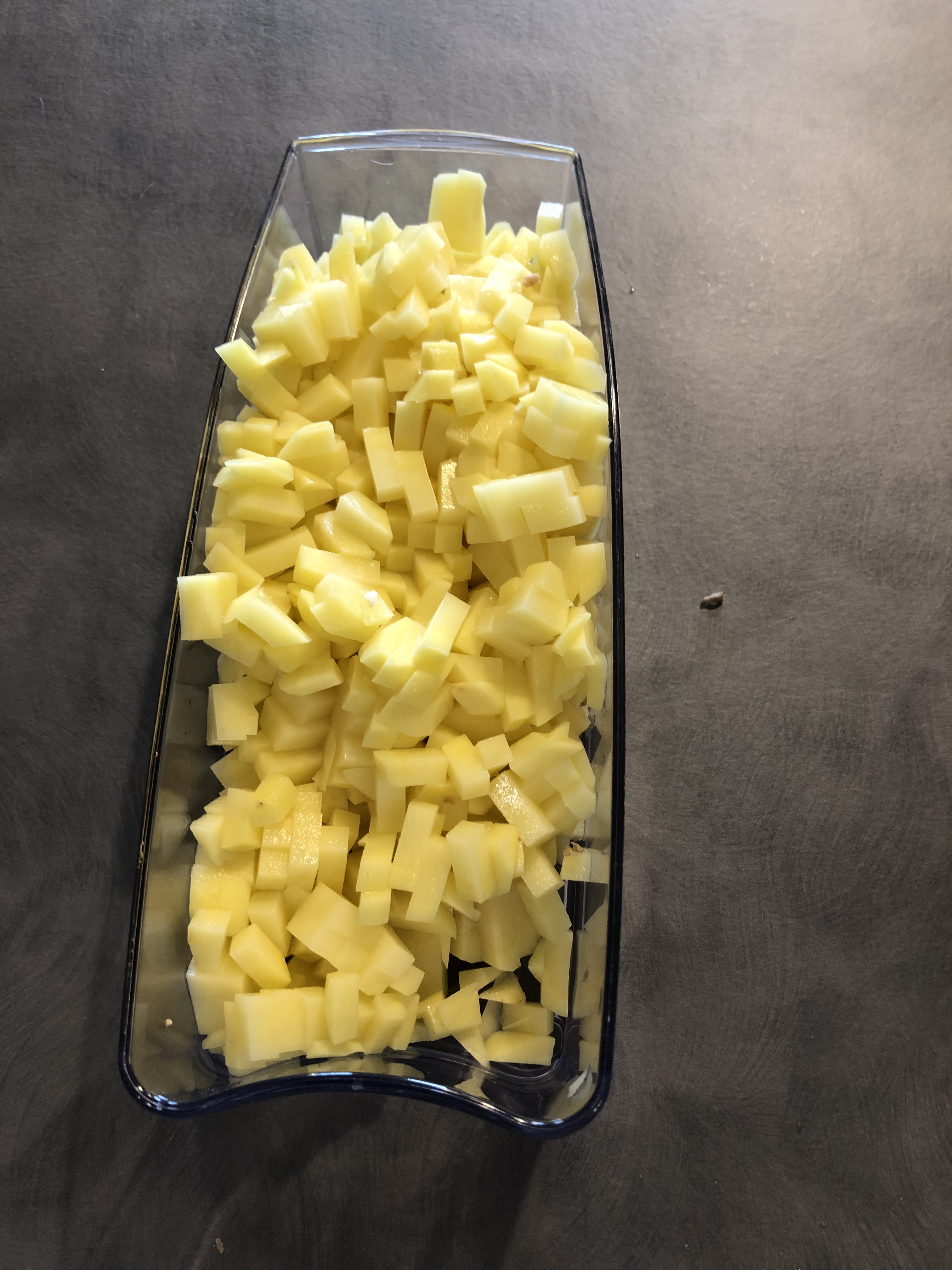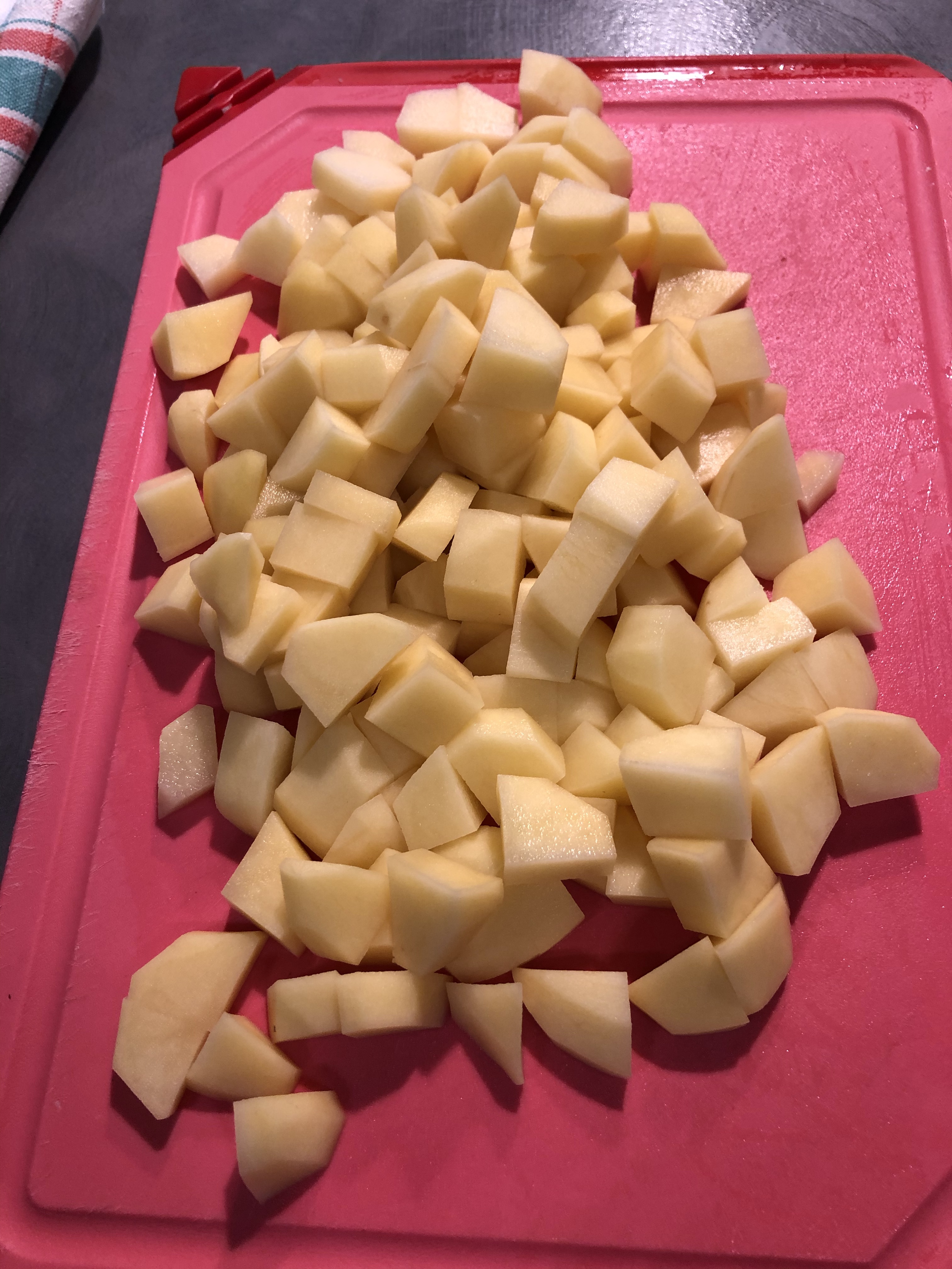 Taglio a cubetti molto piccoli, io ho questo attrezzo che é fantastico e velocizza il lavoro