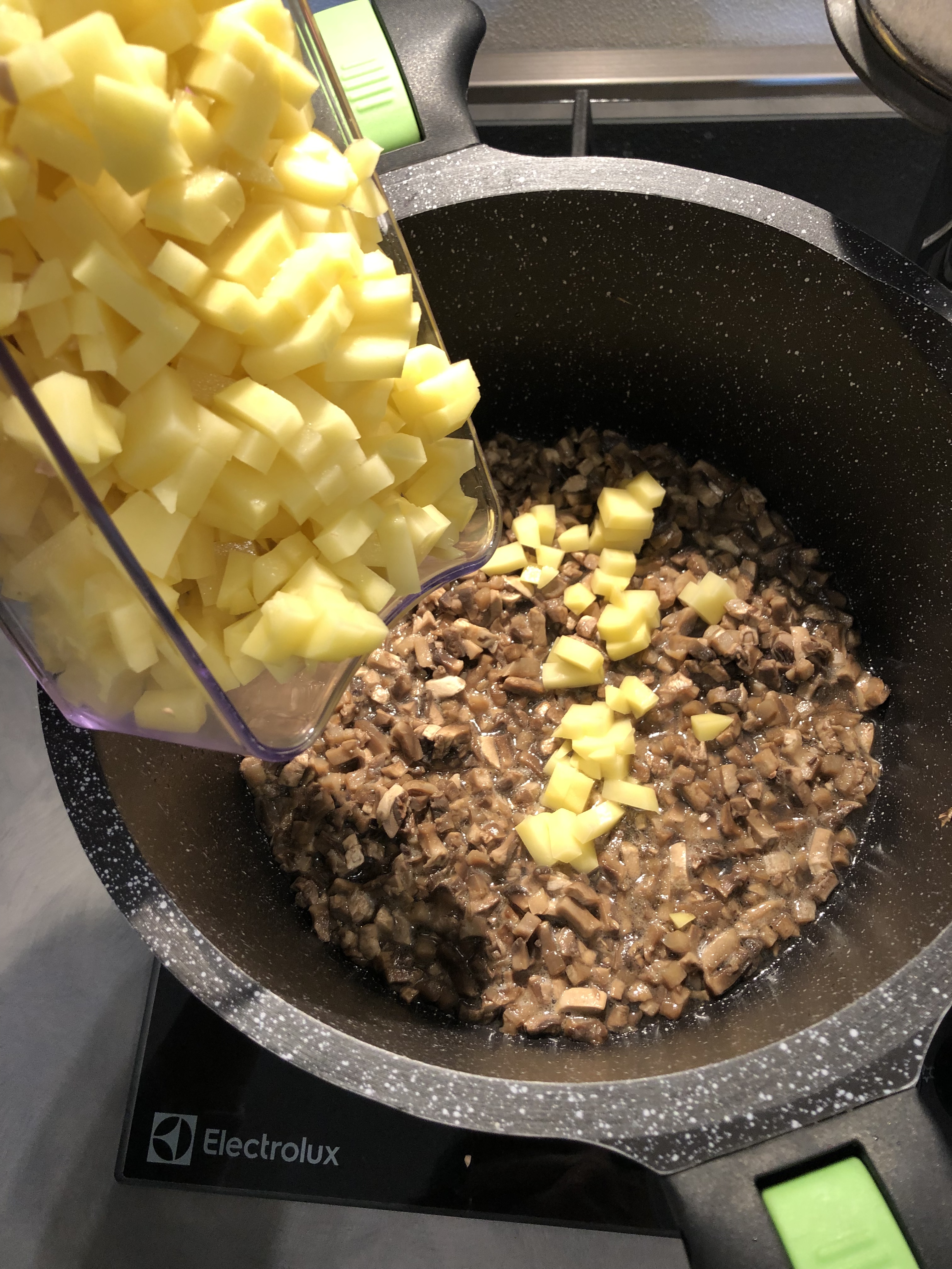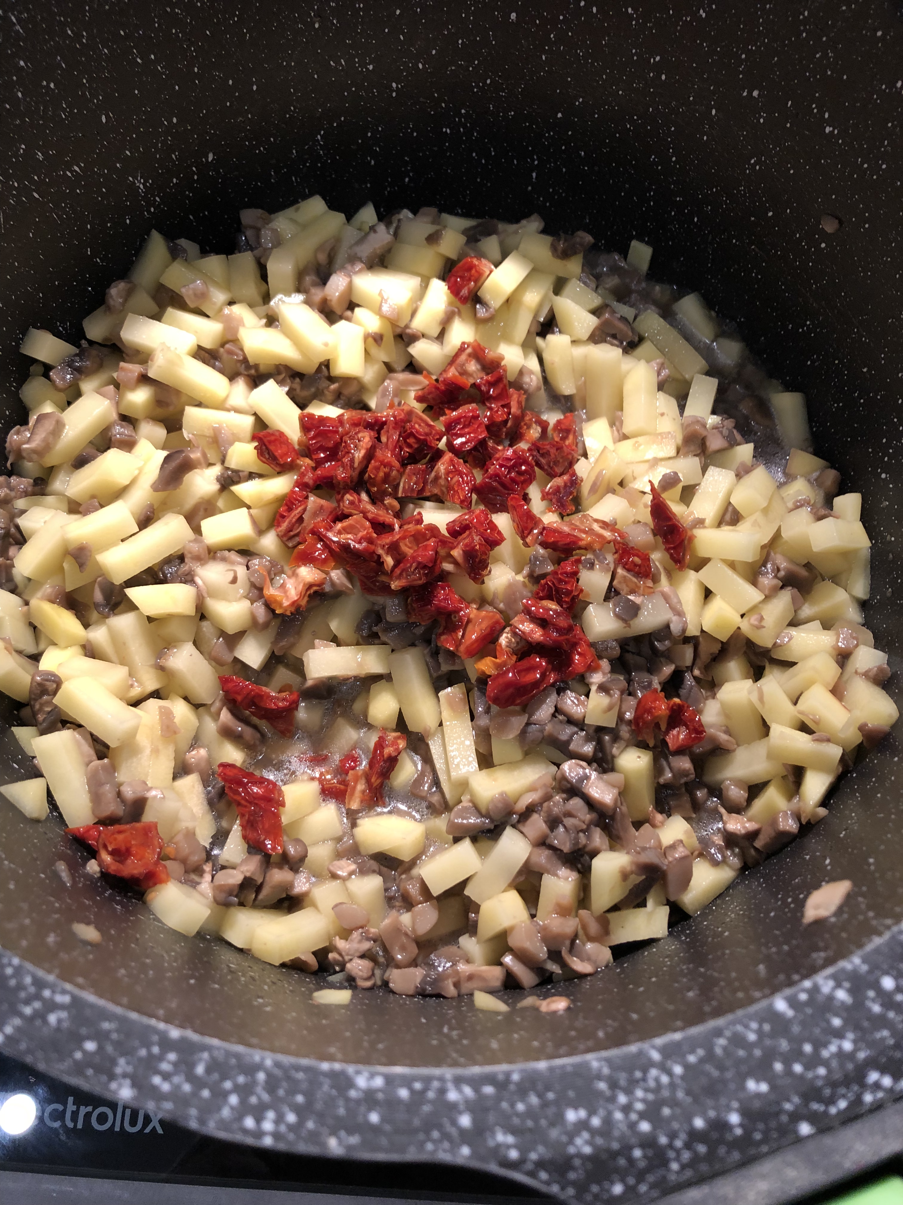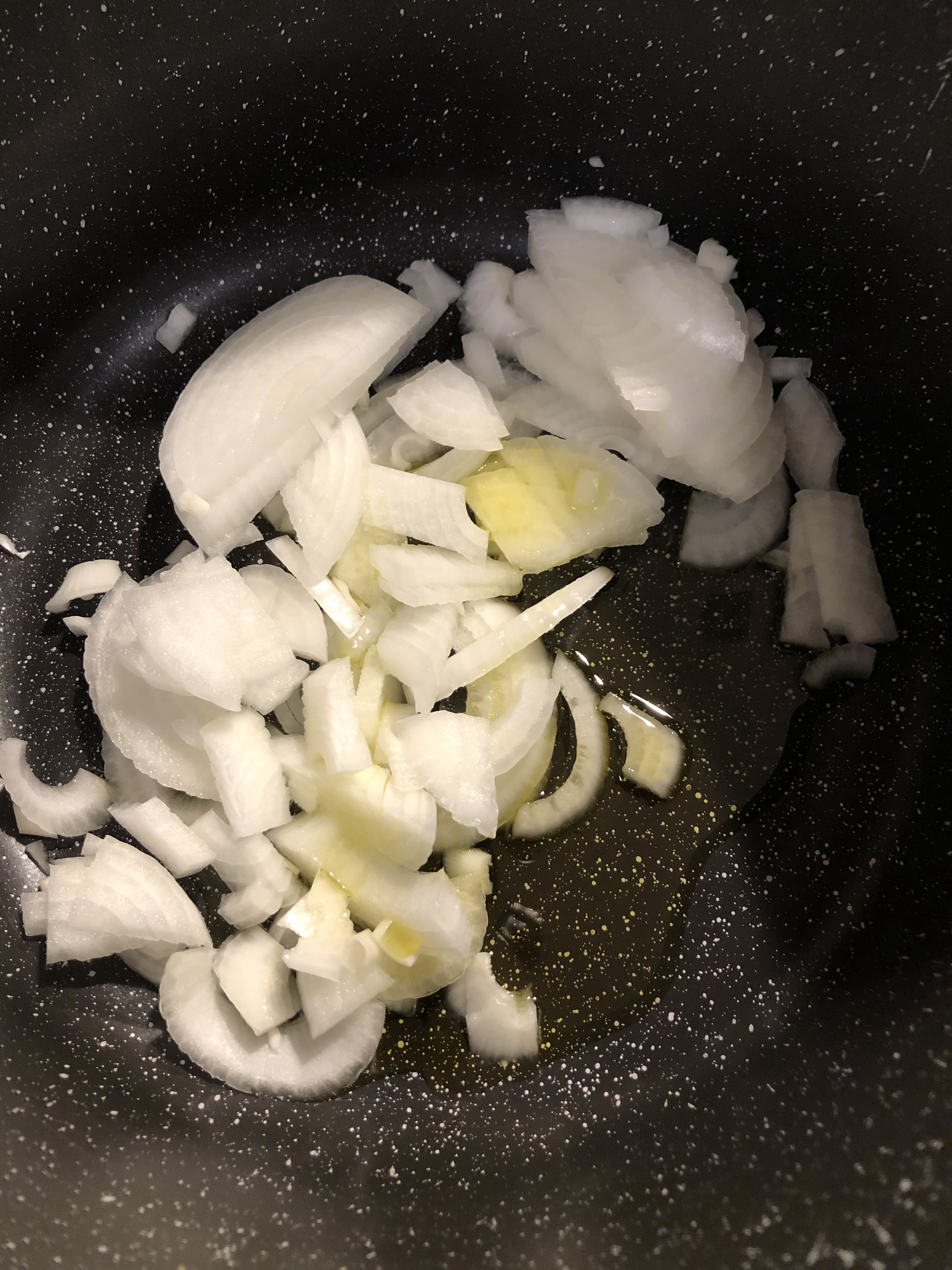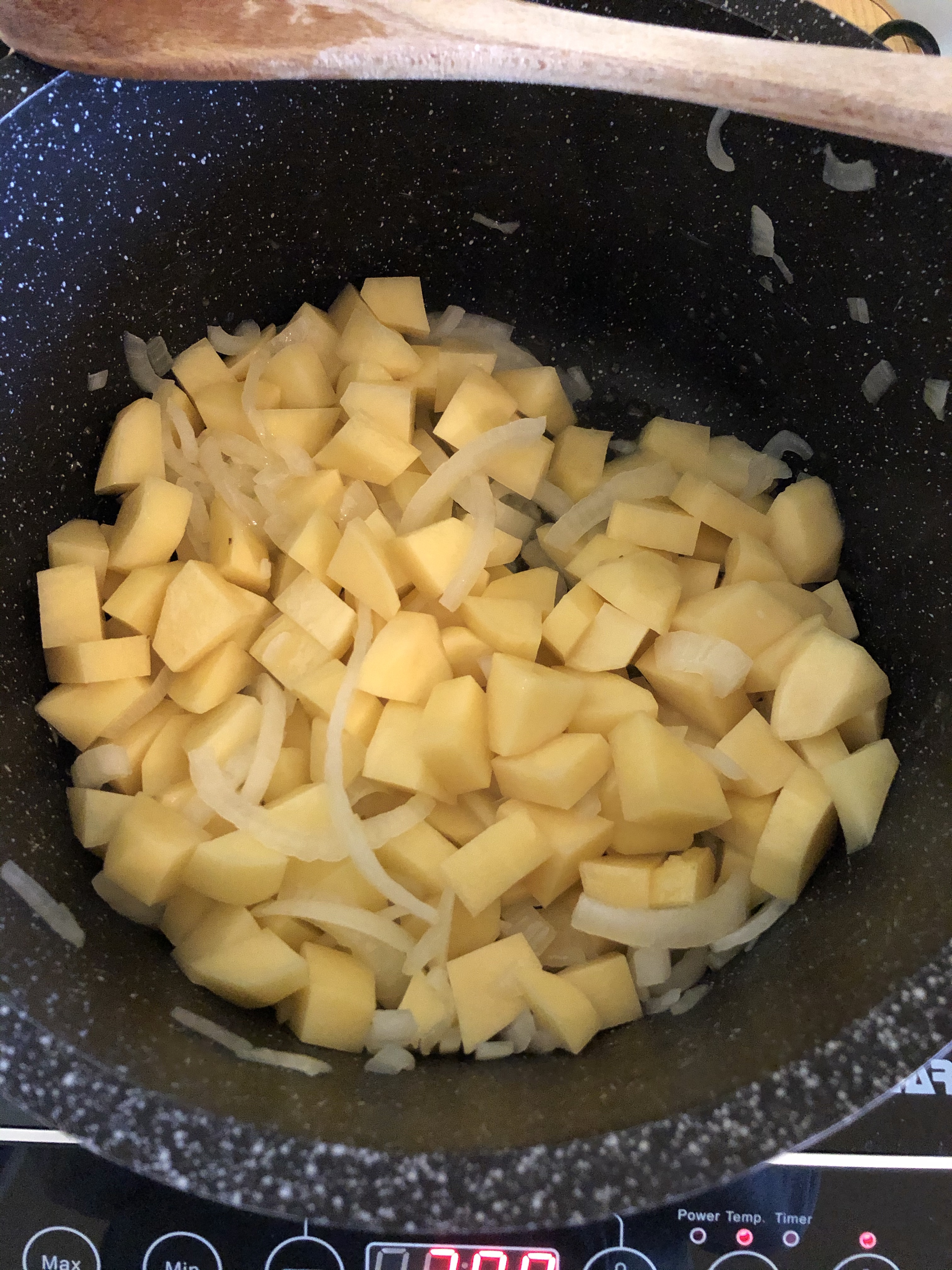 In una padella verso dell’olio e lascio soffriggere con la cipolla poi aggiungo le patate