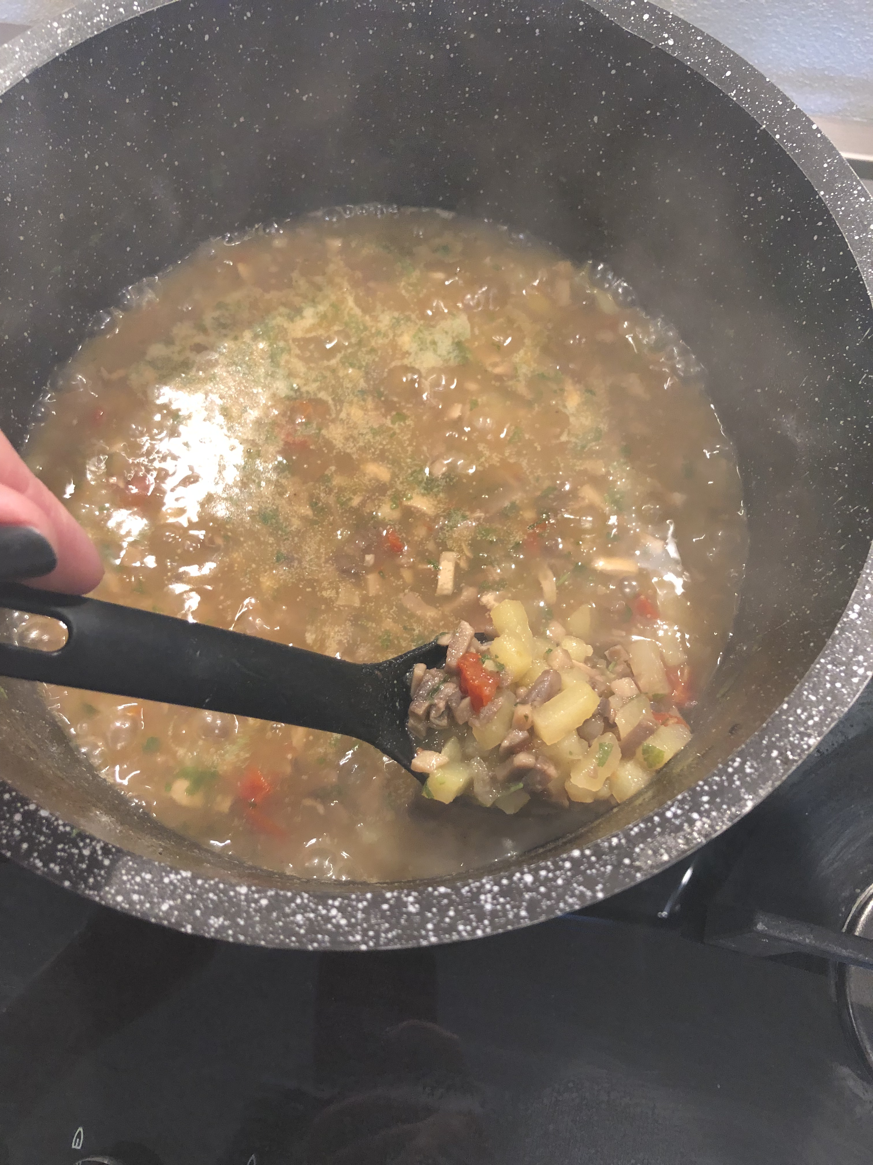 Copro con un coperchio e porto a cottura, ci vorranno circa 30/40 minuti, mescolo di tanto in tanto e aggiungo il brodo quando serve, deve risultare una zuppa densa, a cottura ultimata assaggio e se serve aggiungo sale e pepe, attenzione con il sale perché sia la salsiccia che il concentrato di pomodoro sono già molto saporiti, aggiungo del prezzemolo tritato