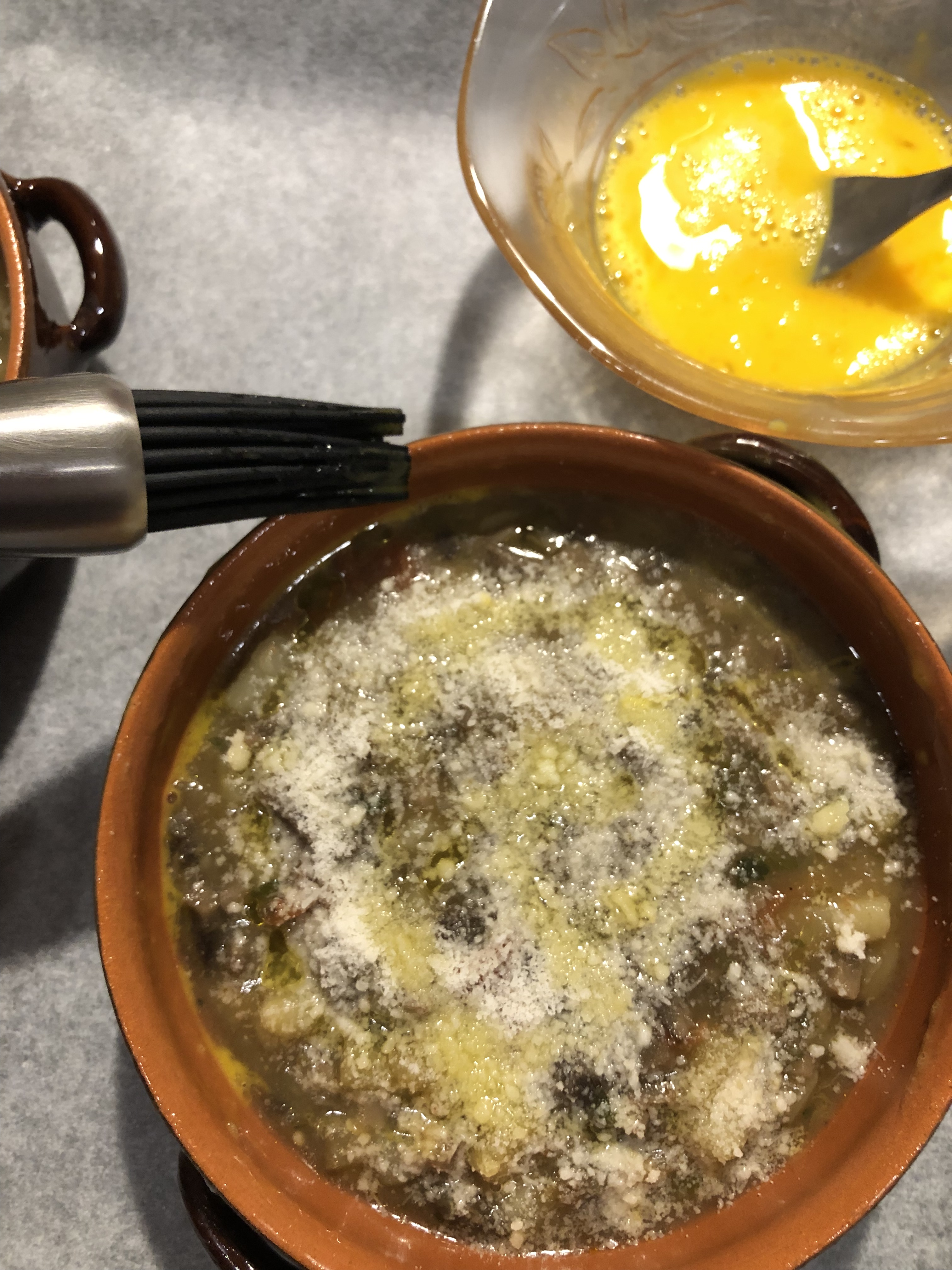 Distribuisco la zuppa nelle ciotole da forno in terracotta e aggiungo una spolverata di parmigiano grattugiato e un filo di olio