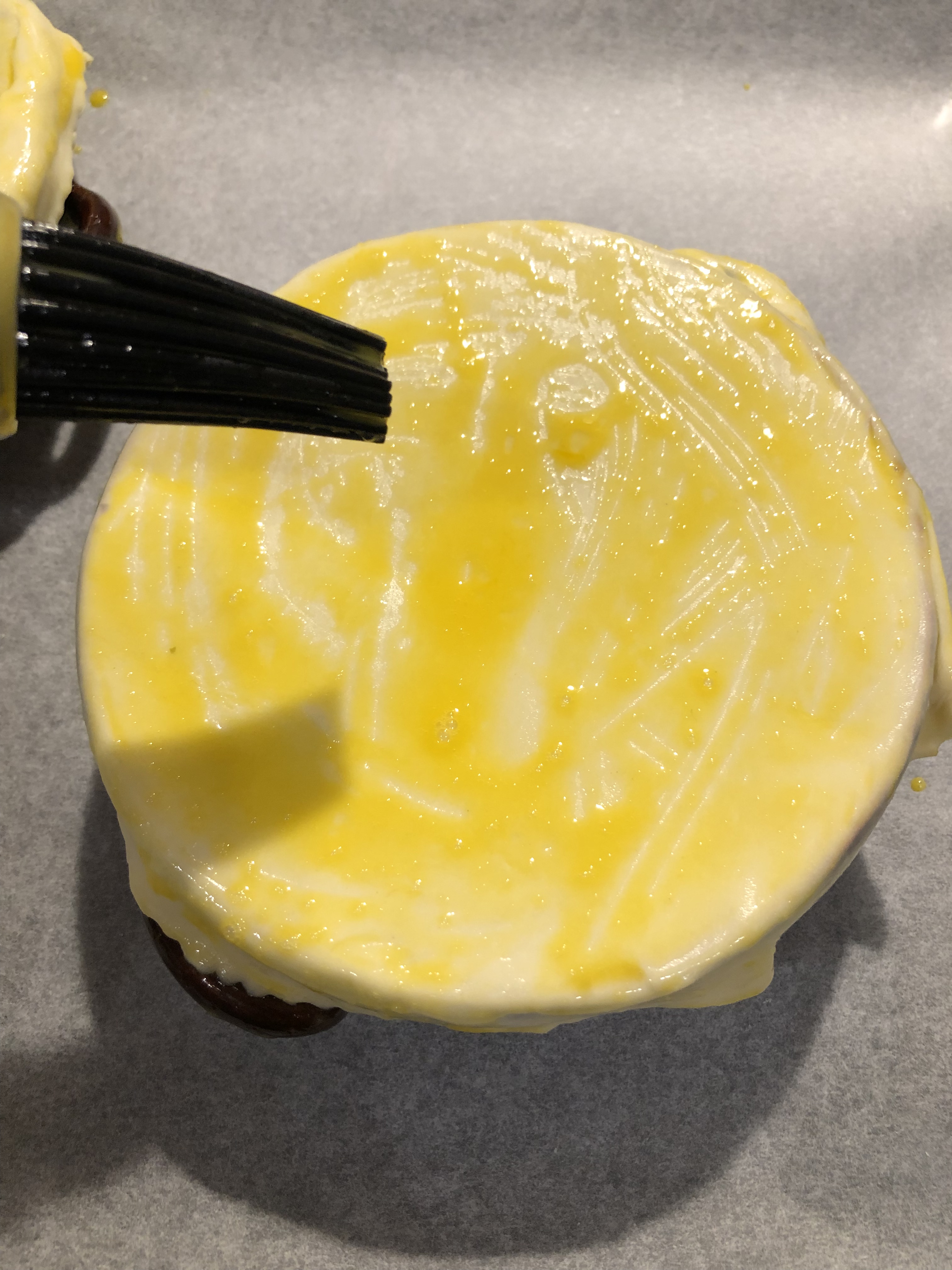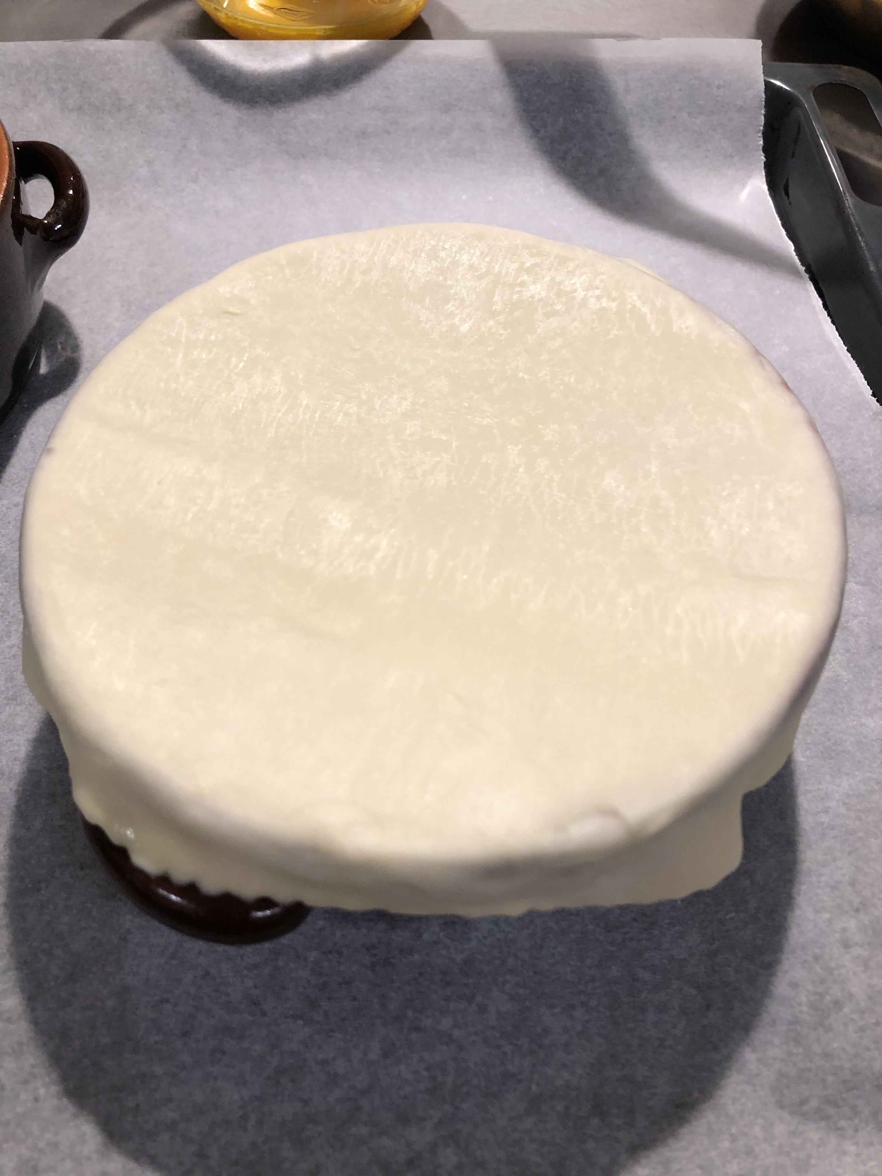 Appoggio ben teso il disco di sfoglia che ho ritagliato un paio di cm più larghi della circonferenza della ciotola e sigillo bene