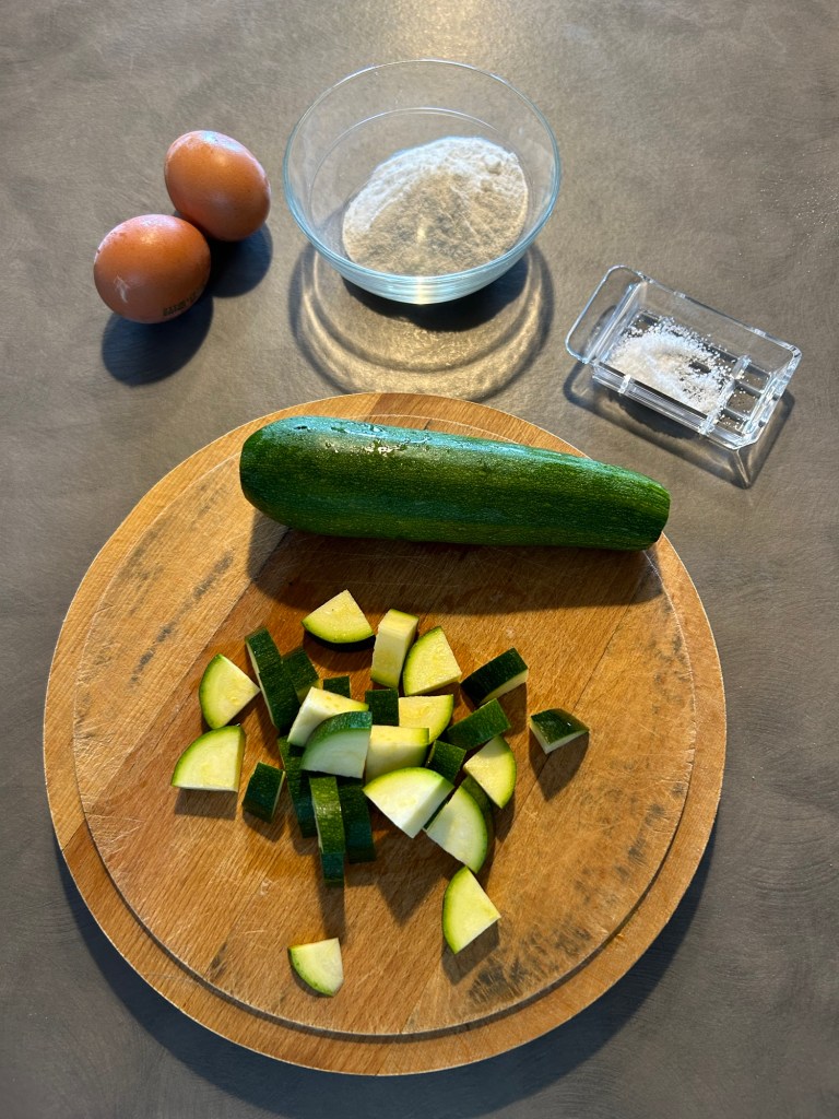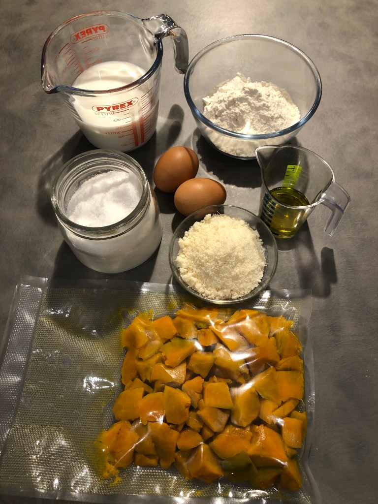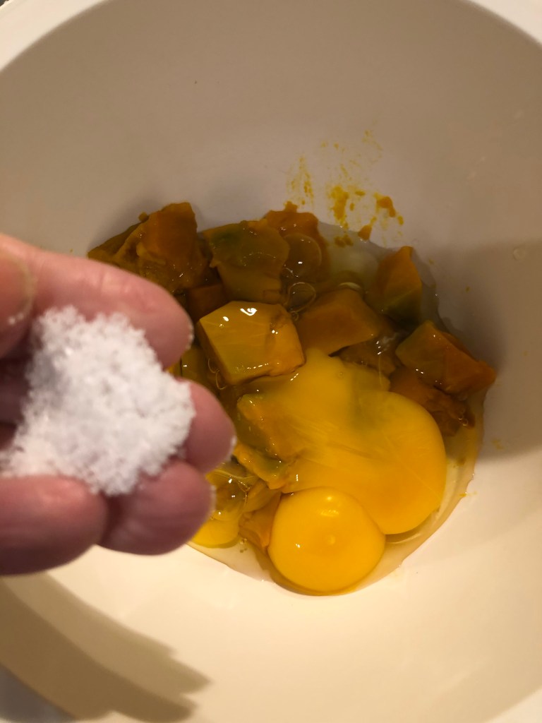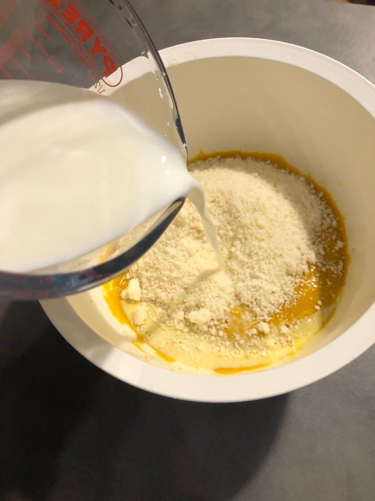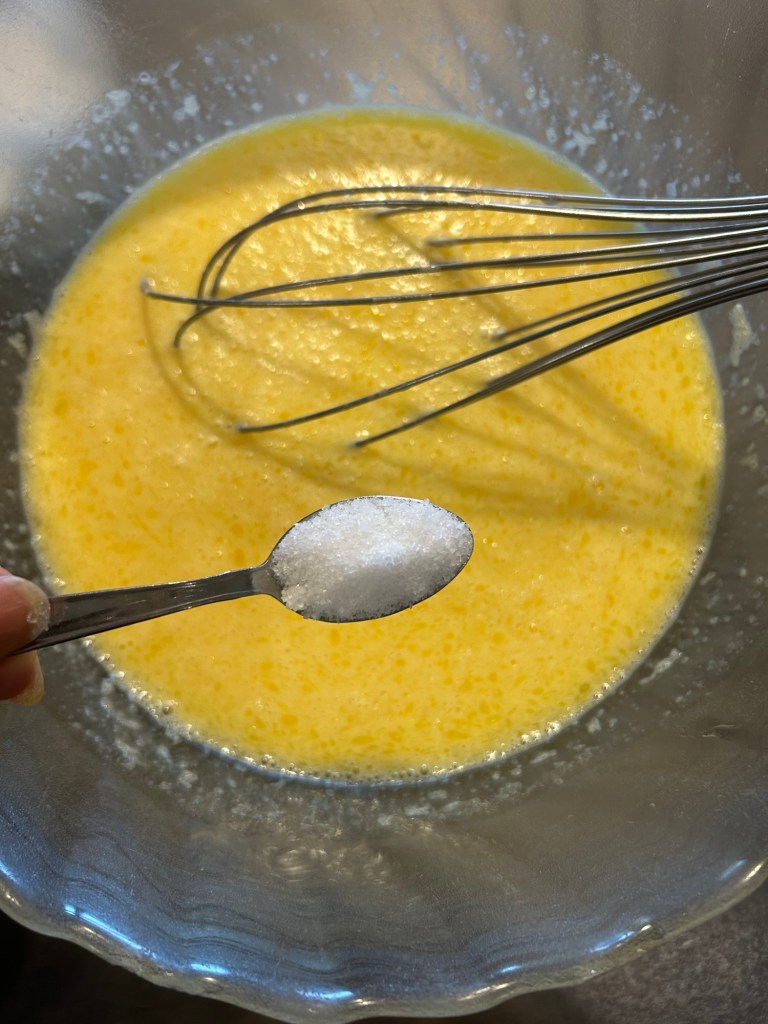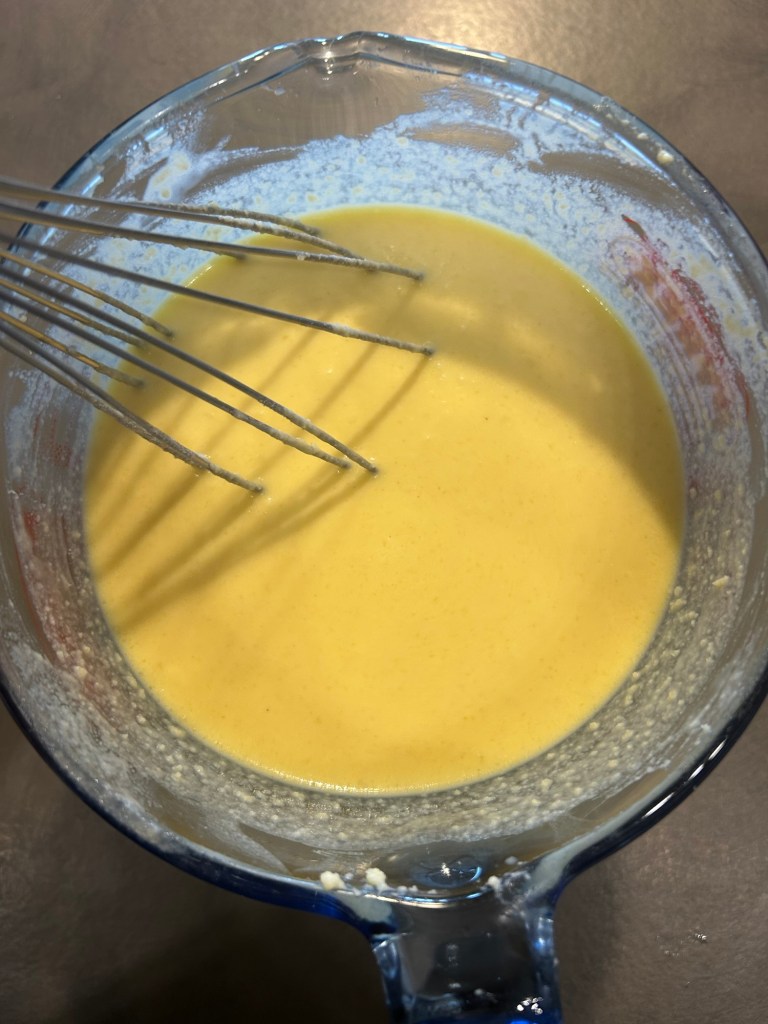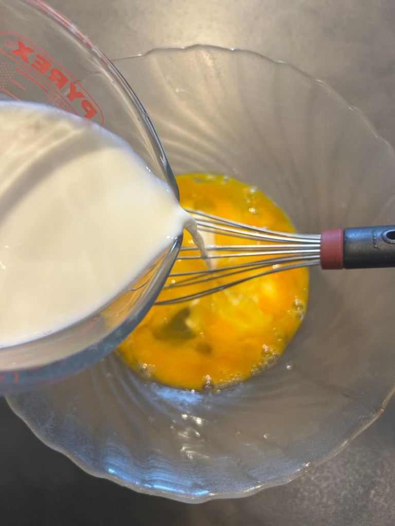 Sciolgo il burro a microonde e lo lascio intiepidire, in una ciotola rompo le uova, le batto con una frusta e aggiungo il latte