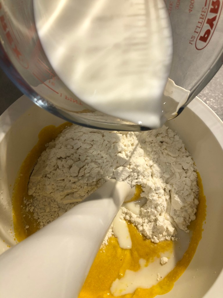 Verso la farina poca per volta continuando a mescolare per evitare grumi