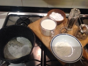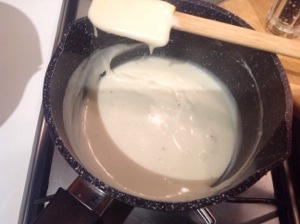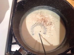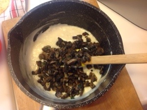 Quando il fondo di cottura è parzialmente evaporato aggiungo la besciamella che ho preparato nella maniera classica (vedi blog nelle basi)