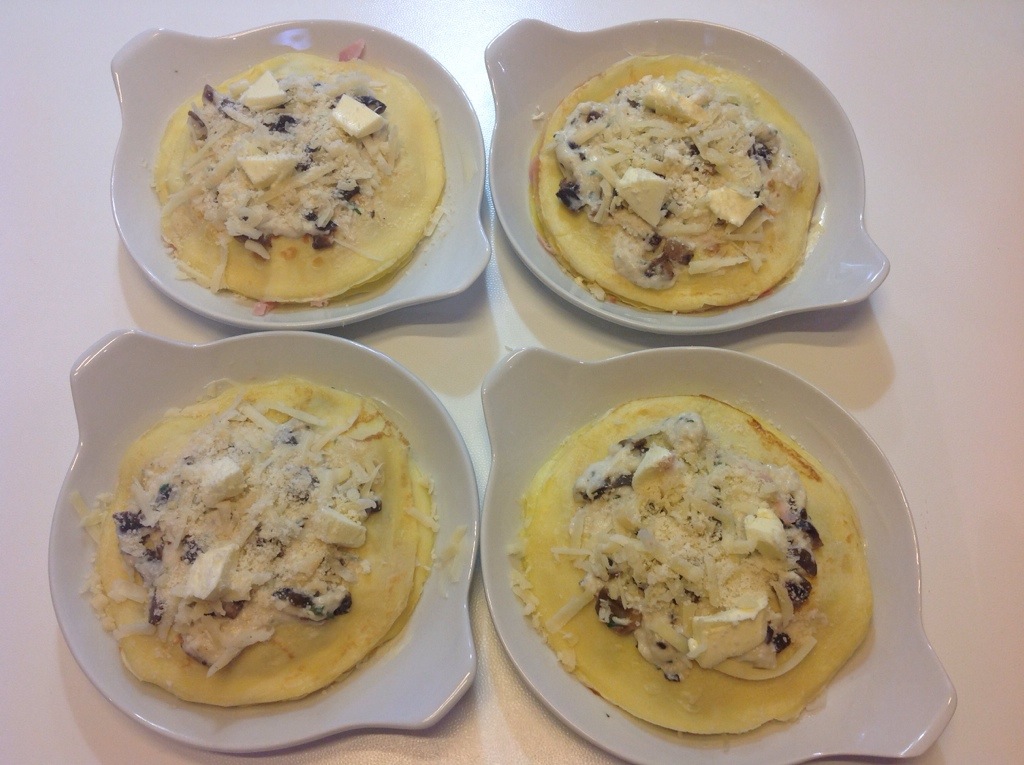 Imburro sei pirofiline da forno e metto sul fondo una crespella e distribuisco un po’ di ripieno, copro con un’altra crespella