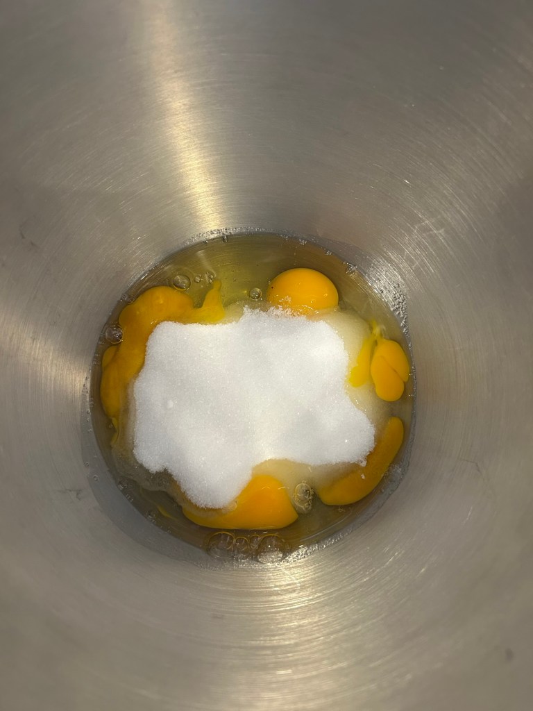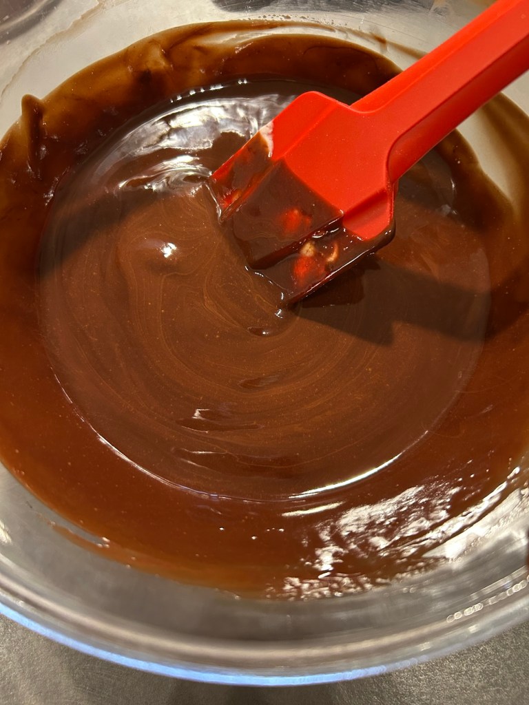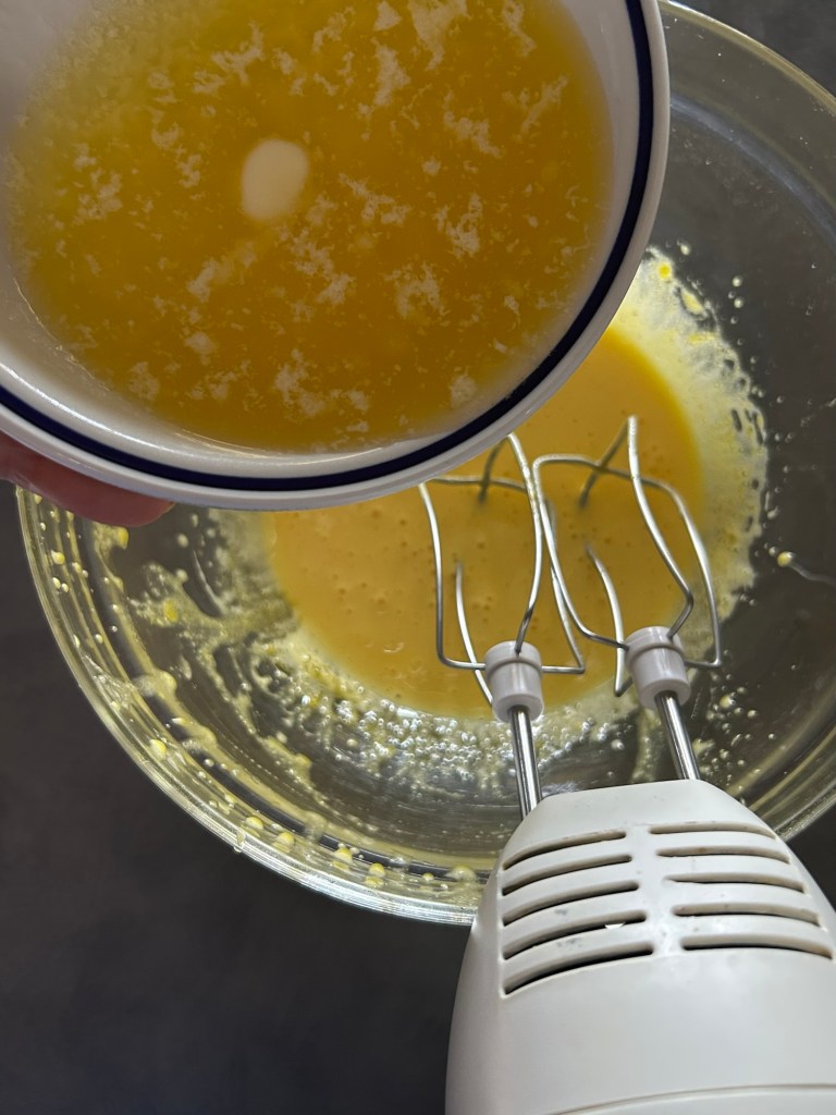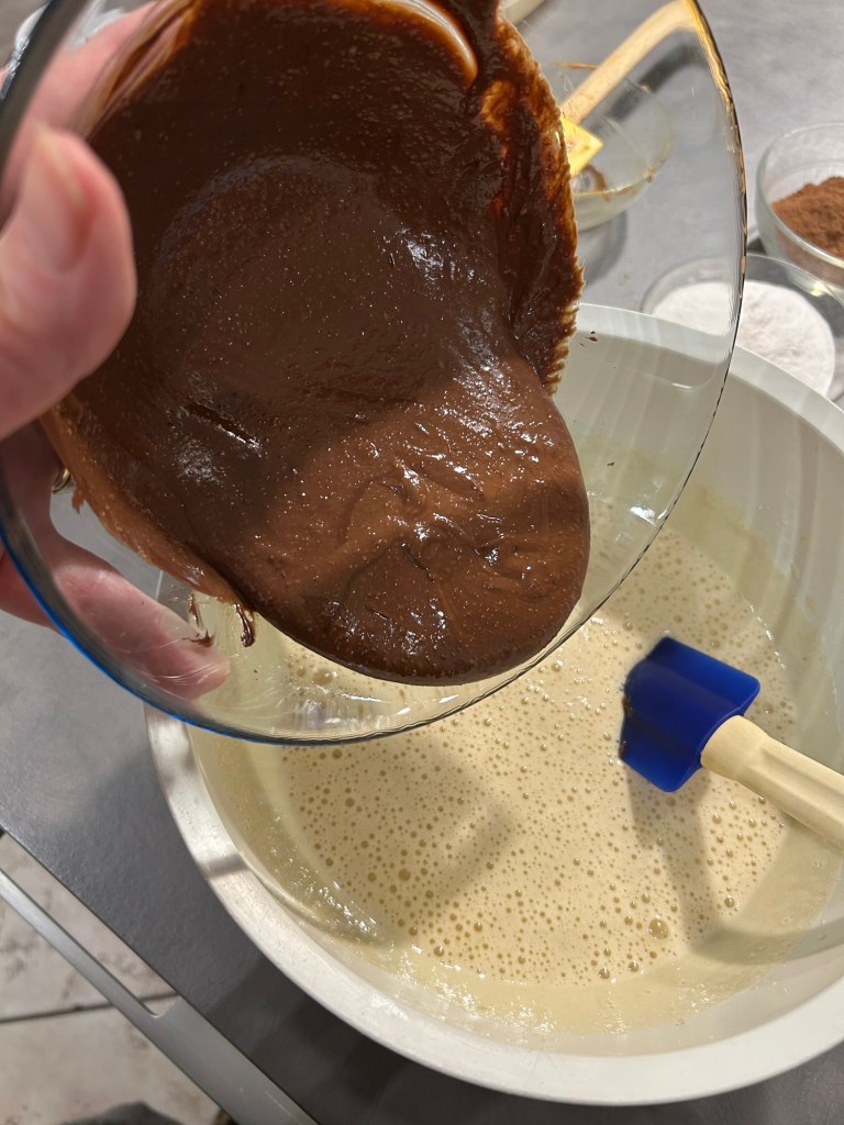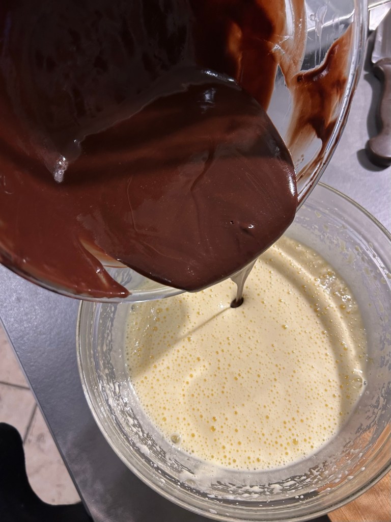 Aggiungo il cioccolato fuso alle uova e mescolo con la frusta a mano